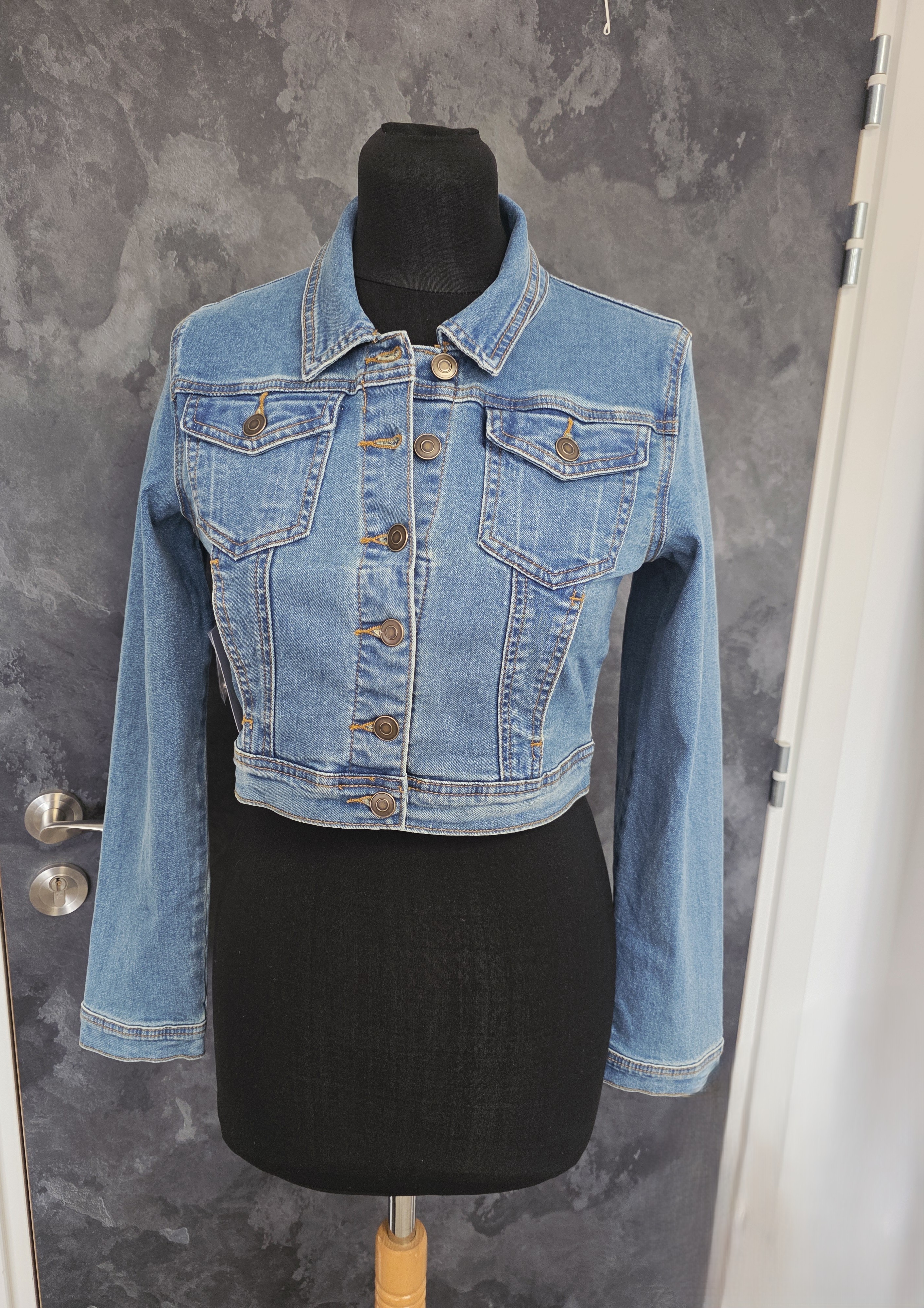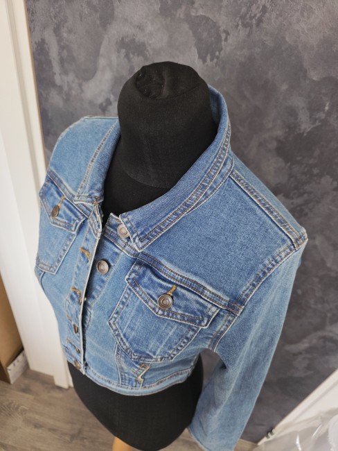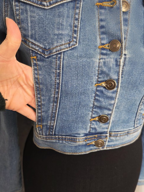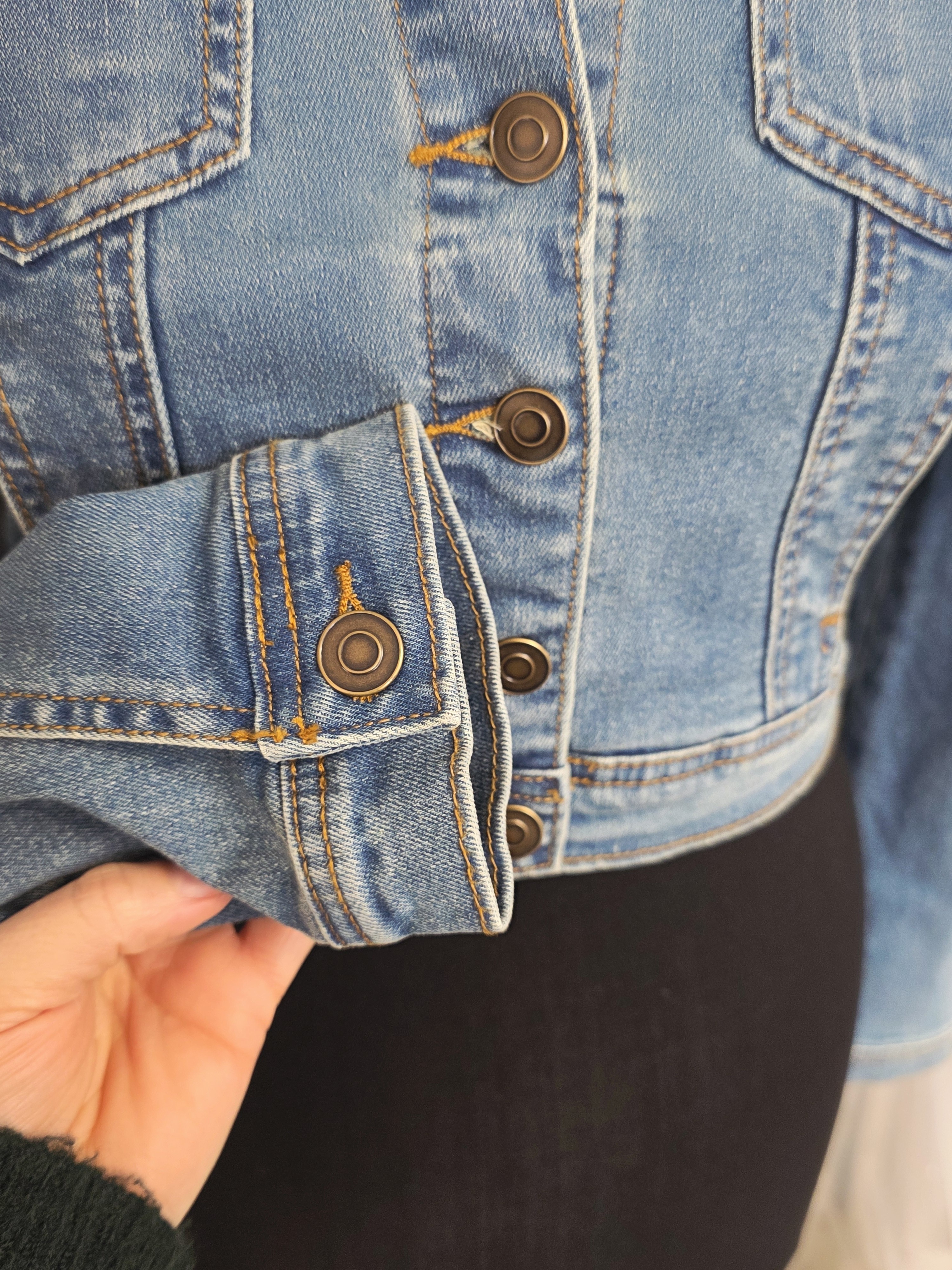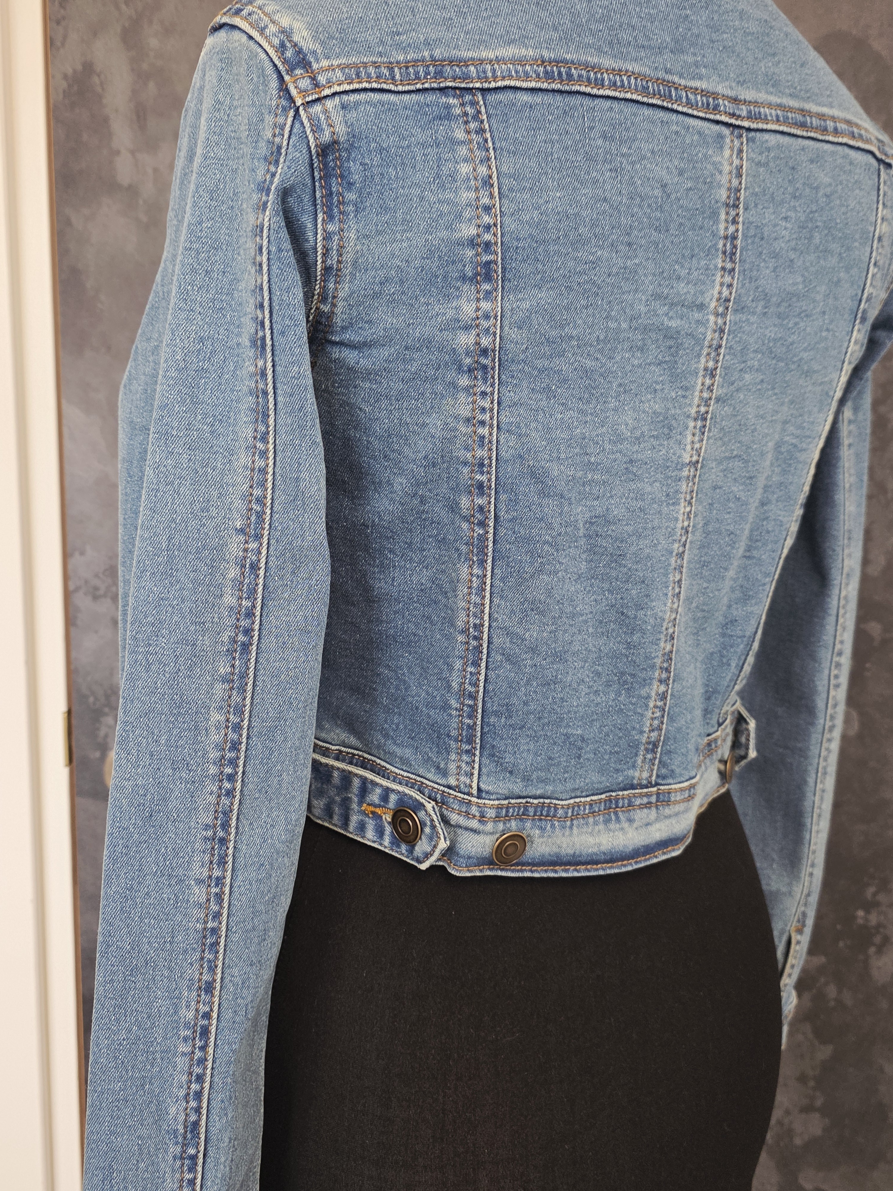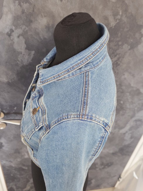Veste en jean pour mariée (plus courte qu'une veste en jean classique pour ne pas cacher la robe)