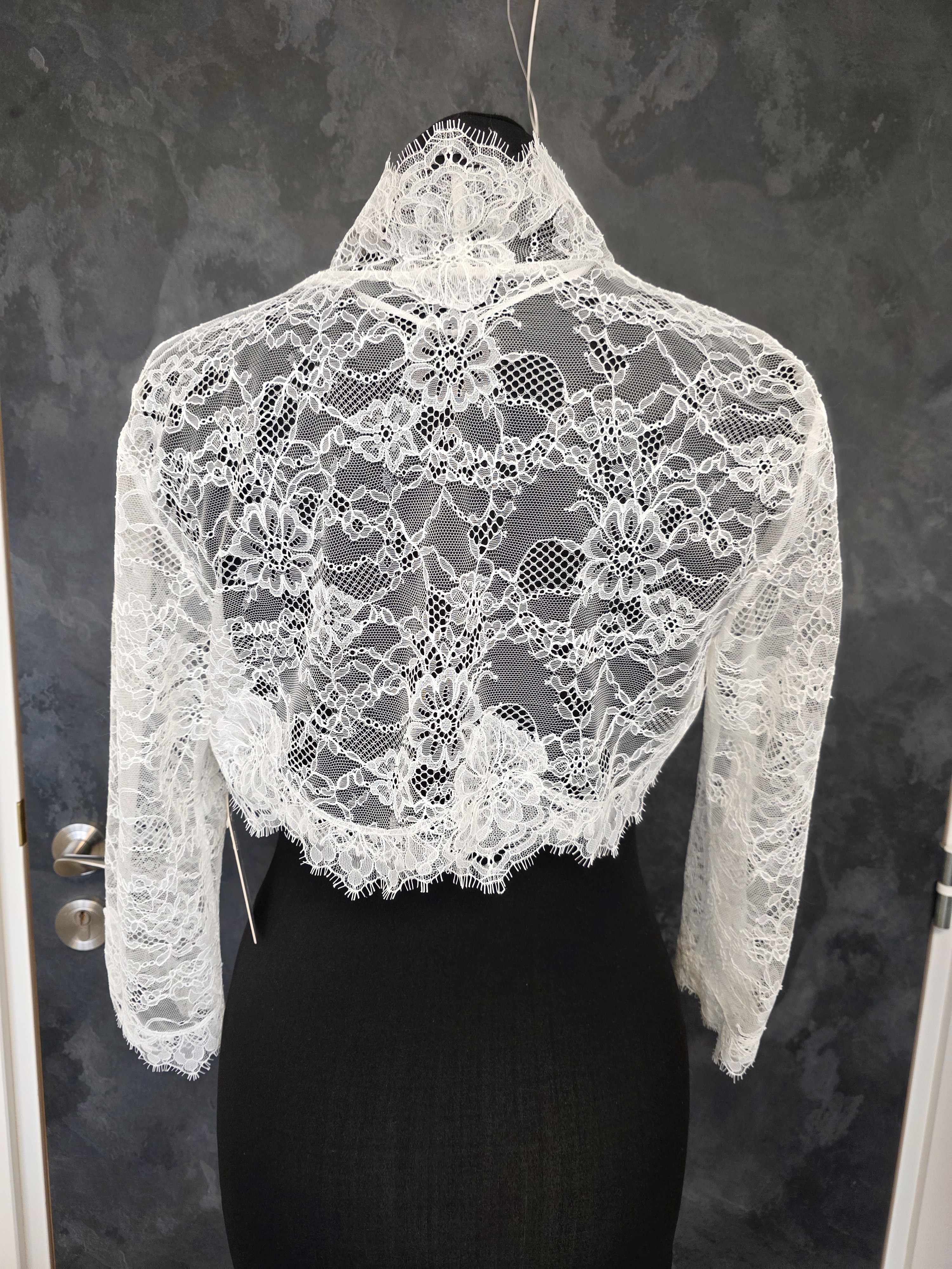 Les manches longues transparentes soulignent la silhouette avec légèreté, tandis que la coupe courte permet de sublimer une robe bustier ou à fines bretelles.