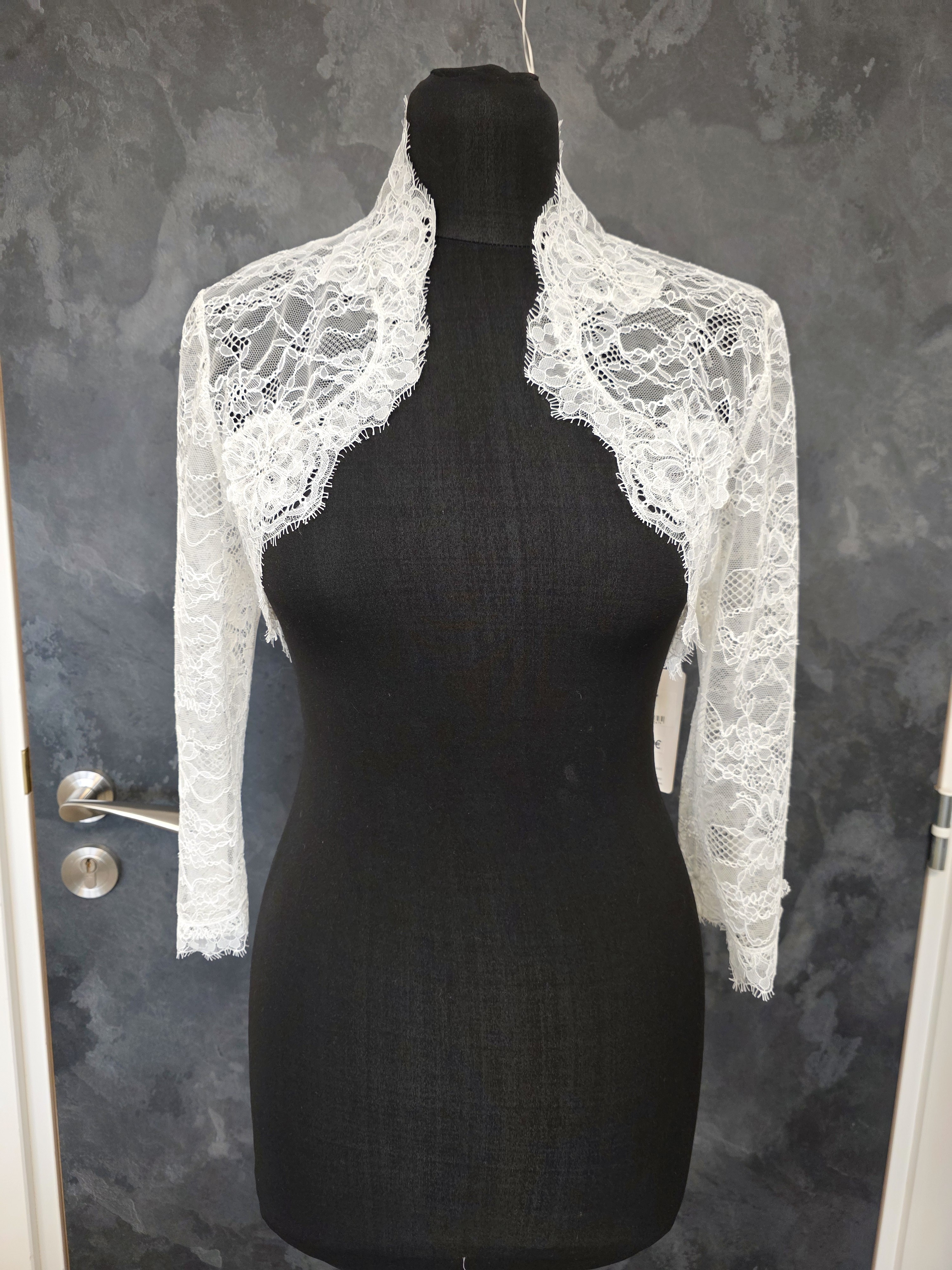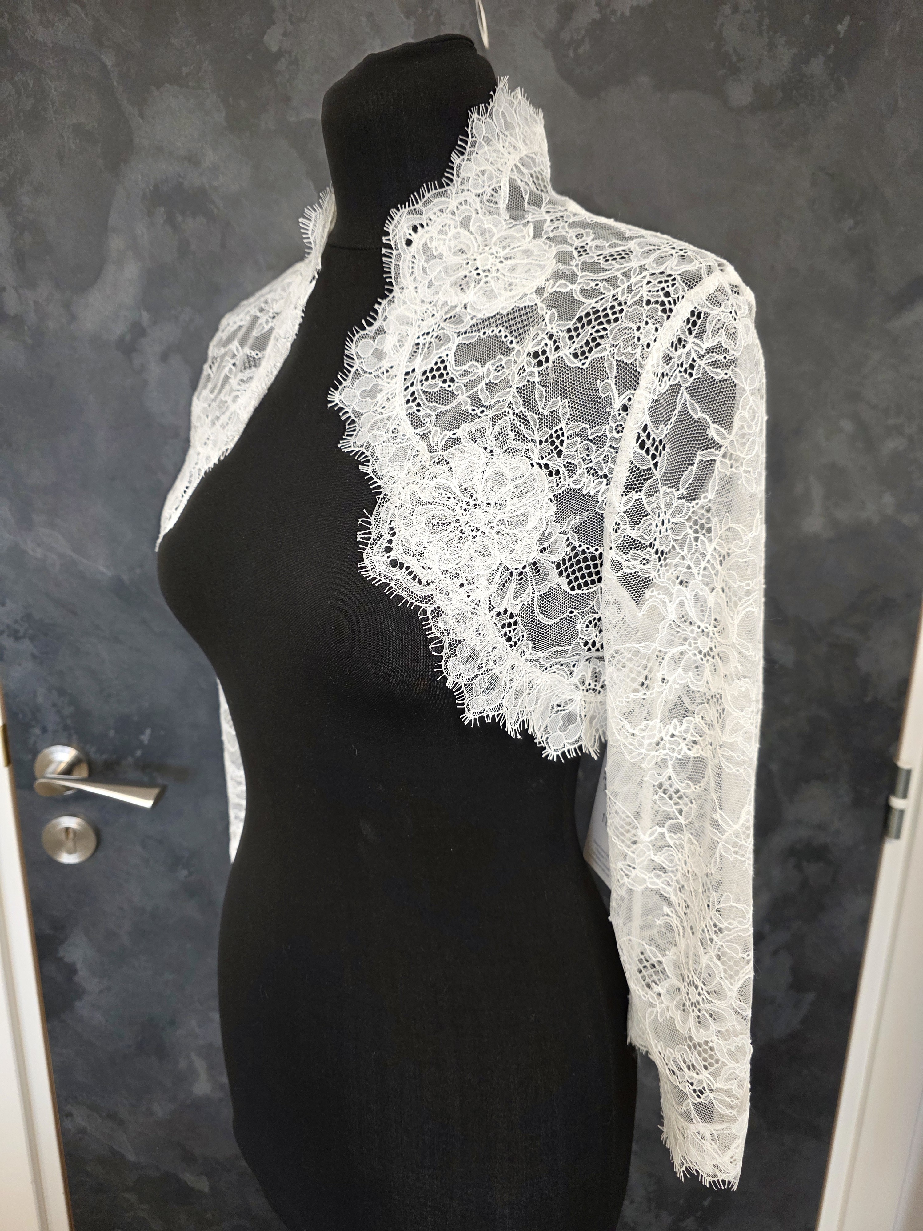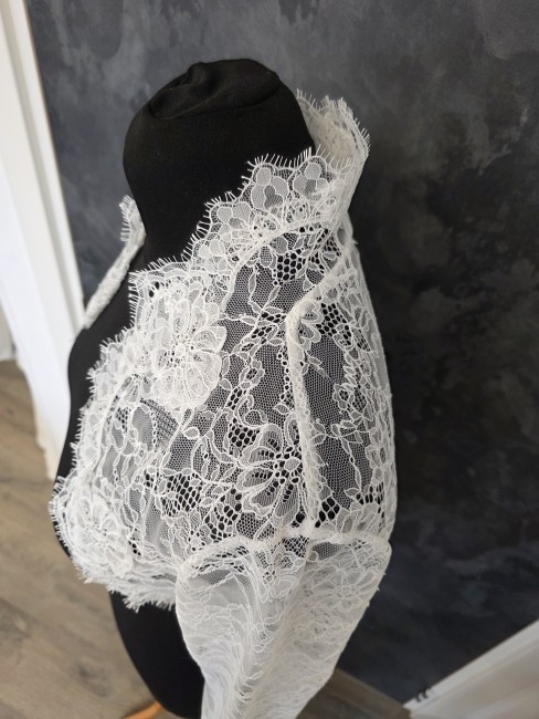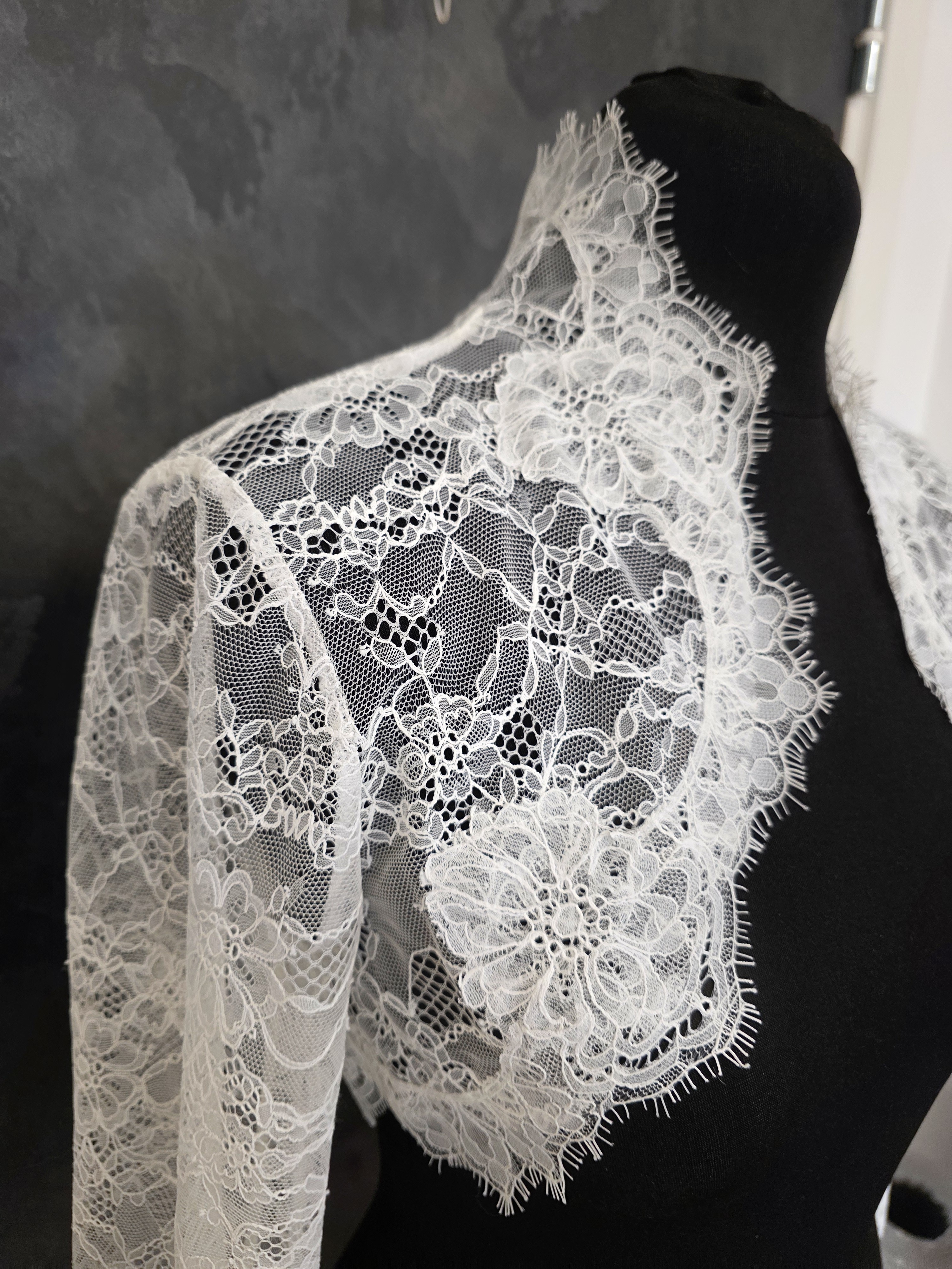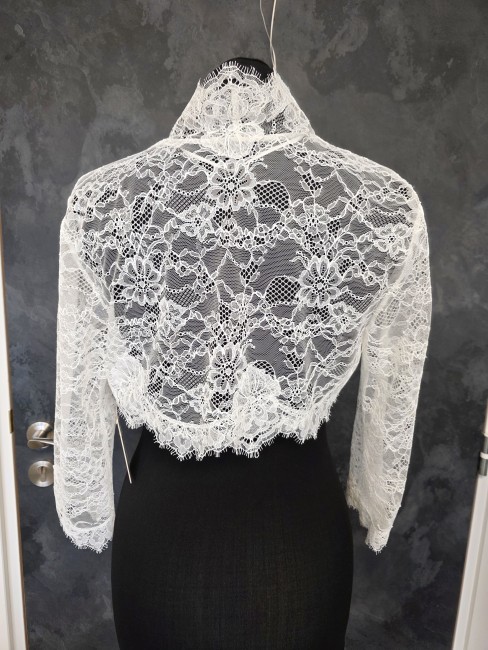 Boléro de mariée en dentelle fine ivoire clair, délicatement travaillé avec de larges motifs floraux en relief.