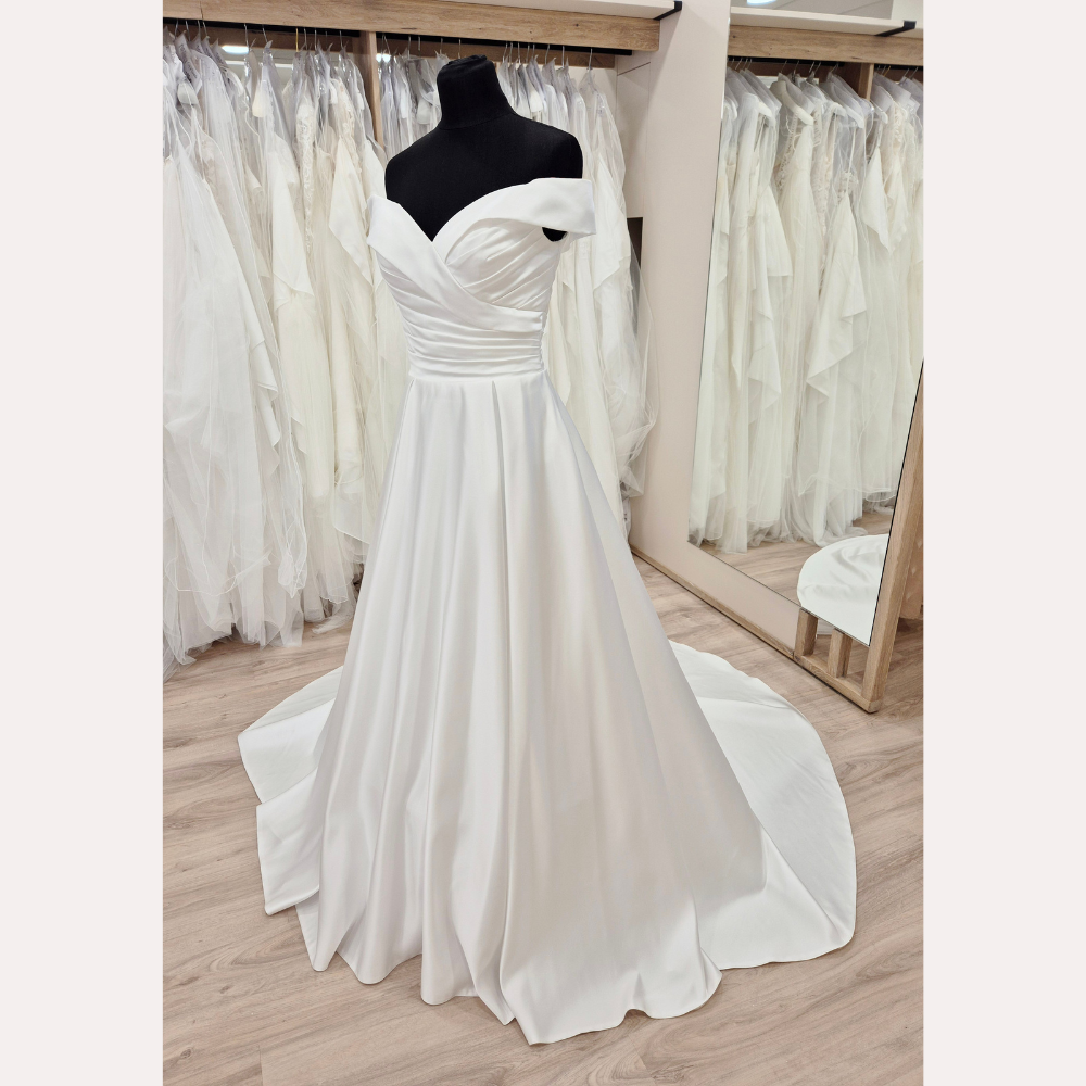 Cette élégante robe de mariée en satin ivoire clair sublime la silhouette grâce à sa forme bustier princesse trapèze petit volume, pour une allure romantique, féminine et moderne.