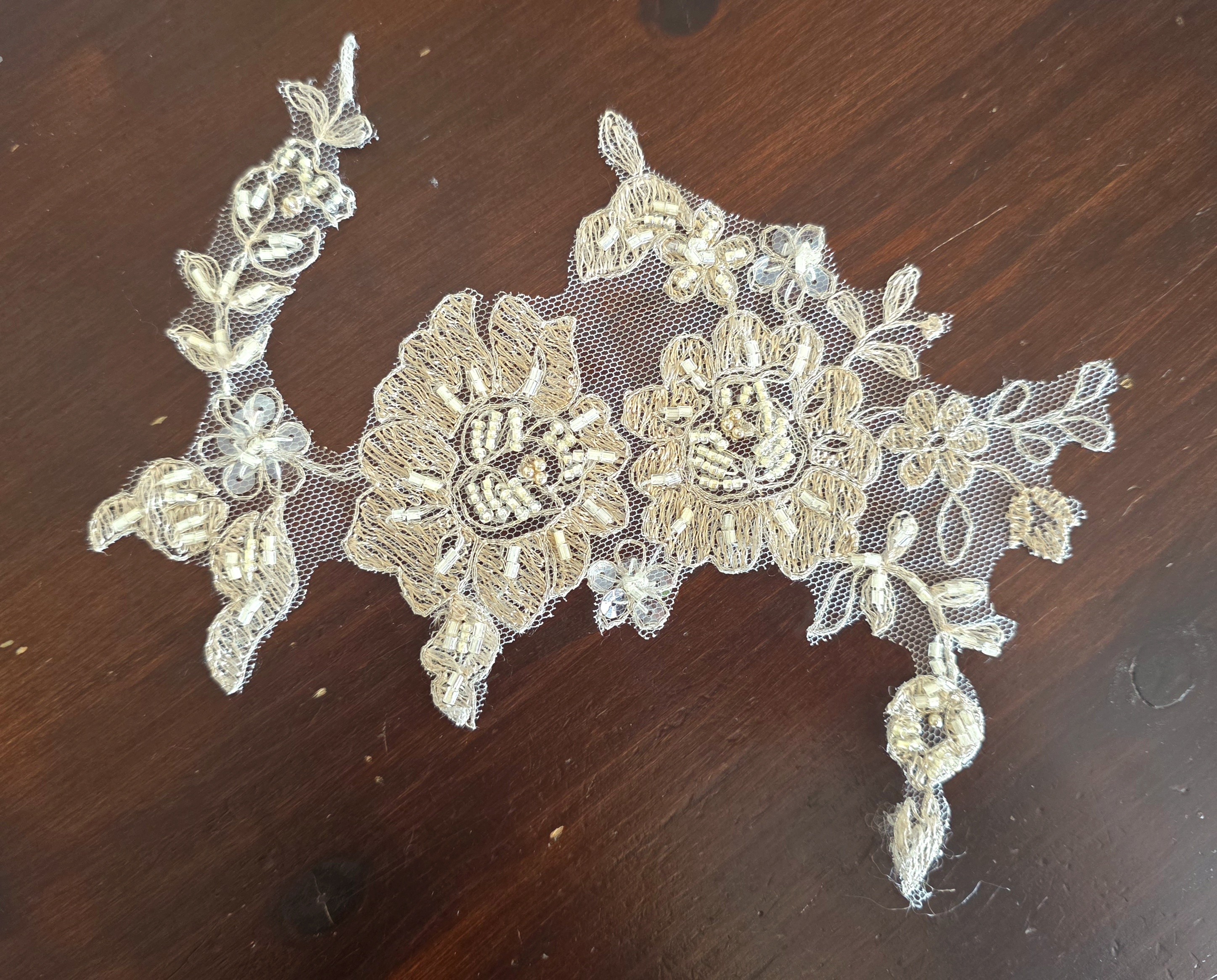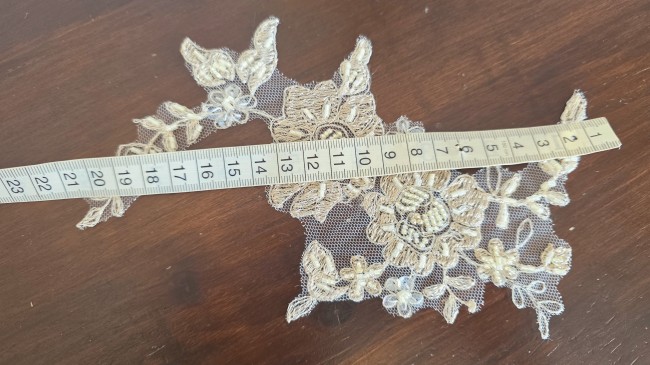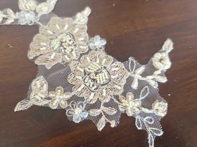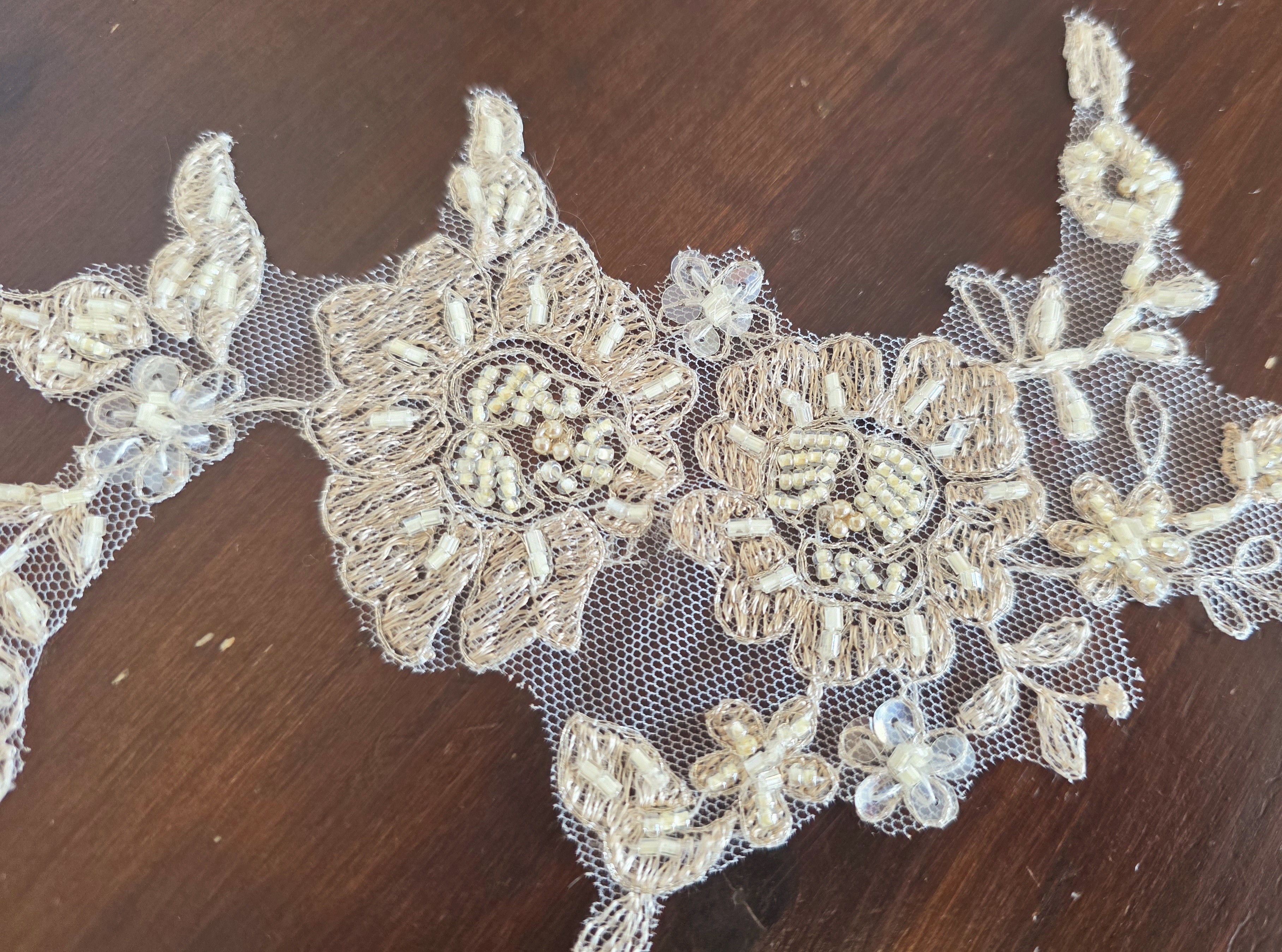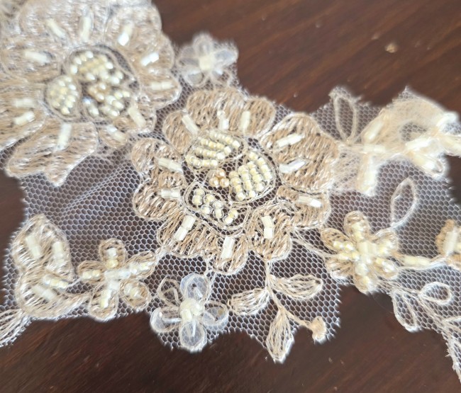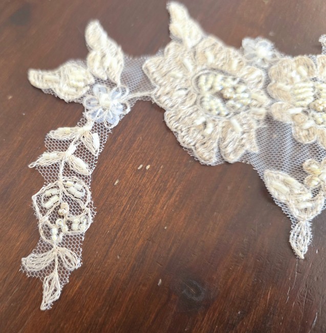 Fournitures pour coudre une robe de mariée. Dentelle, tissus, appliqués, galons, boutons. Robes et accessoires pour la mariée.