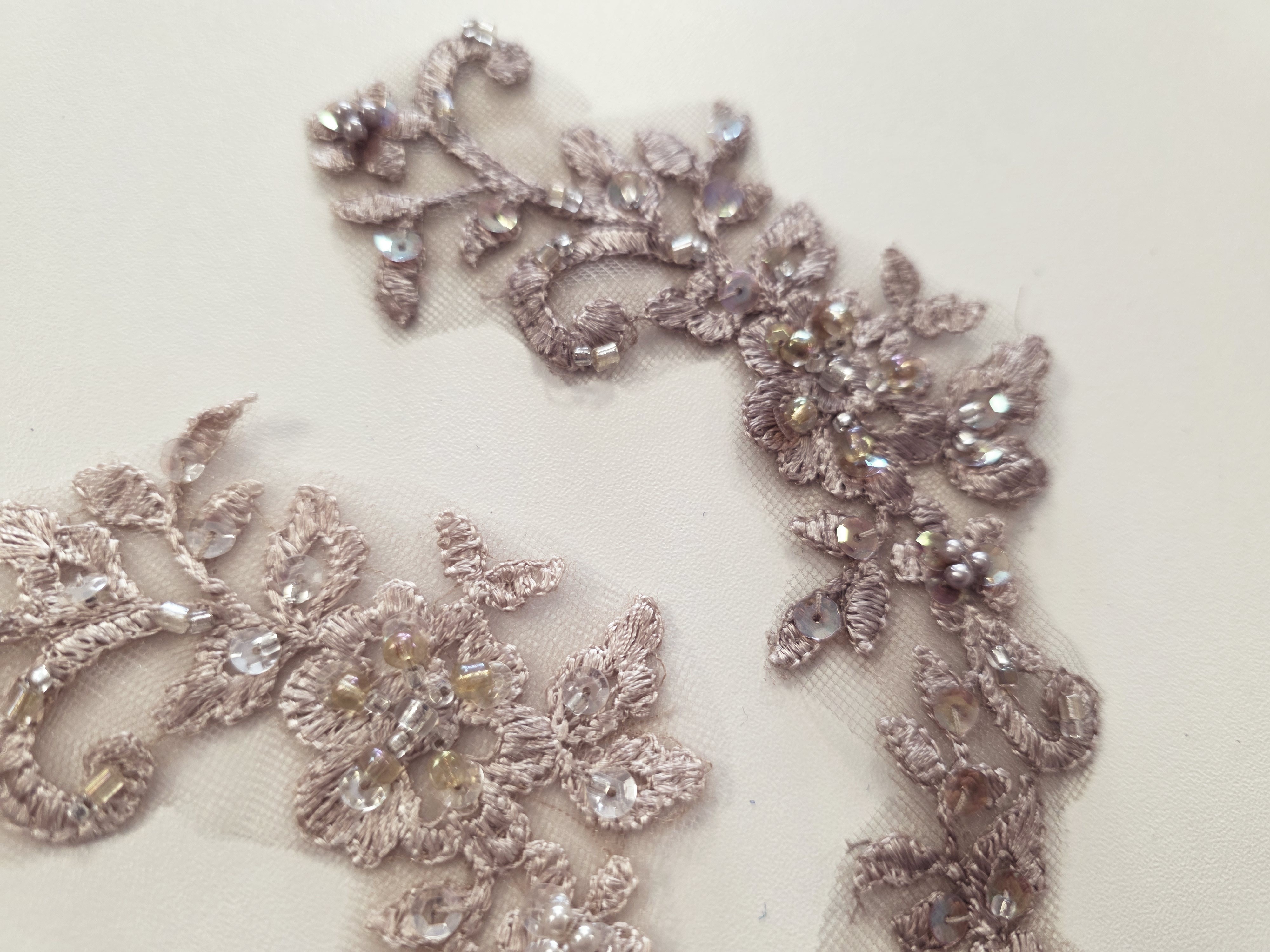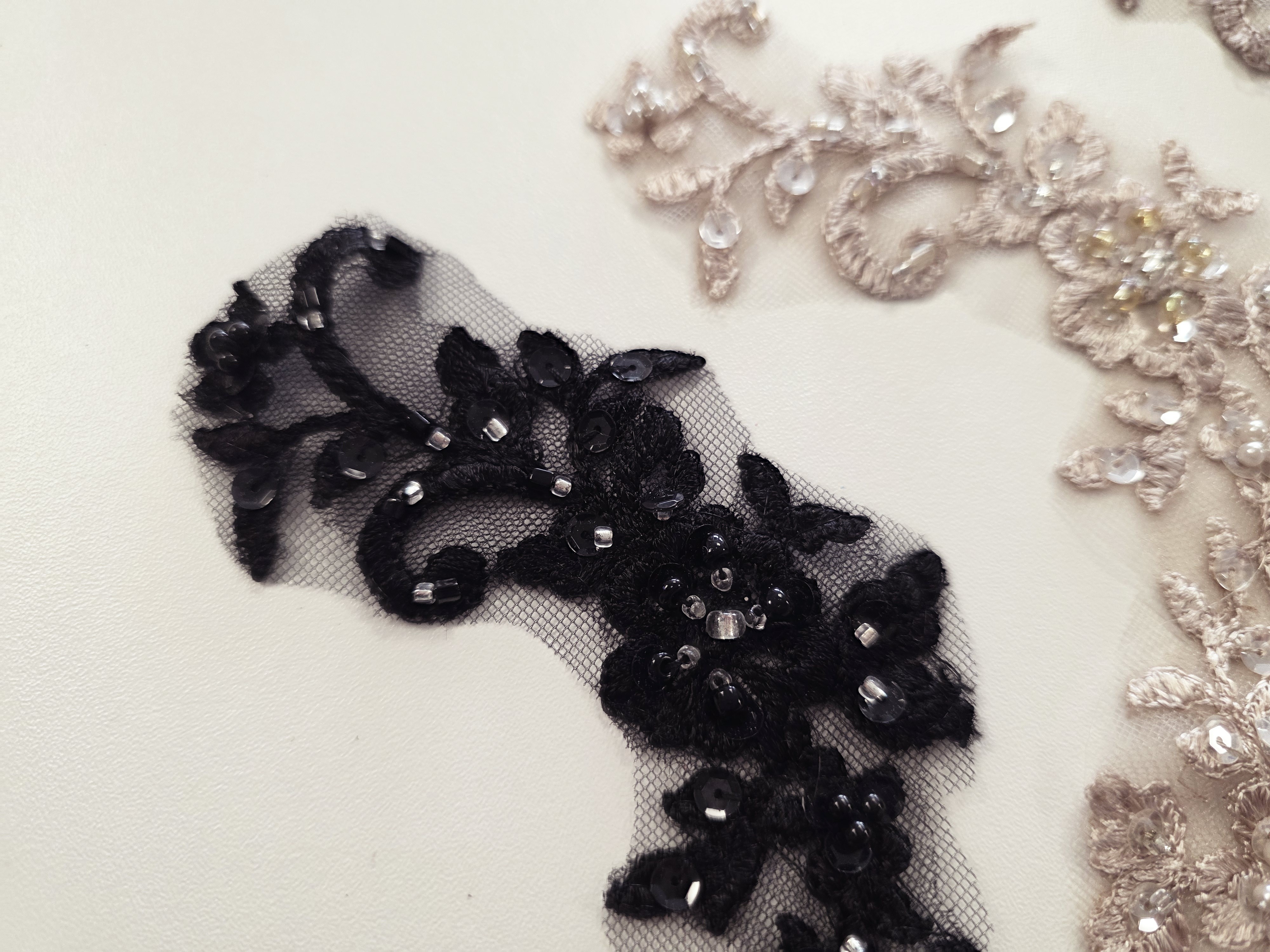 Fournitures pour coudre une robe de mariée. Dentelle, tissus, appliqués, galons, boutons. Robes et accessoires pour la mariée.