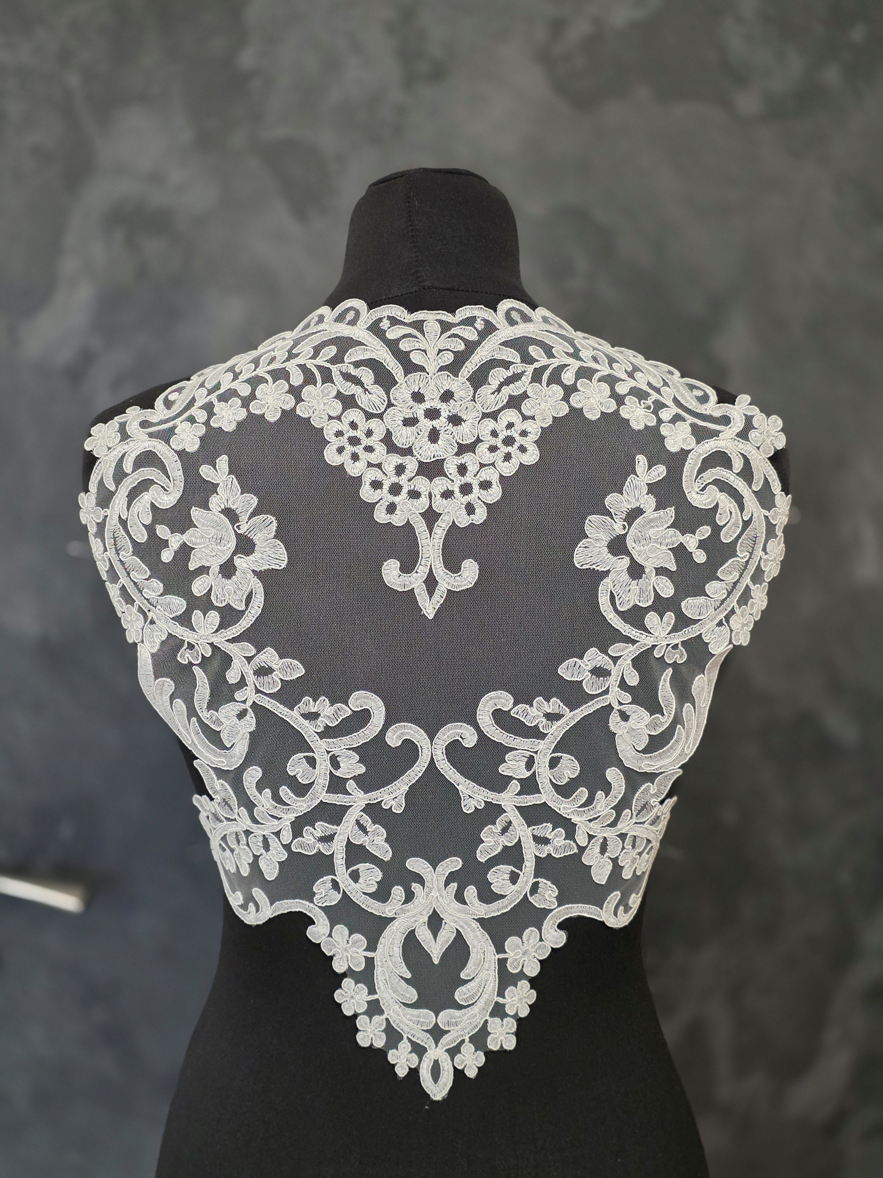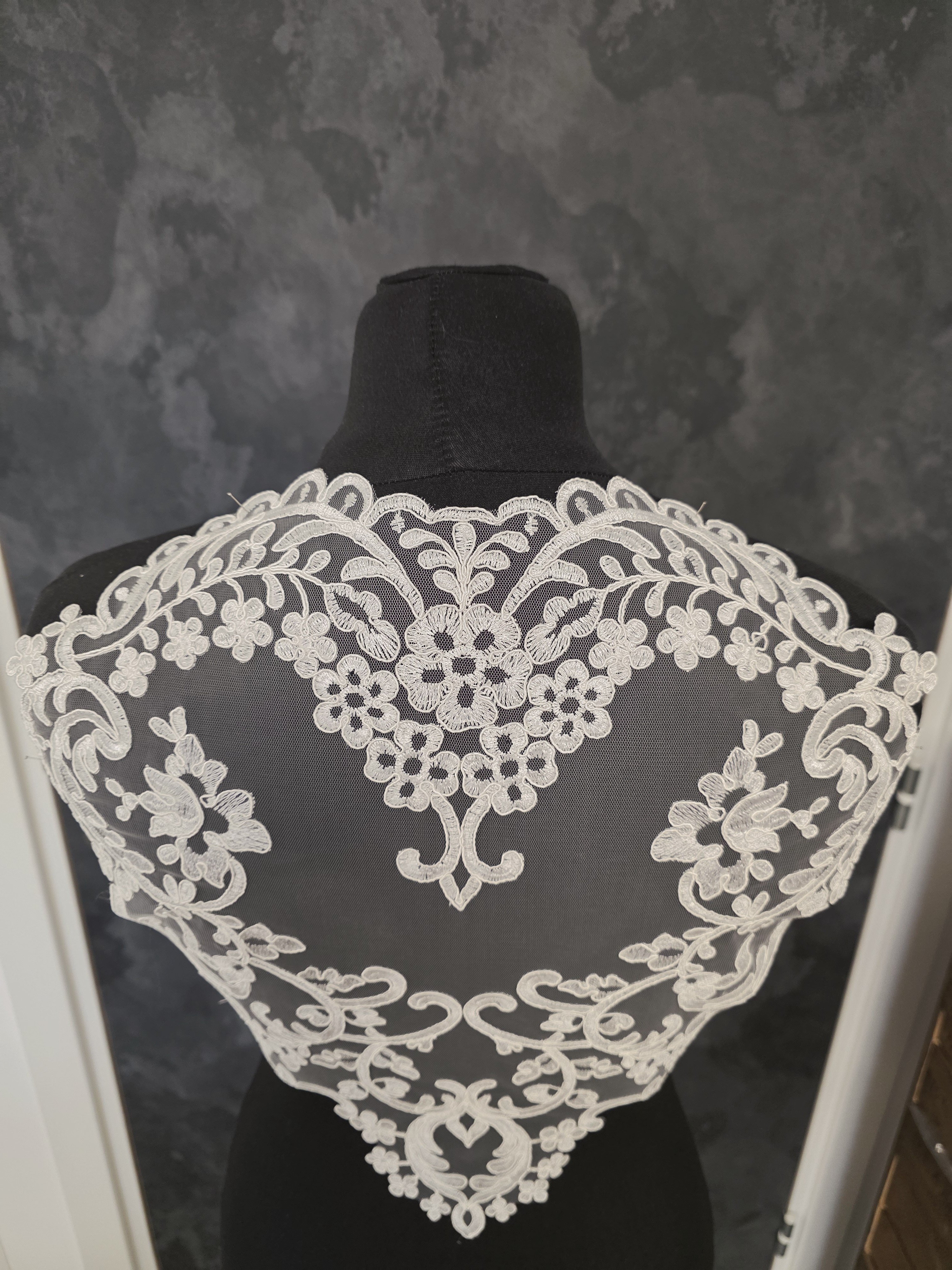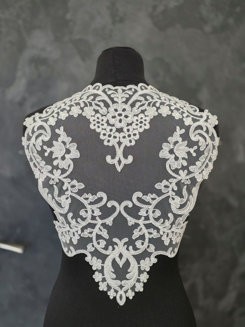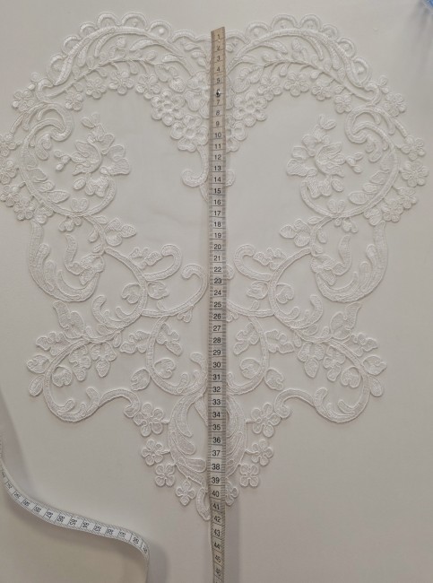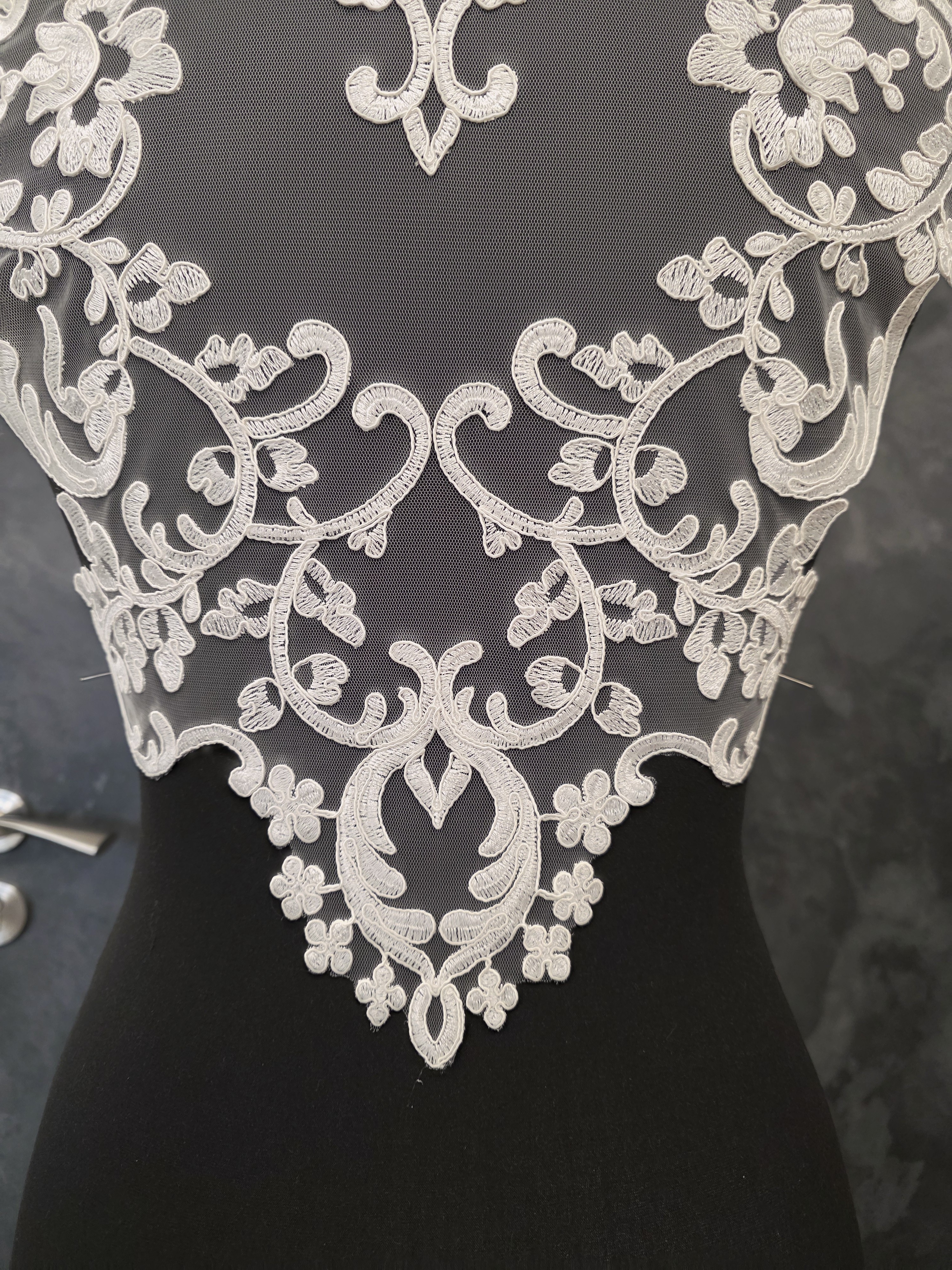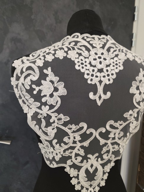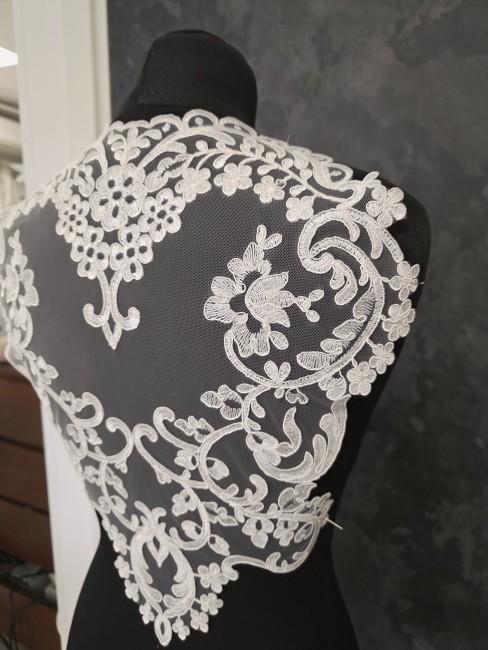 Fournitures pour coudre une robe de mariée. Dentelle, tissus, appliqués, galons, boutons. Robes et accessoires pour la mariée.