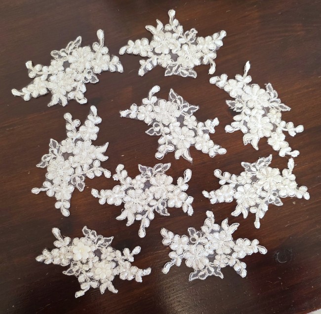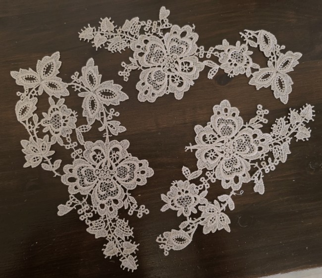 Fournitures pour coudre une robe de mariée. Dentelle, tissus, appliqués, galons, boutons. Robes et accessoires pour la mariée.