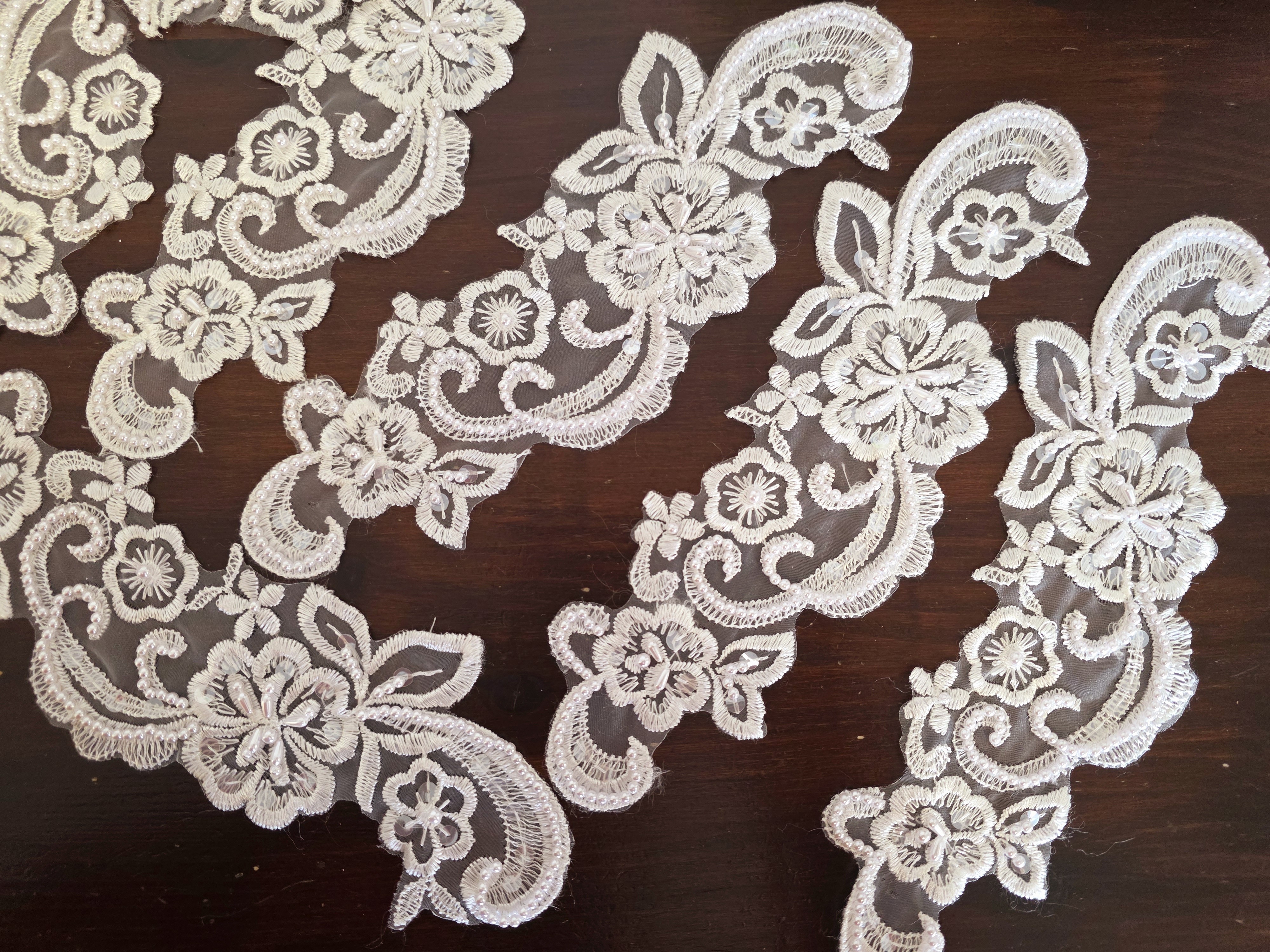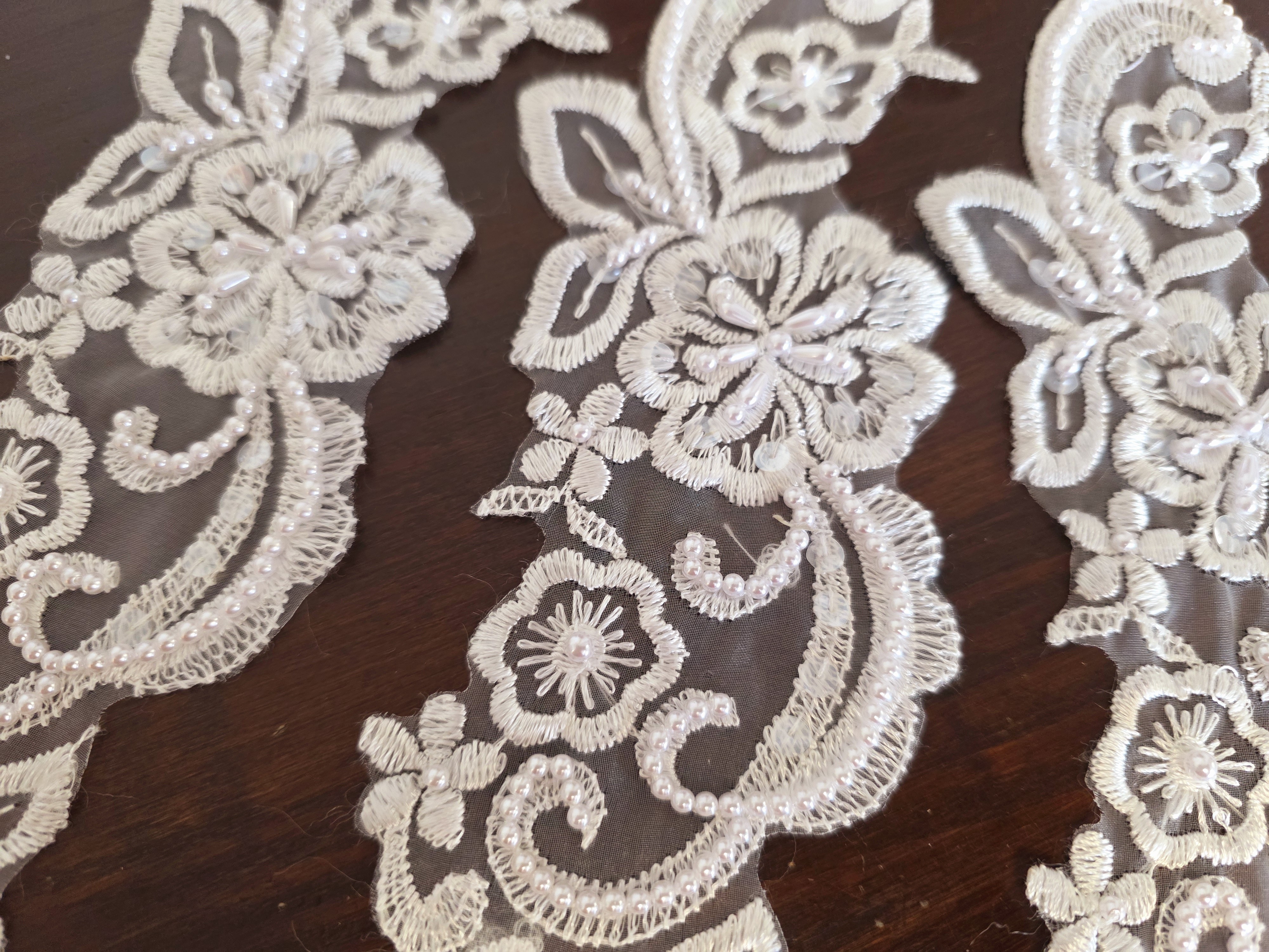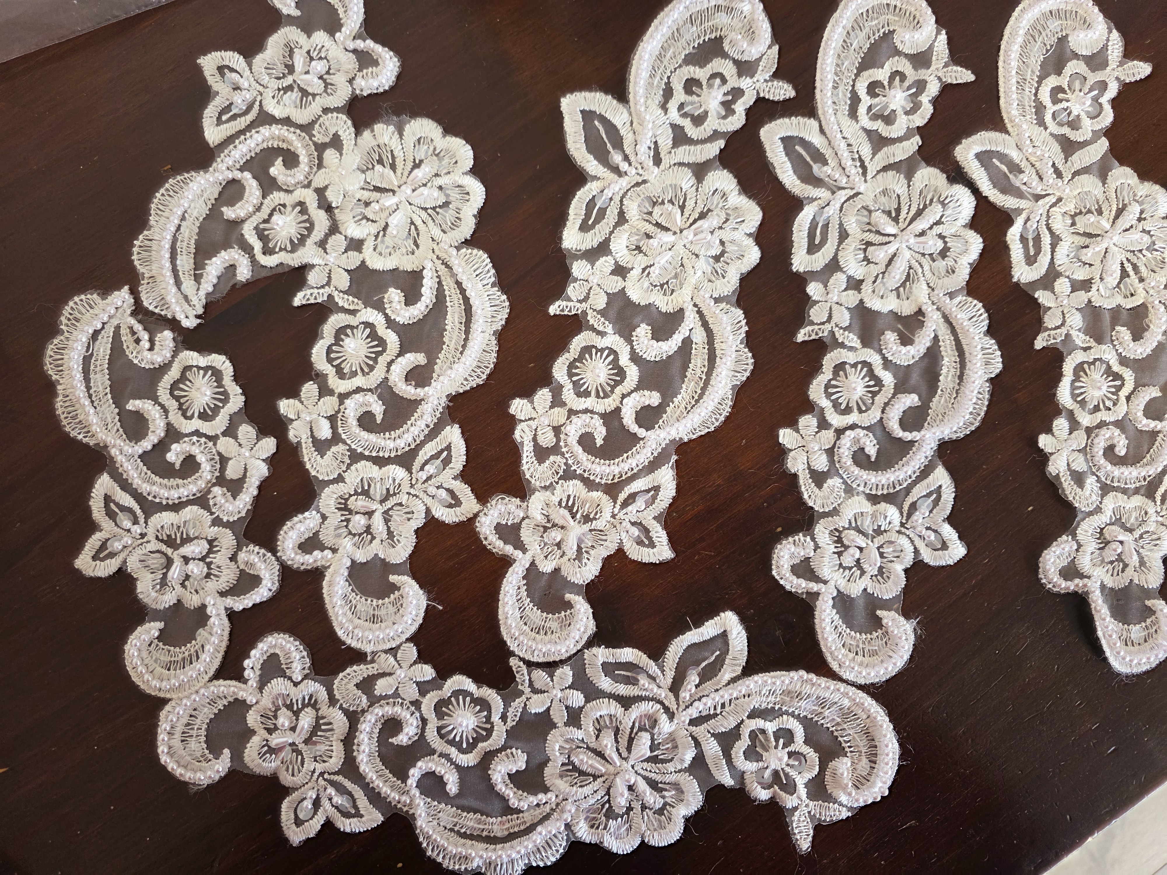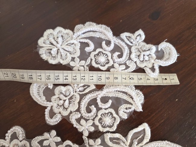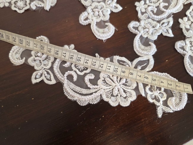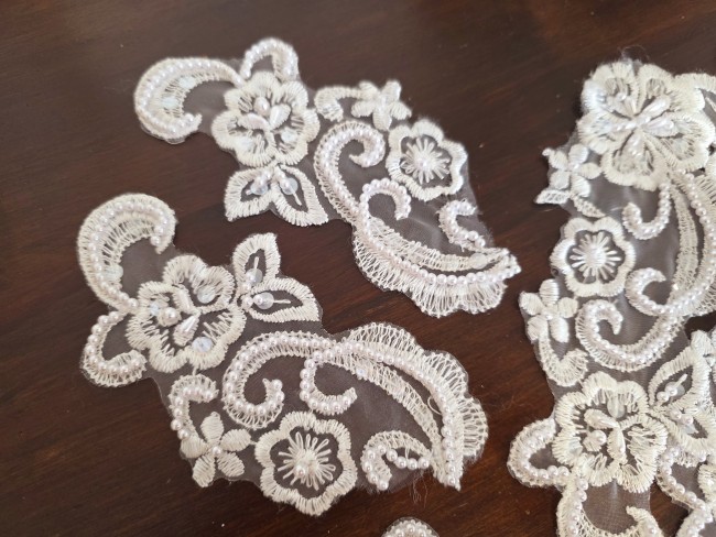 Fournitures pour coudre une robe de mariée. Dentelle, tissus, appliqués, galons, boutons. Robes et accessoires pour la mariée.