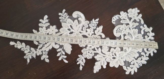 Fournitures pour coudre une robe de mariée. Dentelle, tissus, appliqués, galons, boutons. Robes et accessoires pour la mariée.