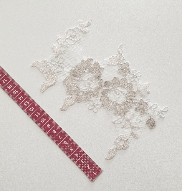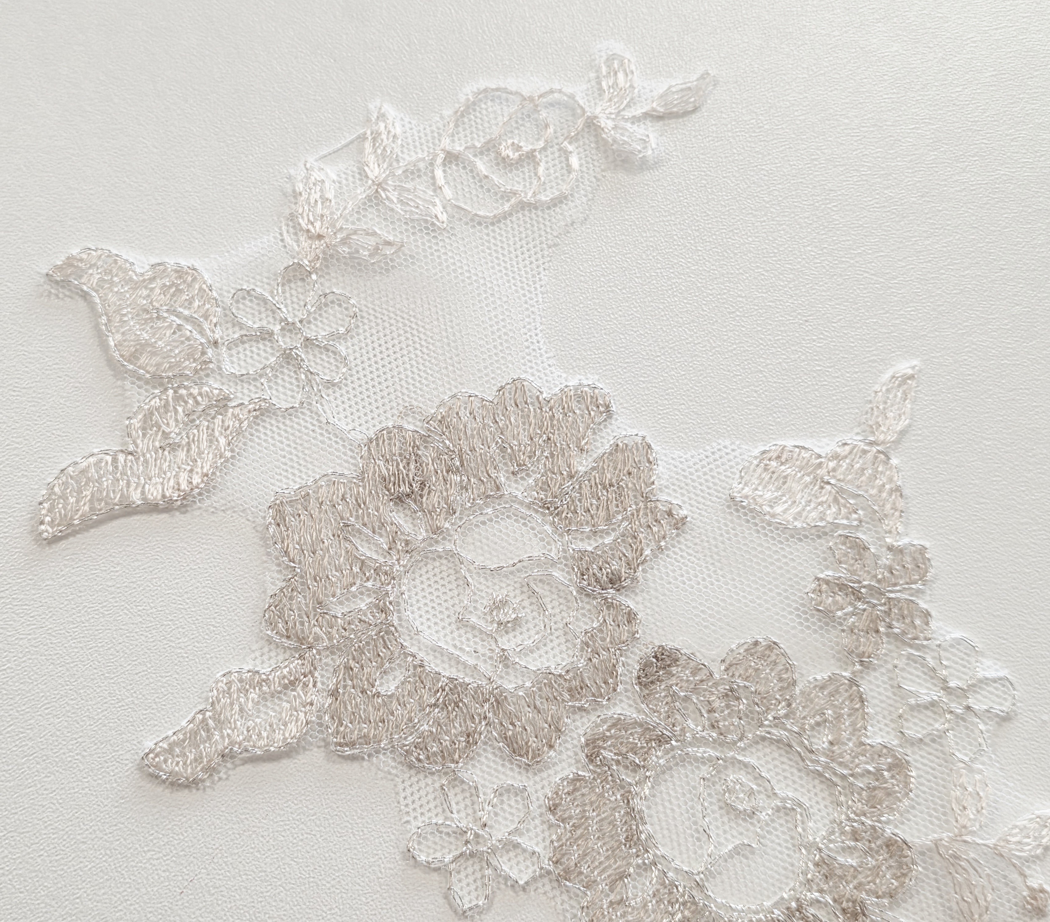 Fournitures pour coudre une robe de mariée. Dentelle, tissus, appliqués, galons, boutons. Robes et accessoires pour la mariée.