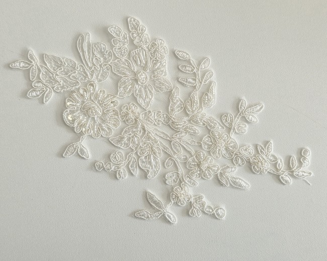 Fournitures pour coudre une robe de mariée. Dentelle, tissus, appliqués, galons, boutons. Robes et accessoires pour la mariée.