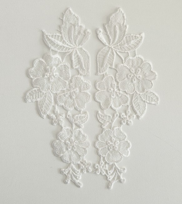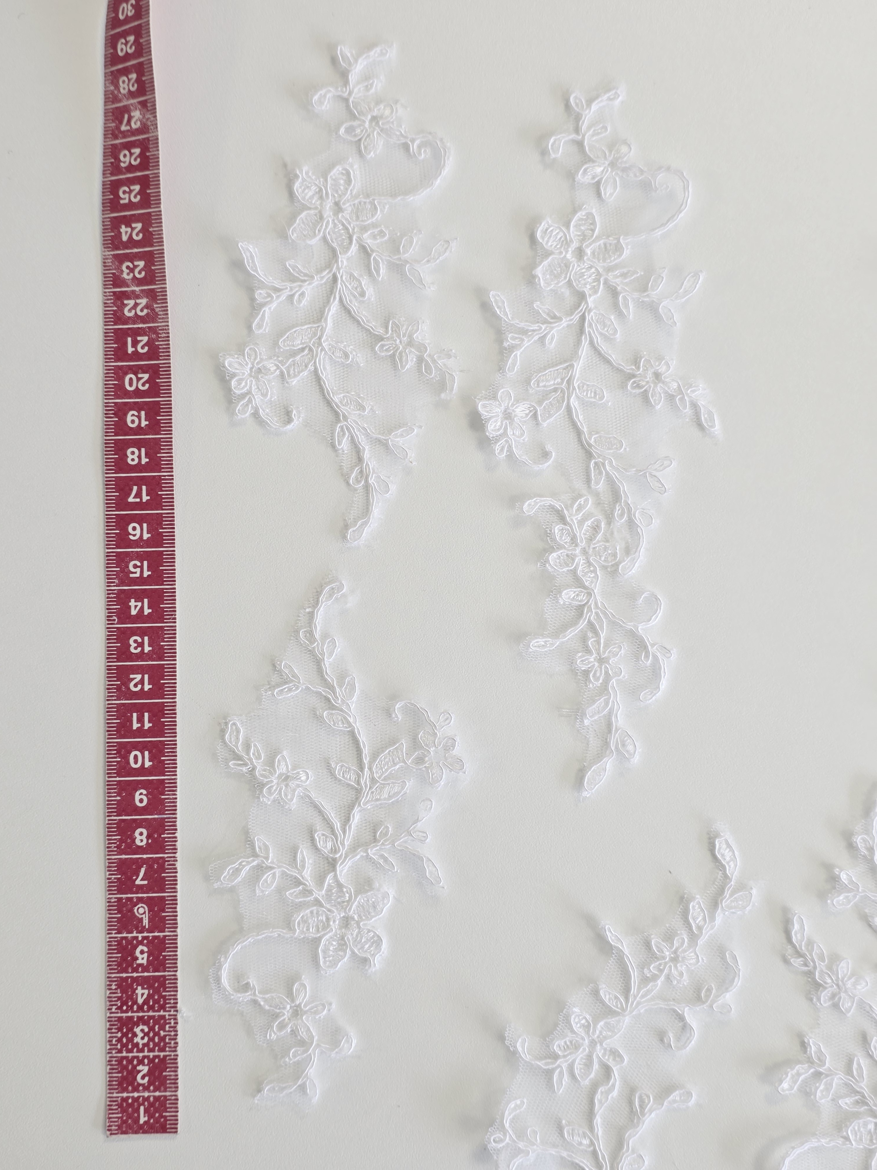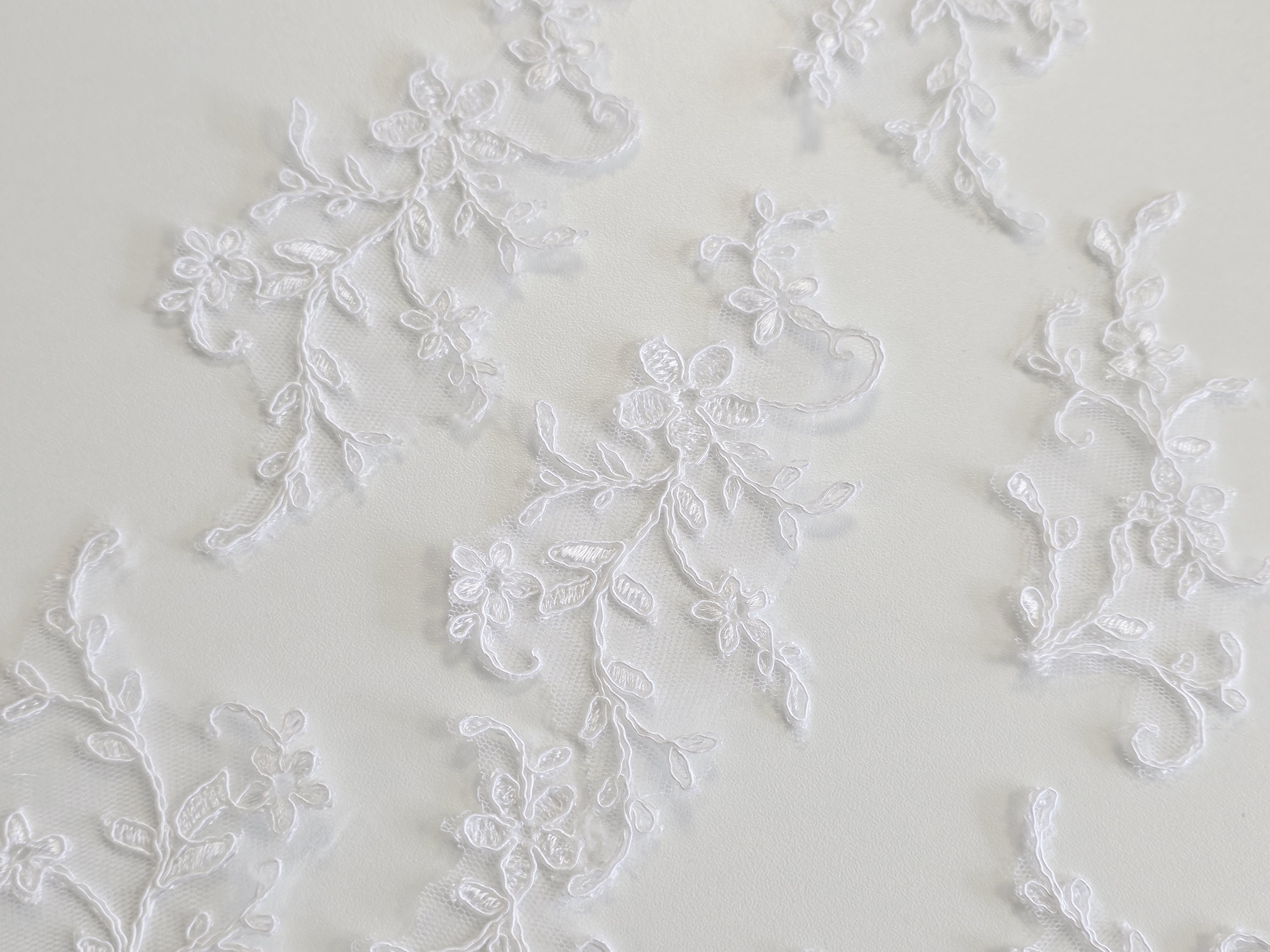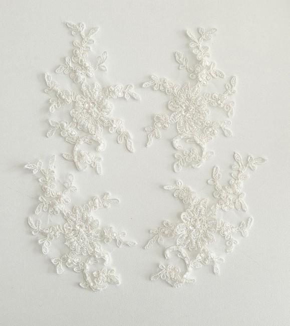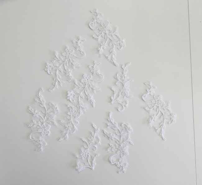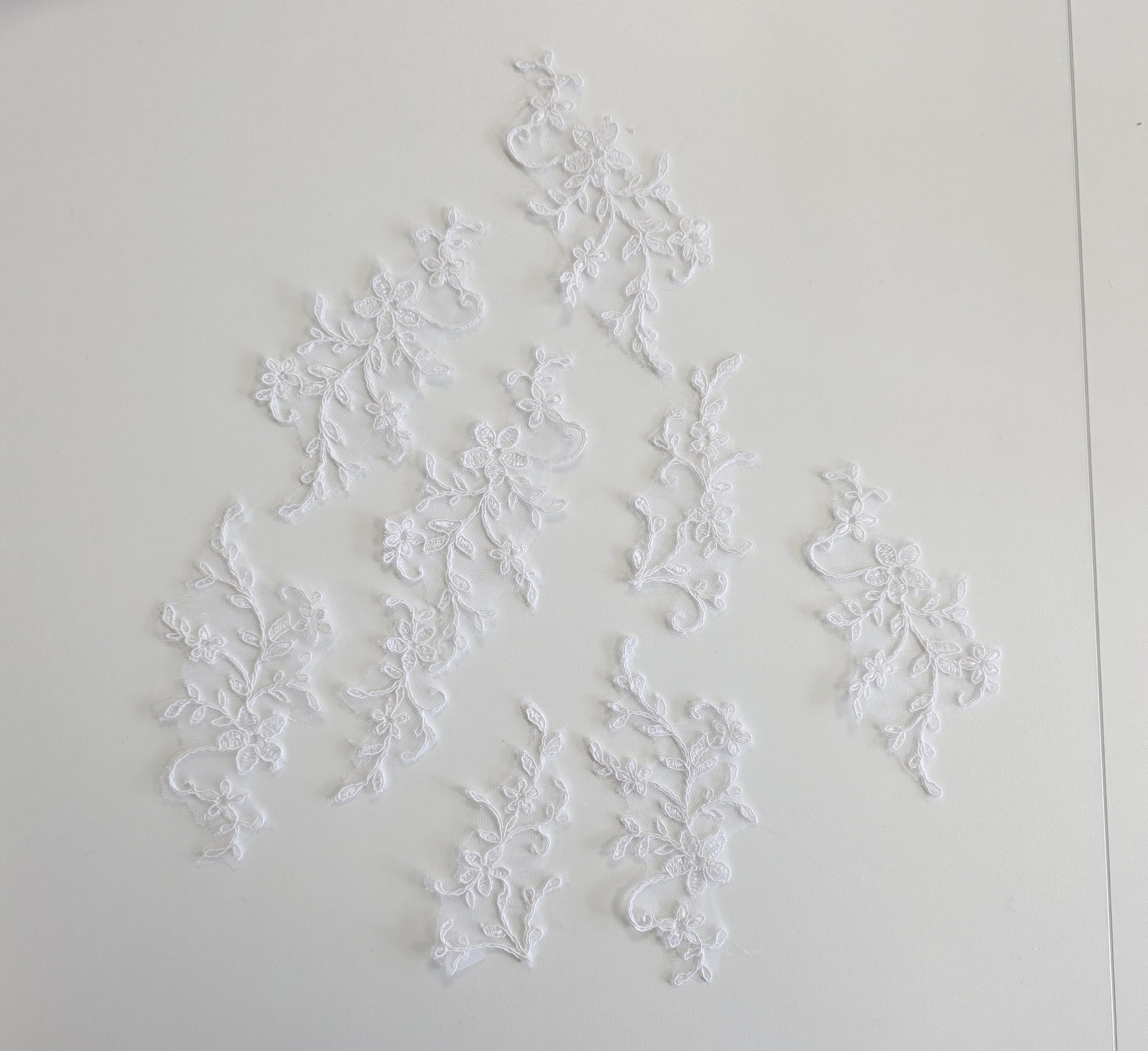 Fournitures pour coudre une robe de mariée. Dentelle, tissus, appliqués, galons, boutons. Robes et accessoires pour la mariée.