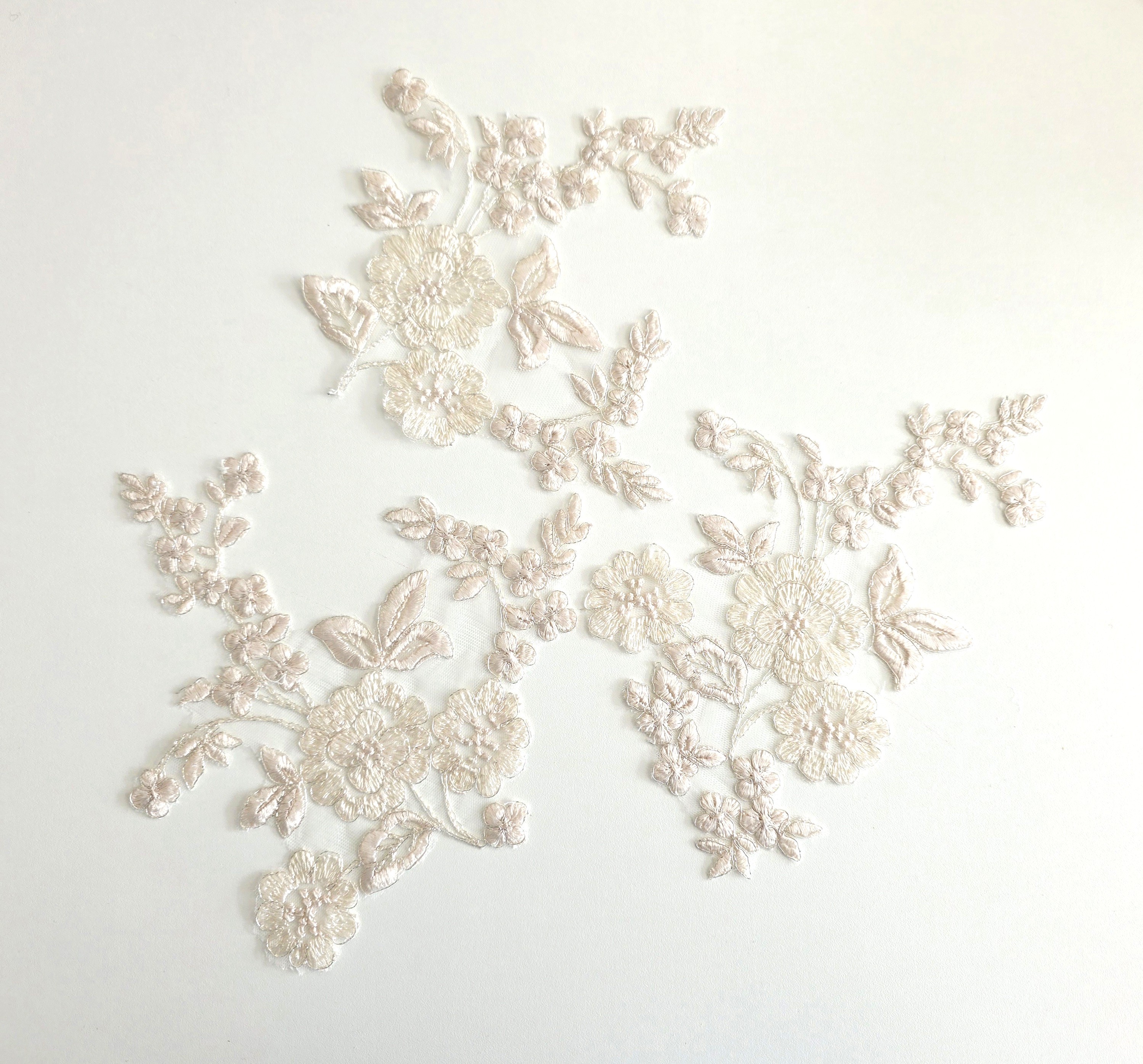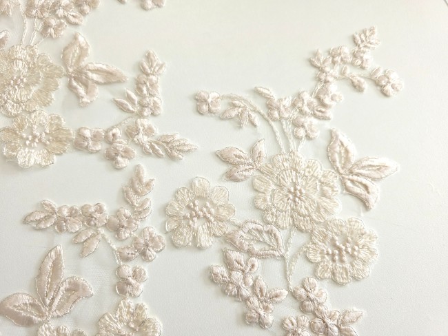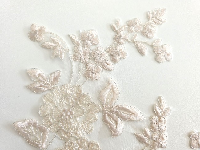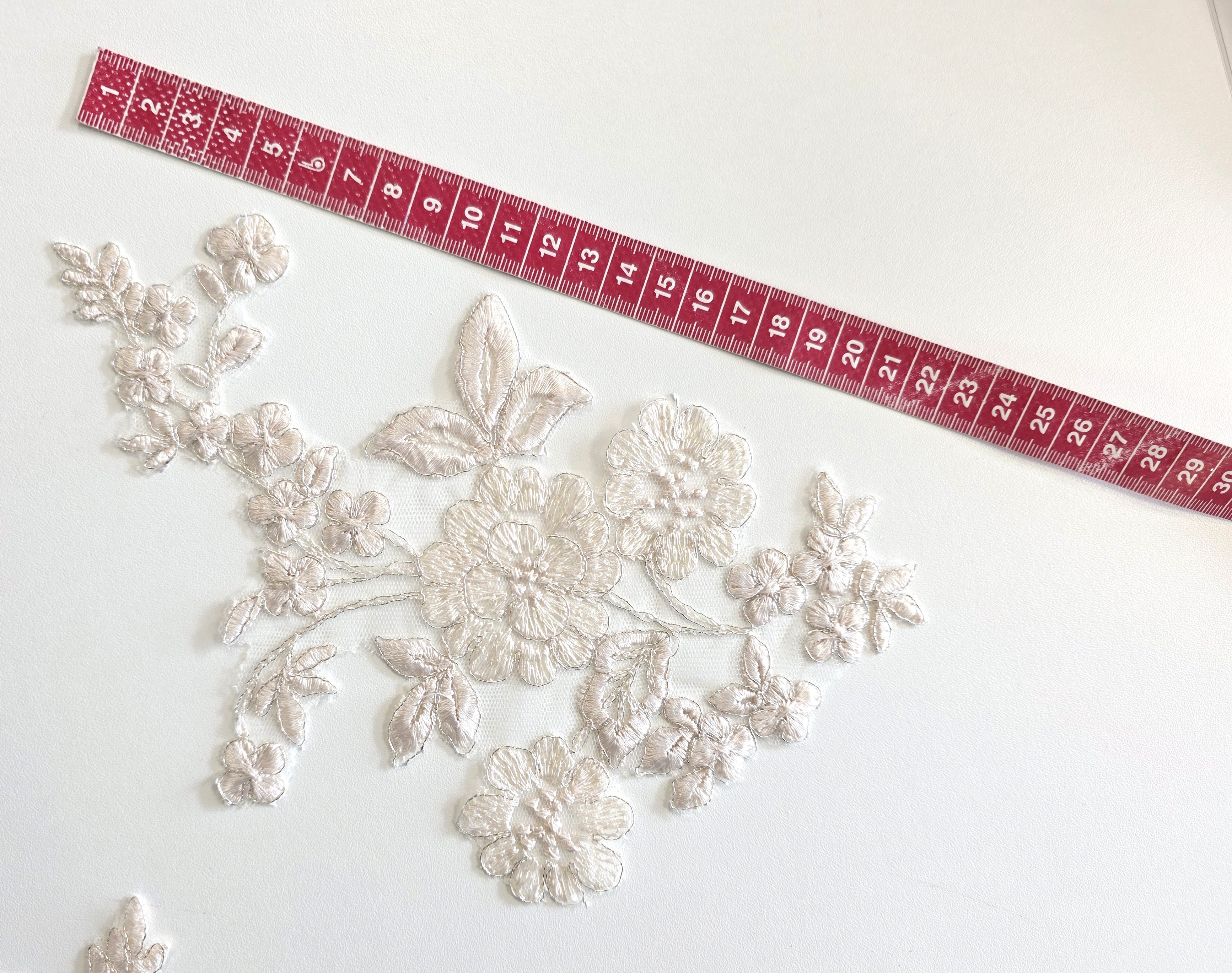 Fournitures pour coudre une robe de mariée. Dentelle, tissus, appliqués, galons, boutons. Robes et accessoires pour la mariée.