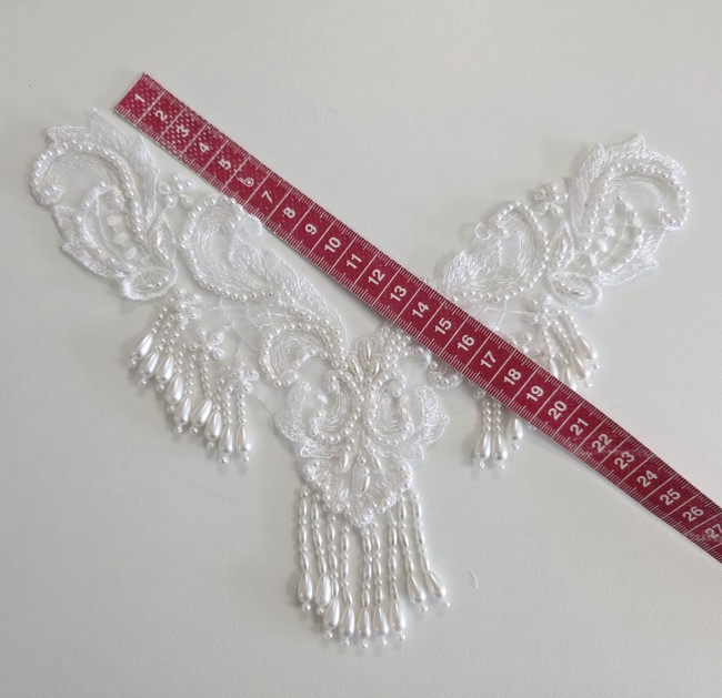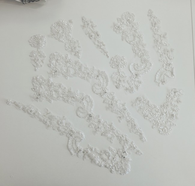 Fournitures pour coudre une robe de mariée. Dentelle, tissus, appliqués, galons, boutons. Robes et accessoires pour la mariée.