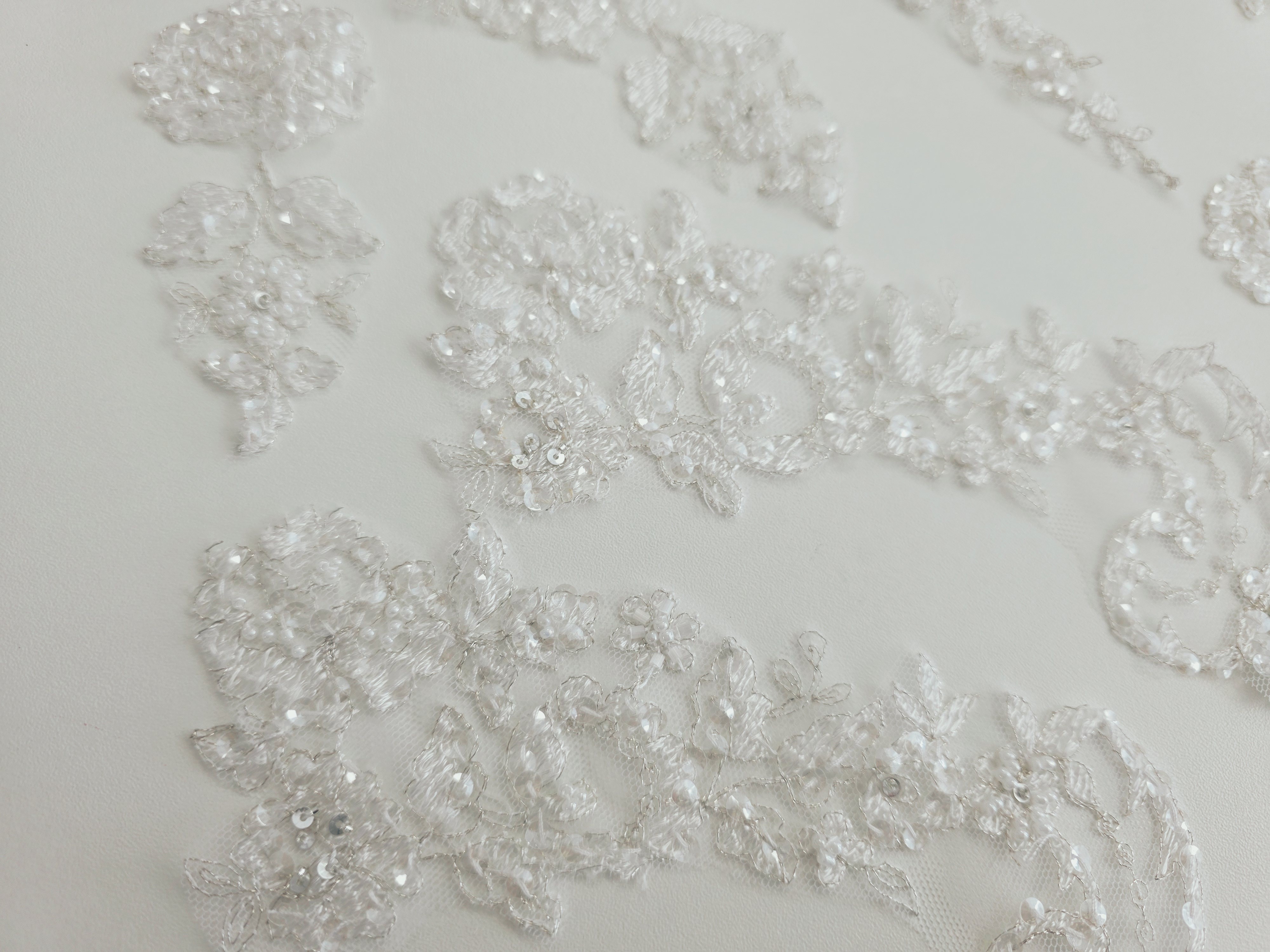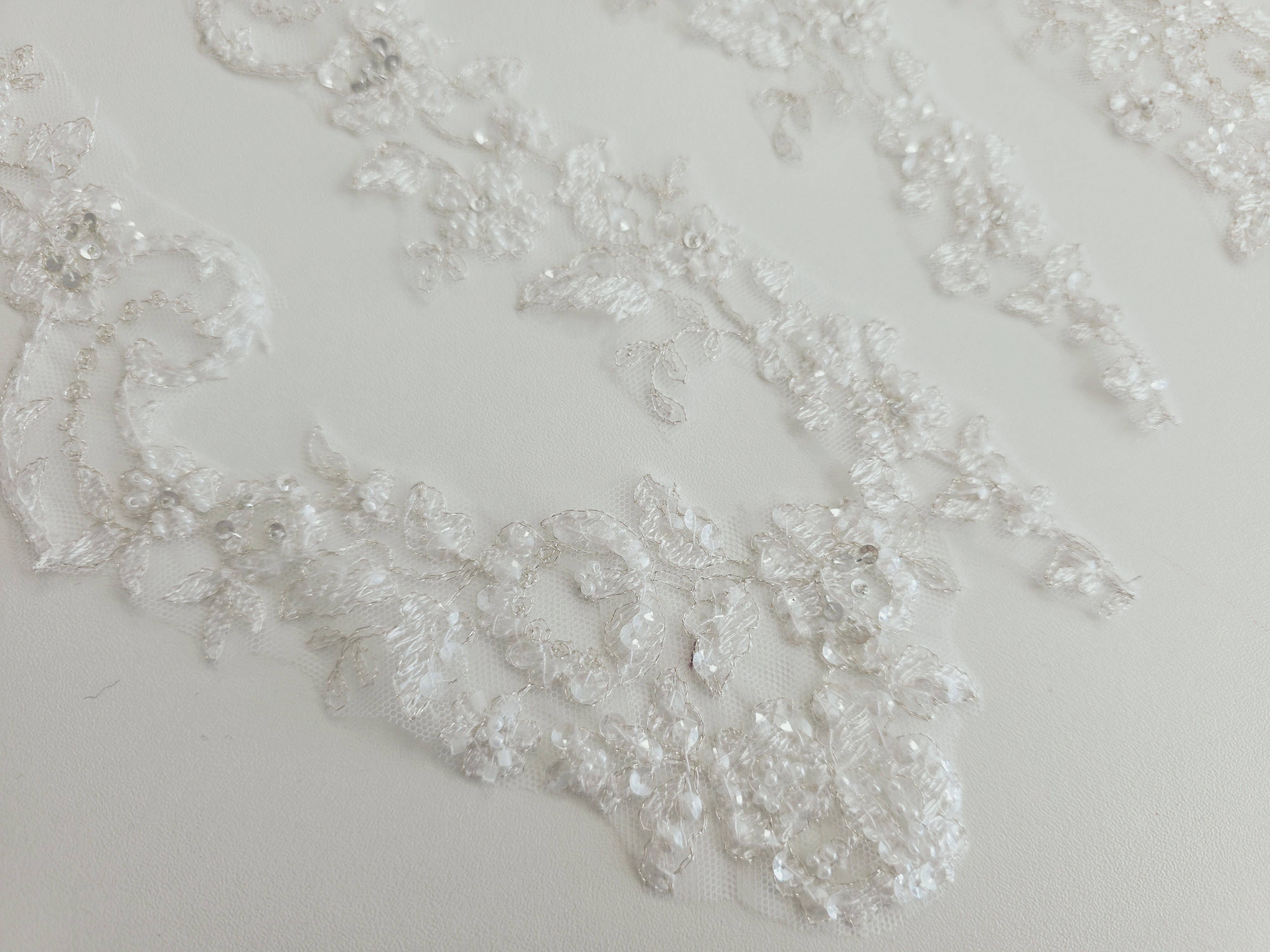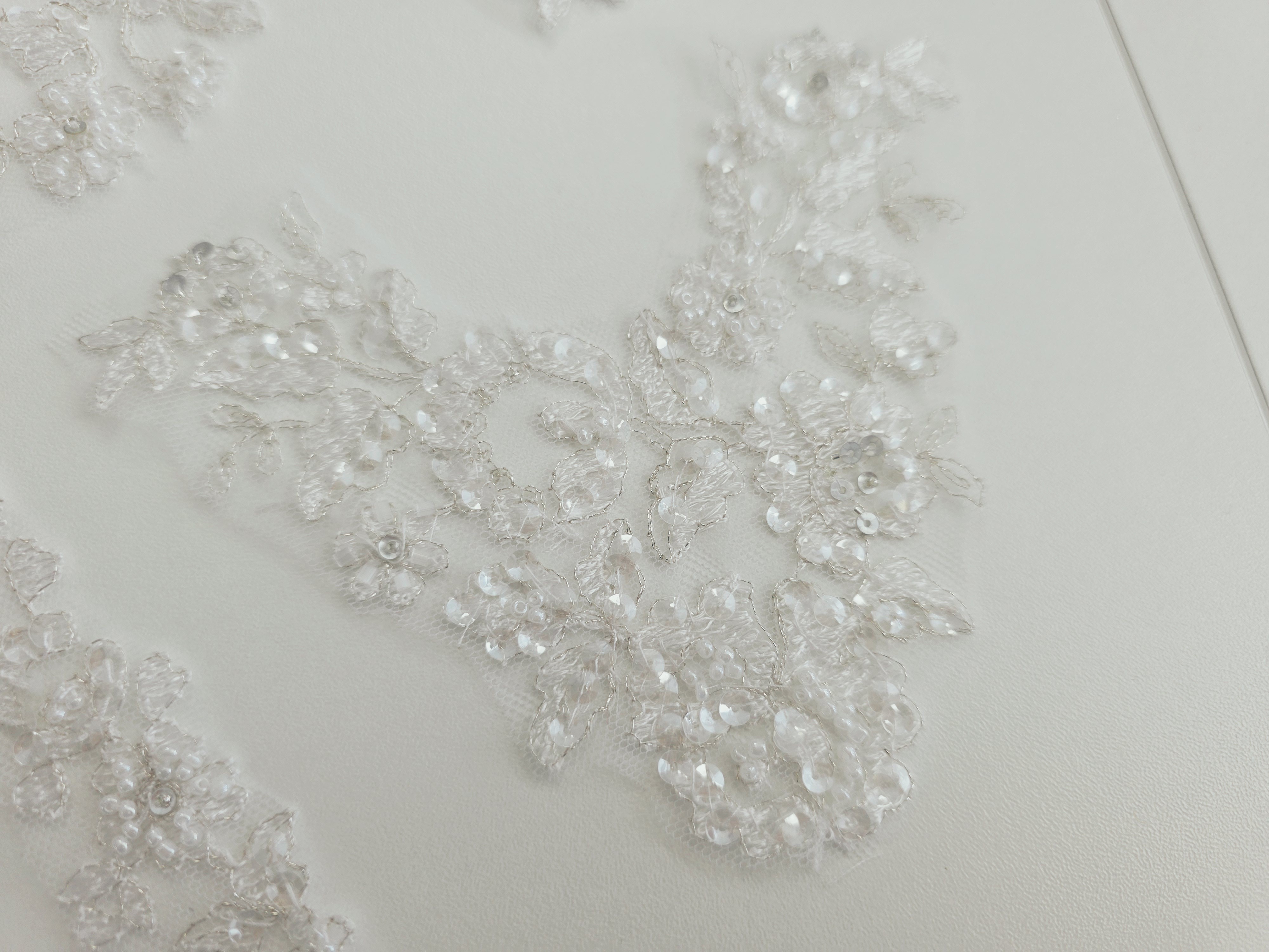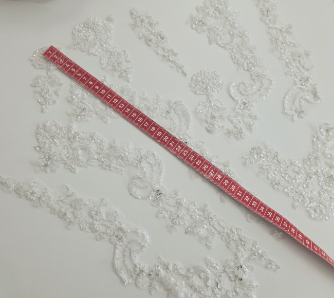 Fournitures pour coudre une robe de mariée. Dentelle, tissus, appliqués, galons, boutons. Robes et accessoires pour la mariée.
