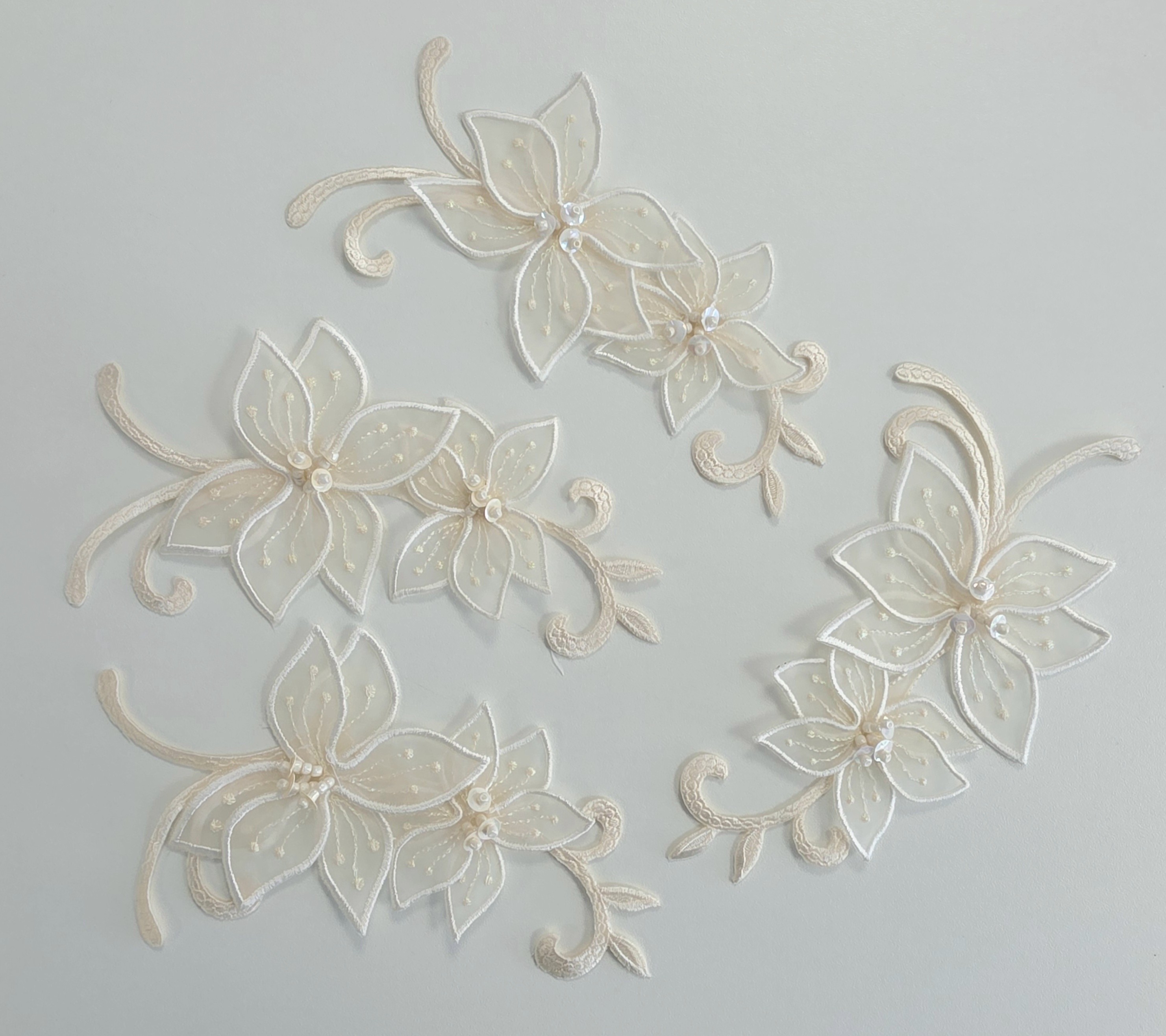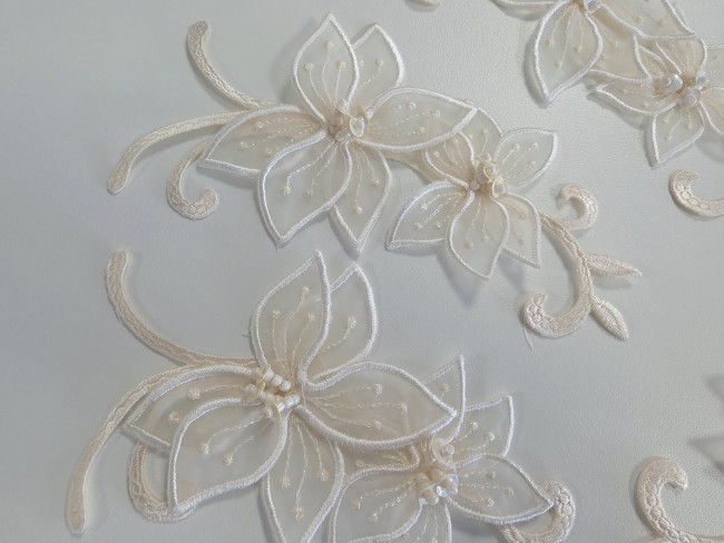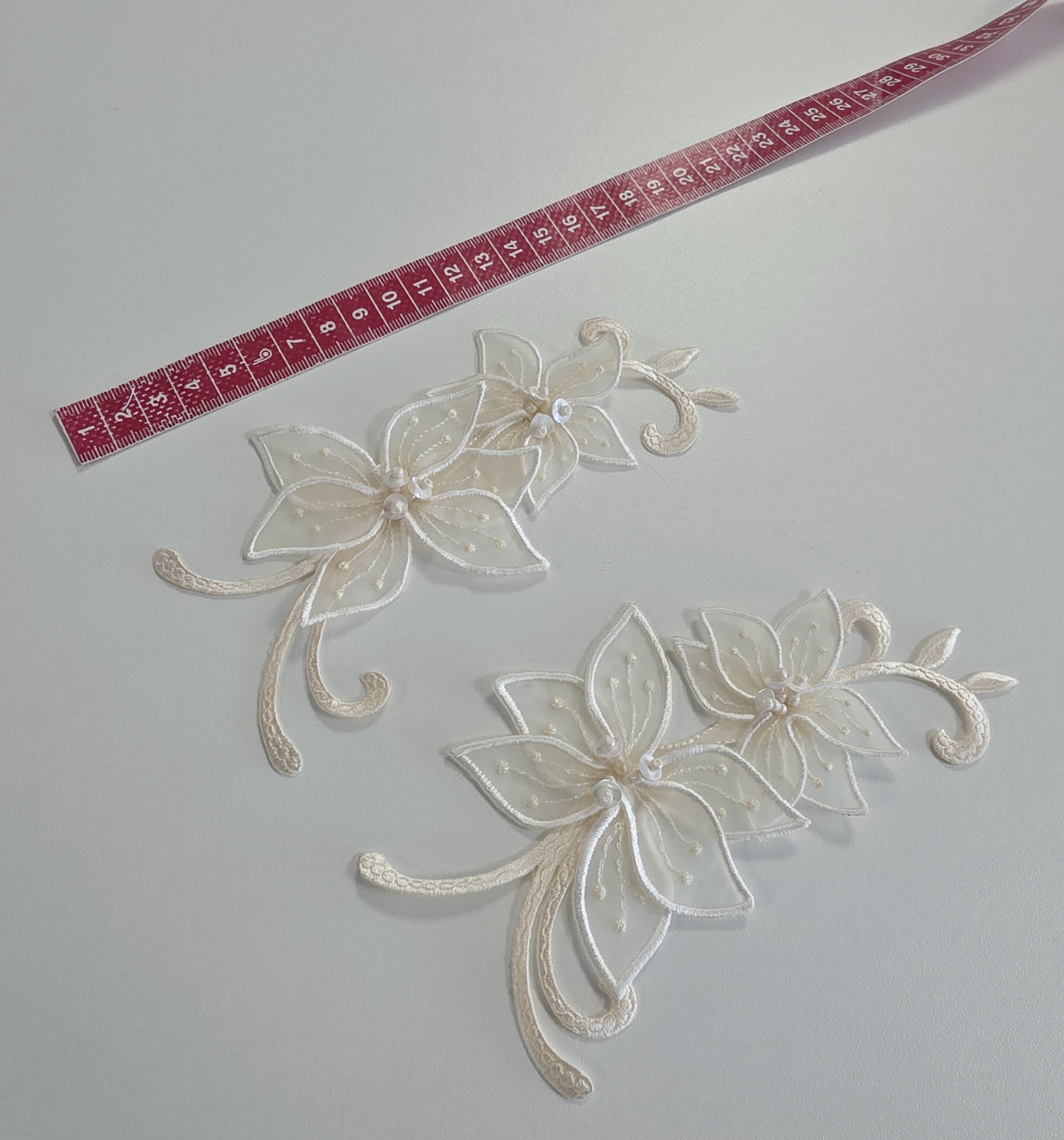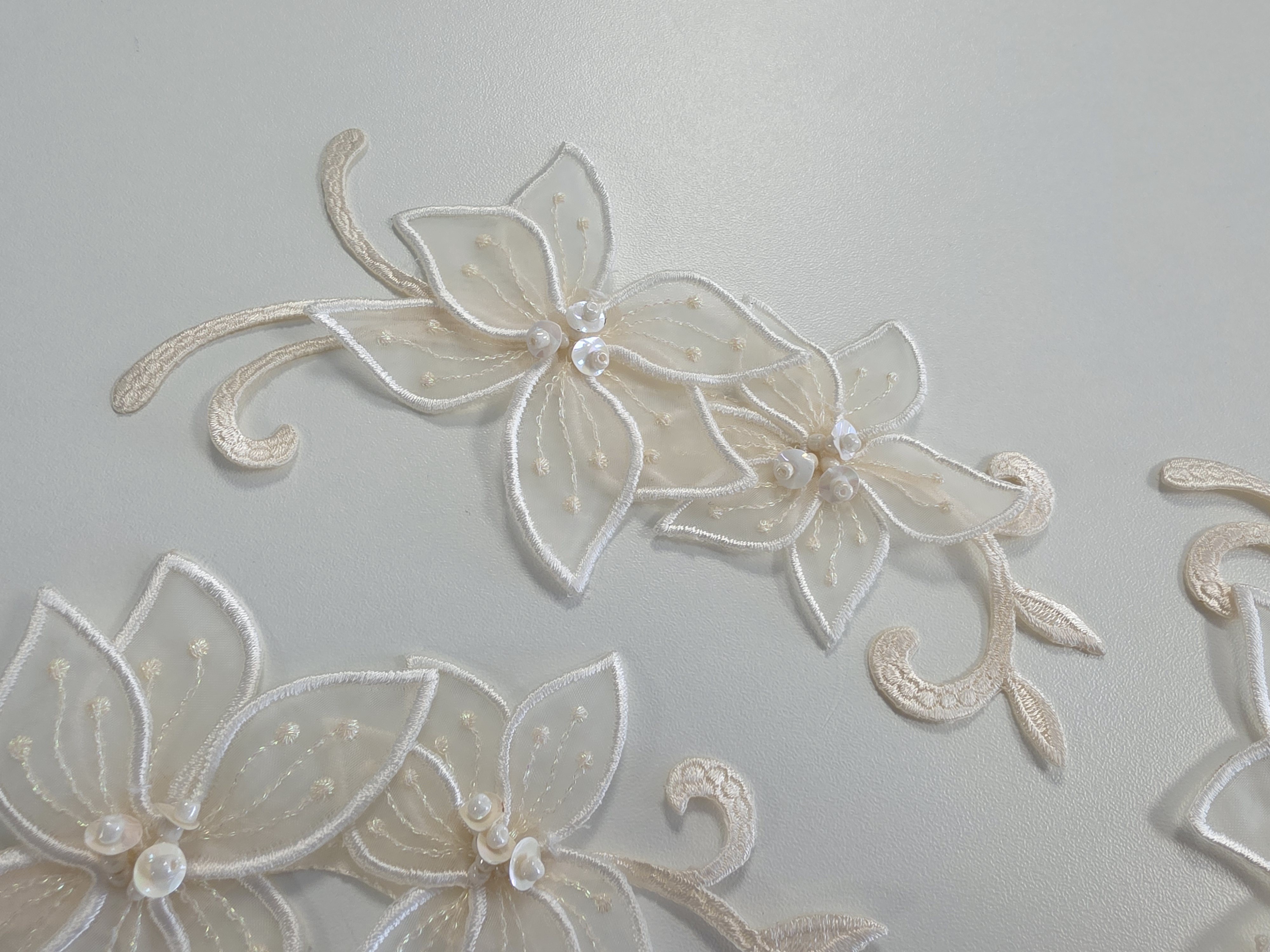 Fournitures pour coudre une robe de mariée. Dentelle, tissus, appliqués, galons, boutons. Robes et accessoires pour la mariée.