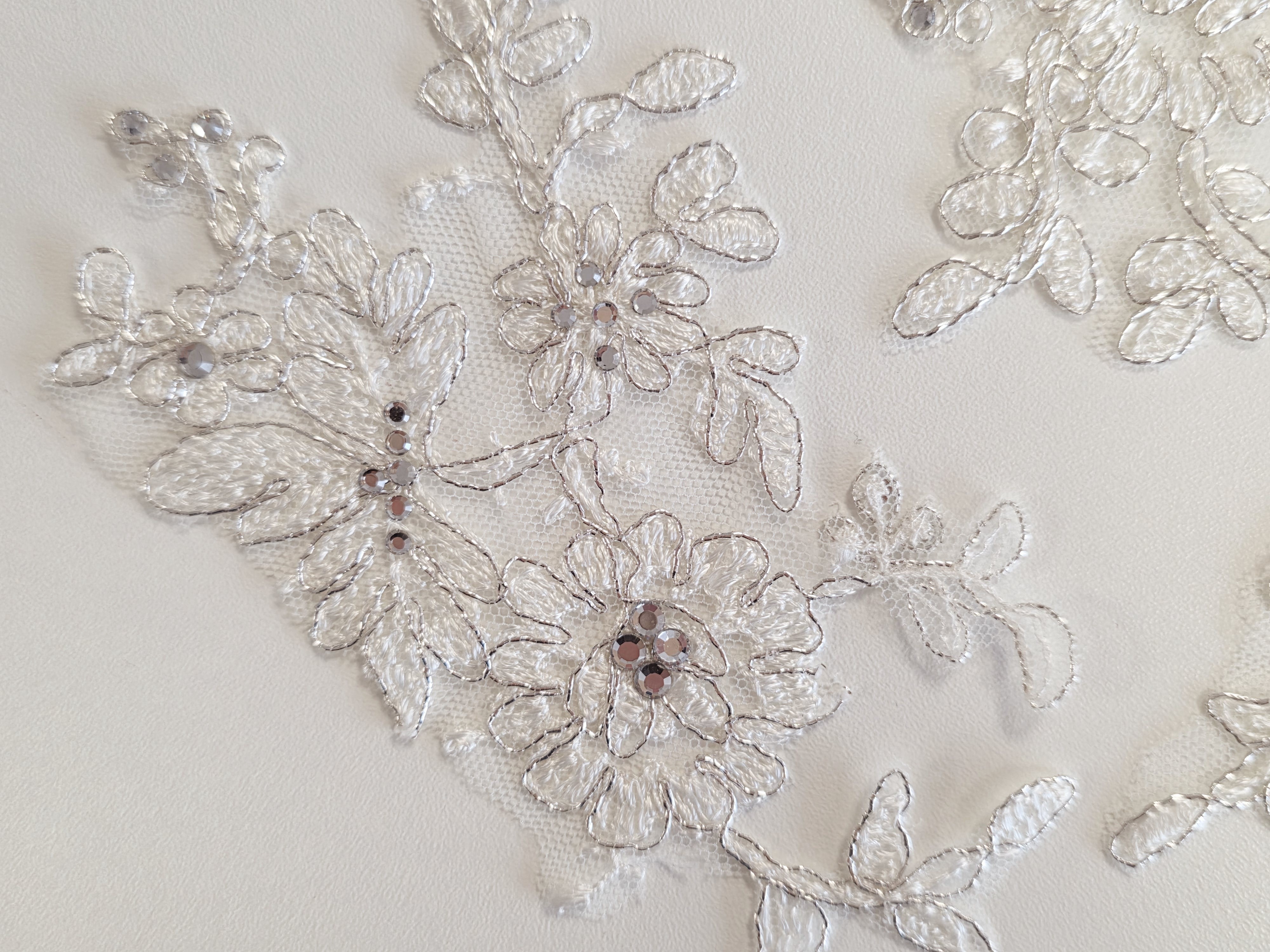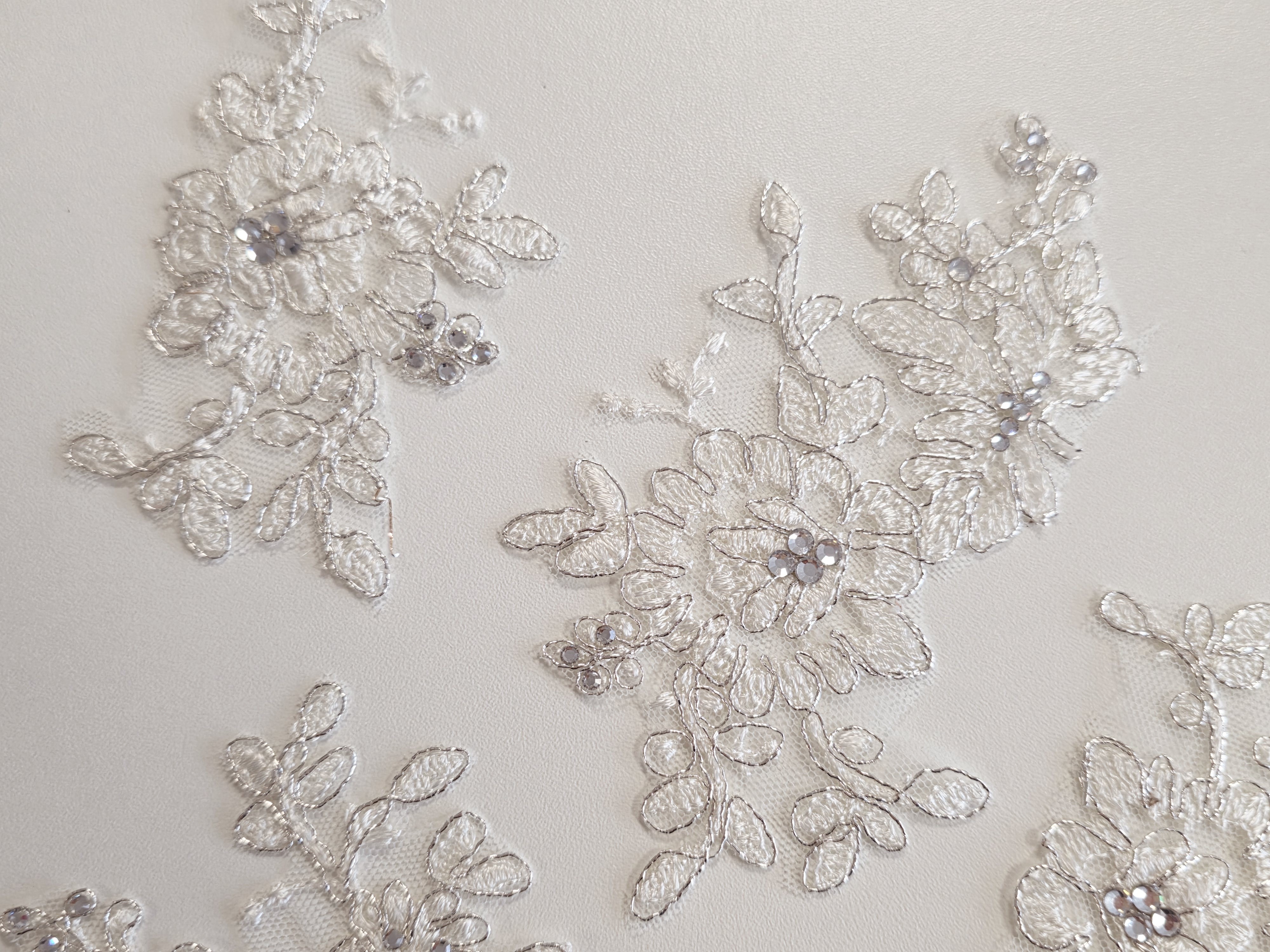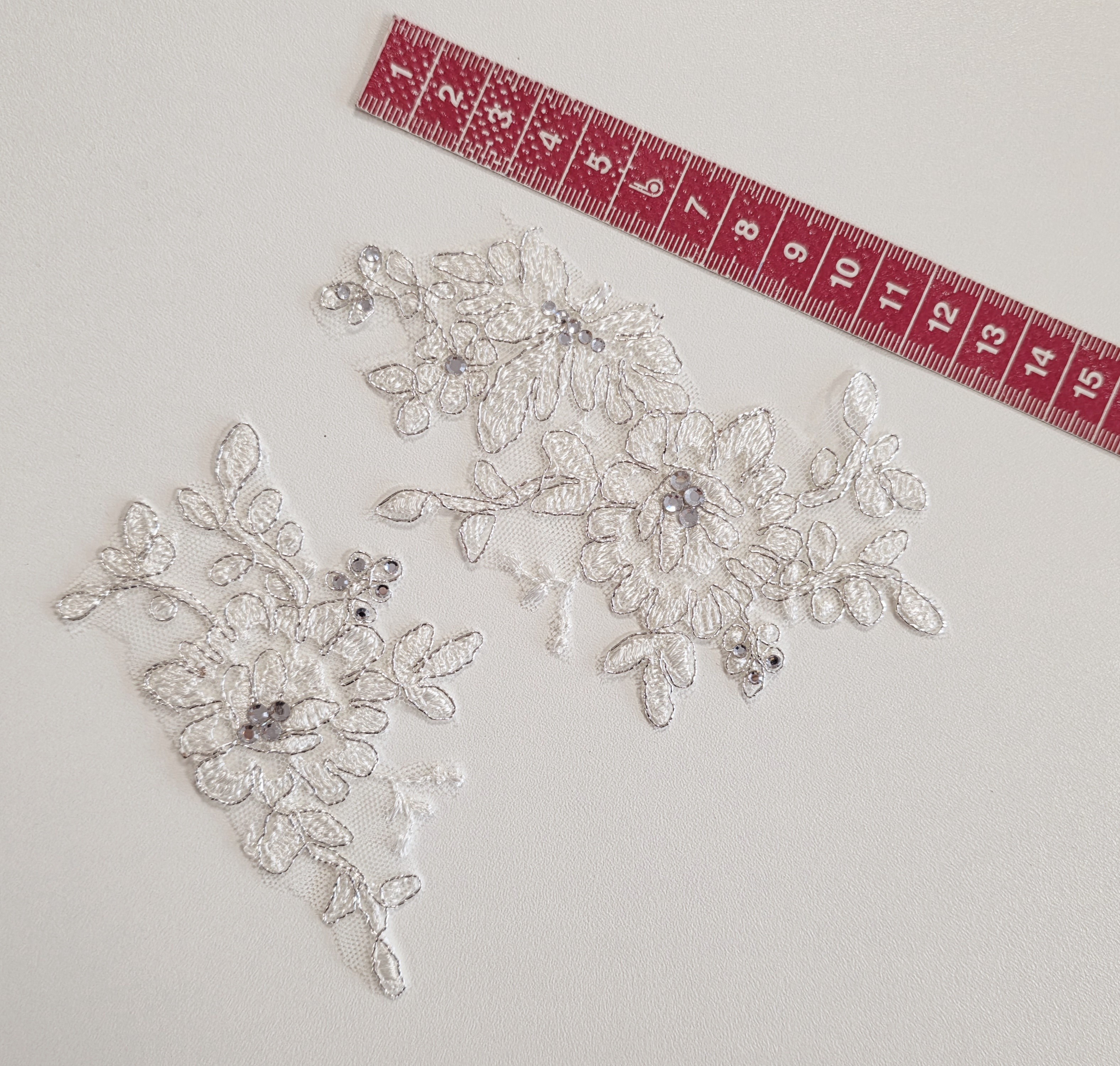 Fournitures pour coudre une robe de mariée. Dentelle, tissus, appliqués, galons, boutons. Robes et accessoires pour la mariée.