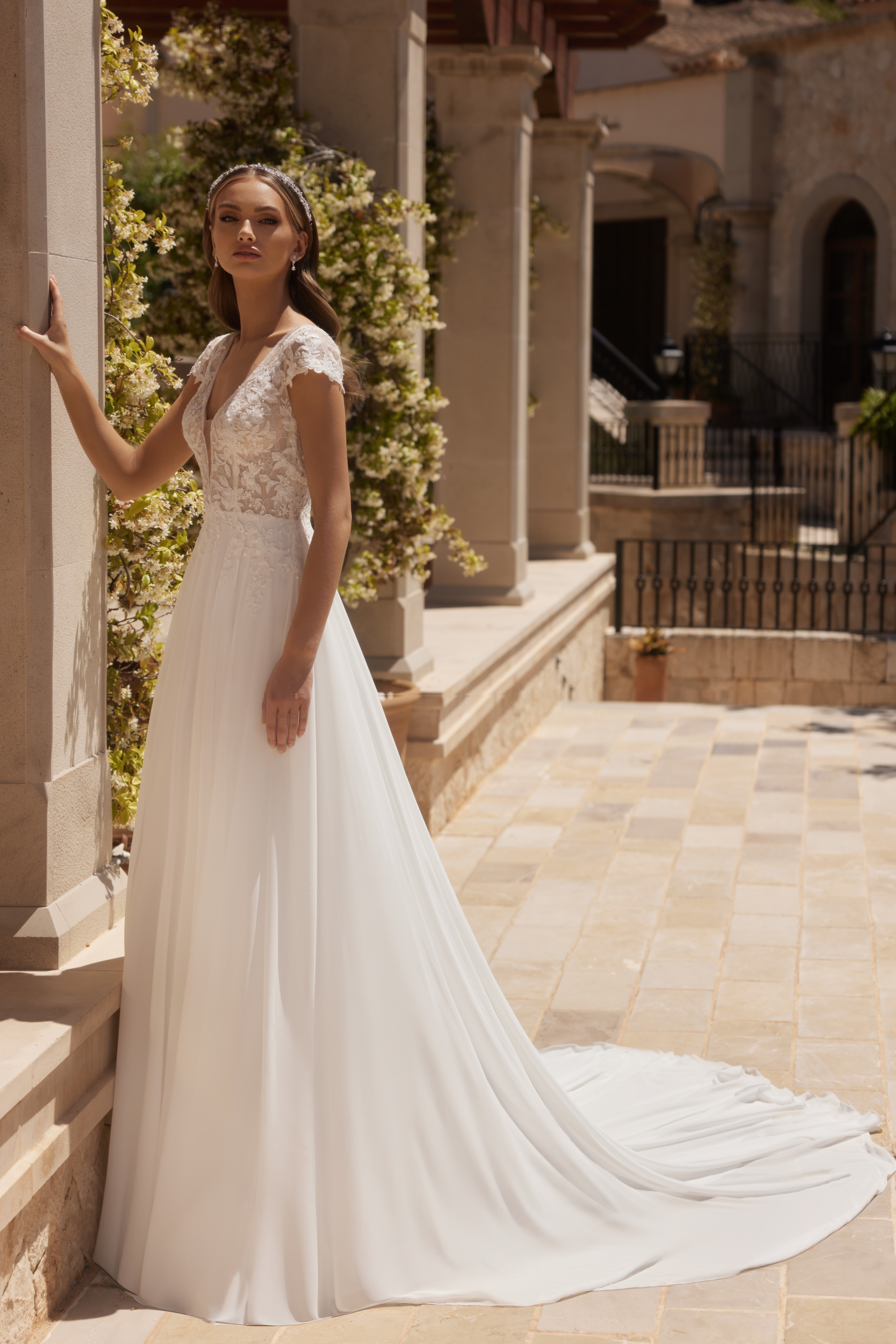 Décolleté plongeant, petites manches, dos inversé et petites boutons.