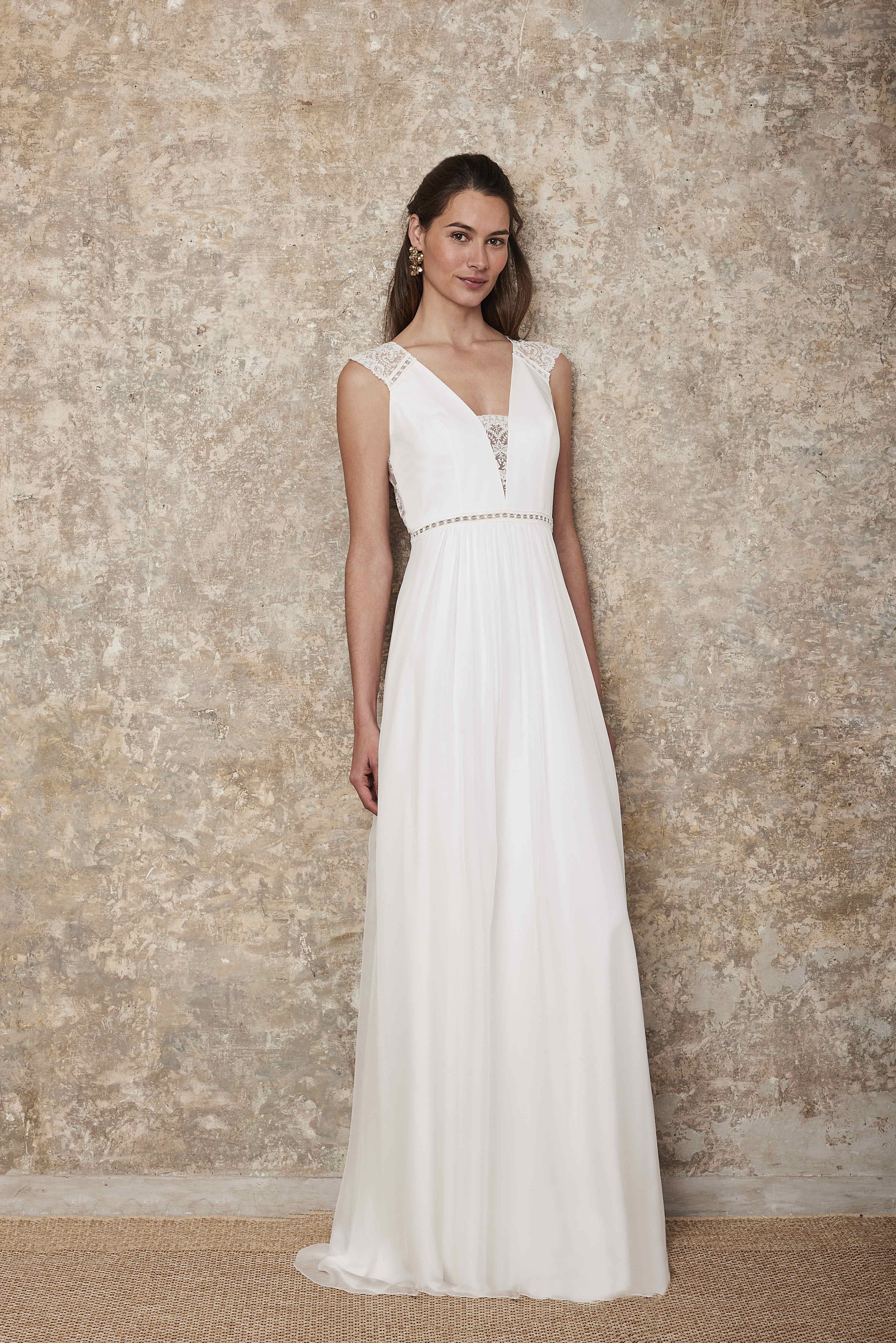 Le buste est épuré sur l'avant, un petit entre-deux de dentelle pour la ceinture, un empiècement de dentelle sur le V du décolleté et un effet de manches sur les épaules. Le dos est tout en dentelle, non doublé avec ouverture inversée.