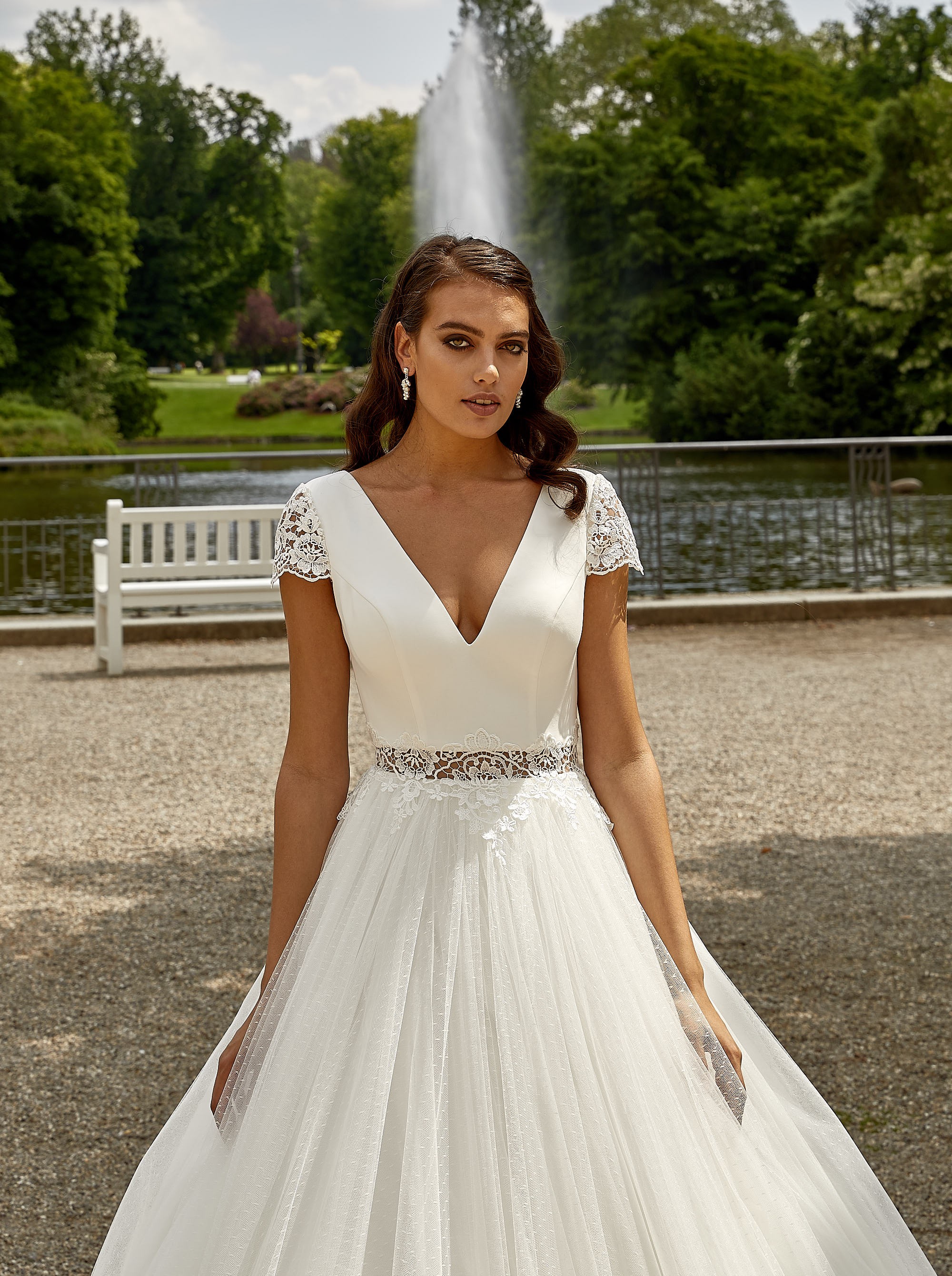 Buste en satin mat, effet de manches, dos boutonné et ceinture en guipure