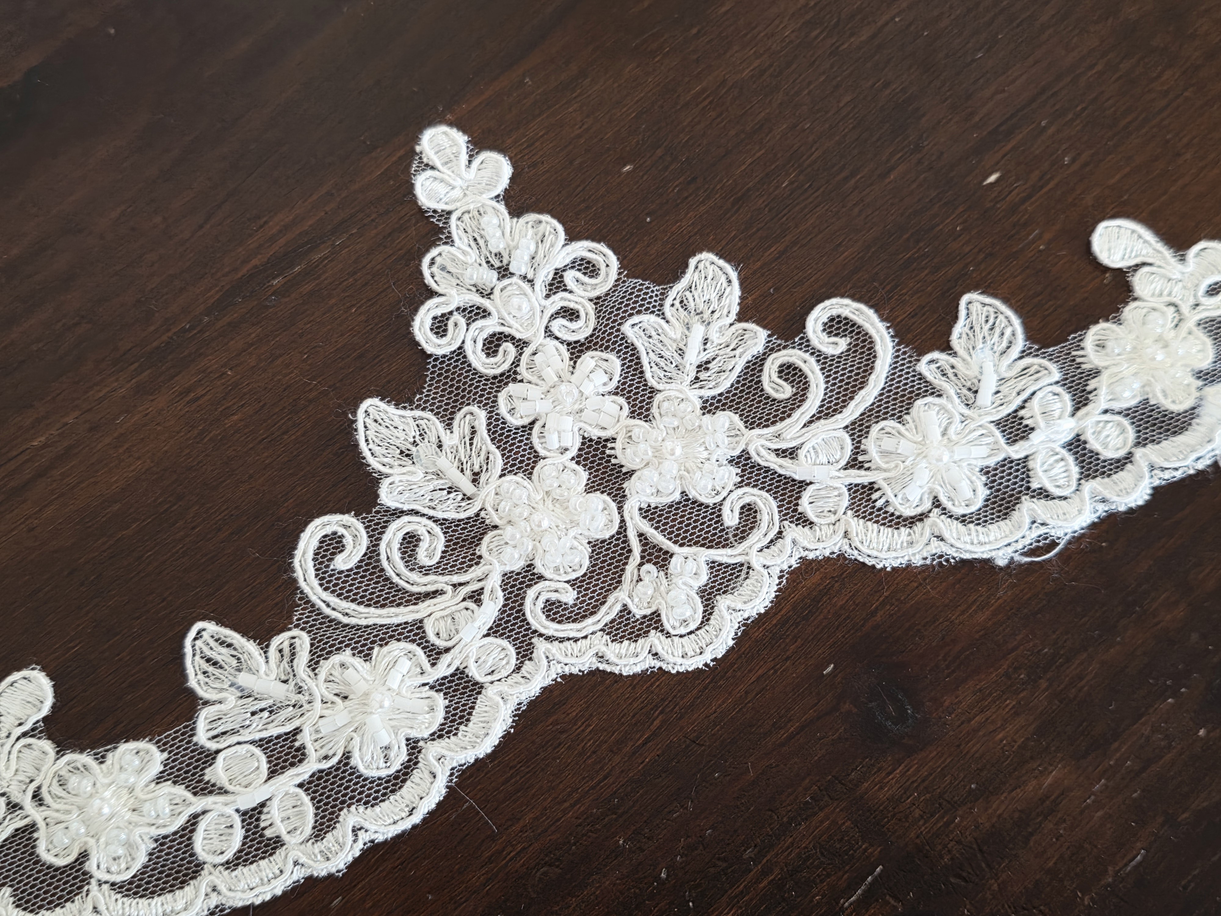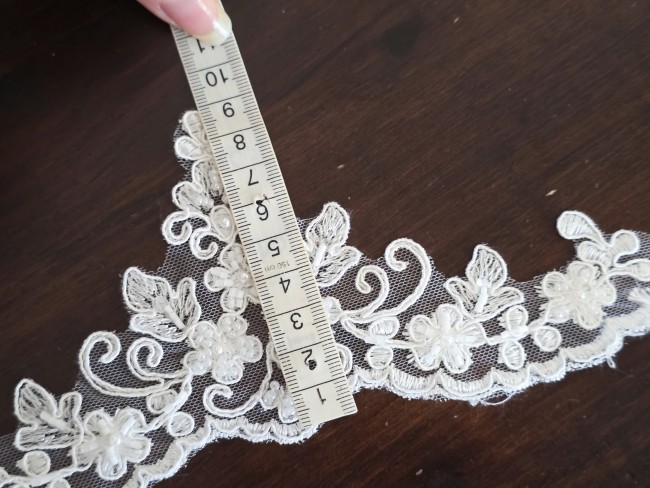 Fournitures pour coudre une robe de mariée. Dentelle, tissus, appliqués, galons, boutons. Robes et accessoires pour la mariée.