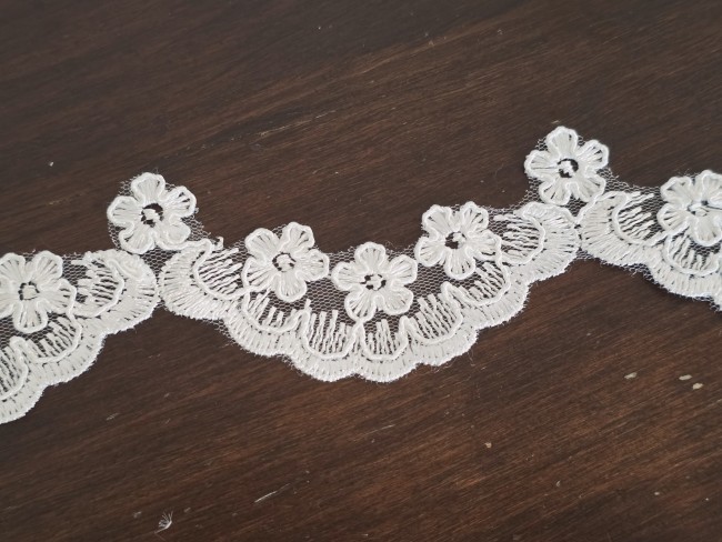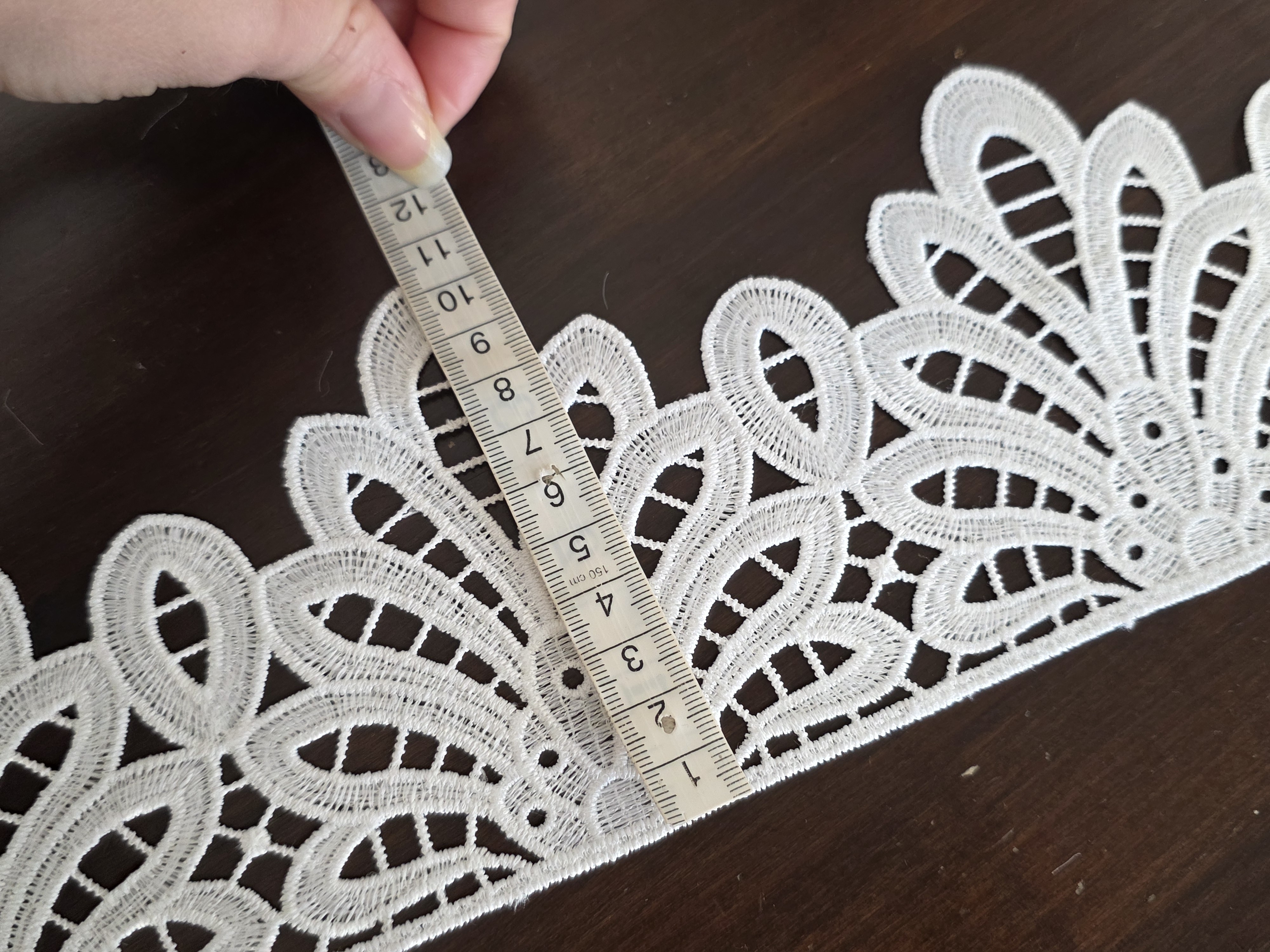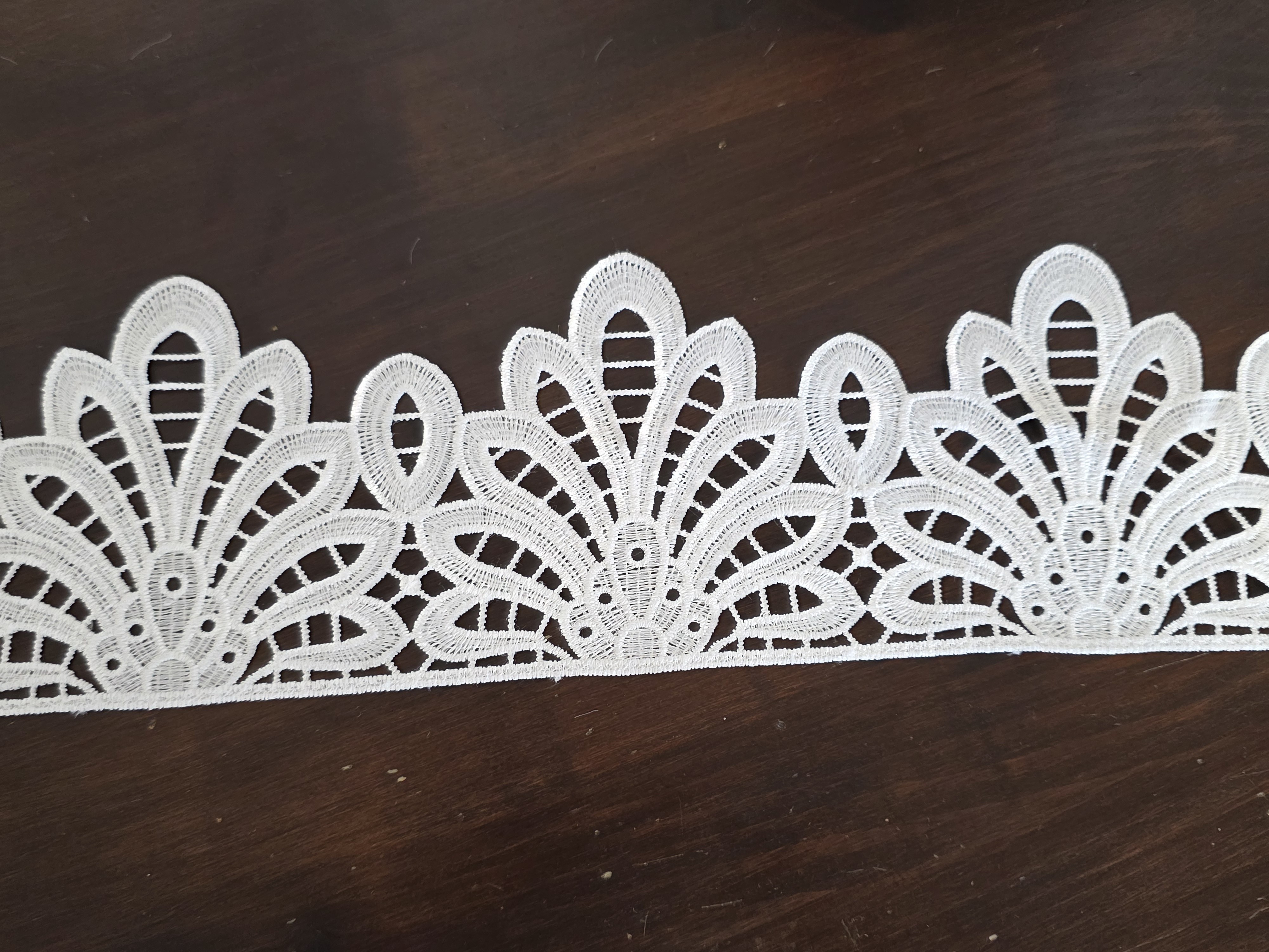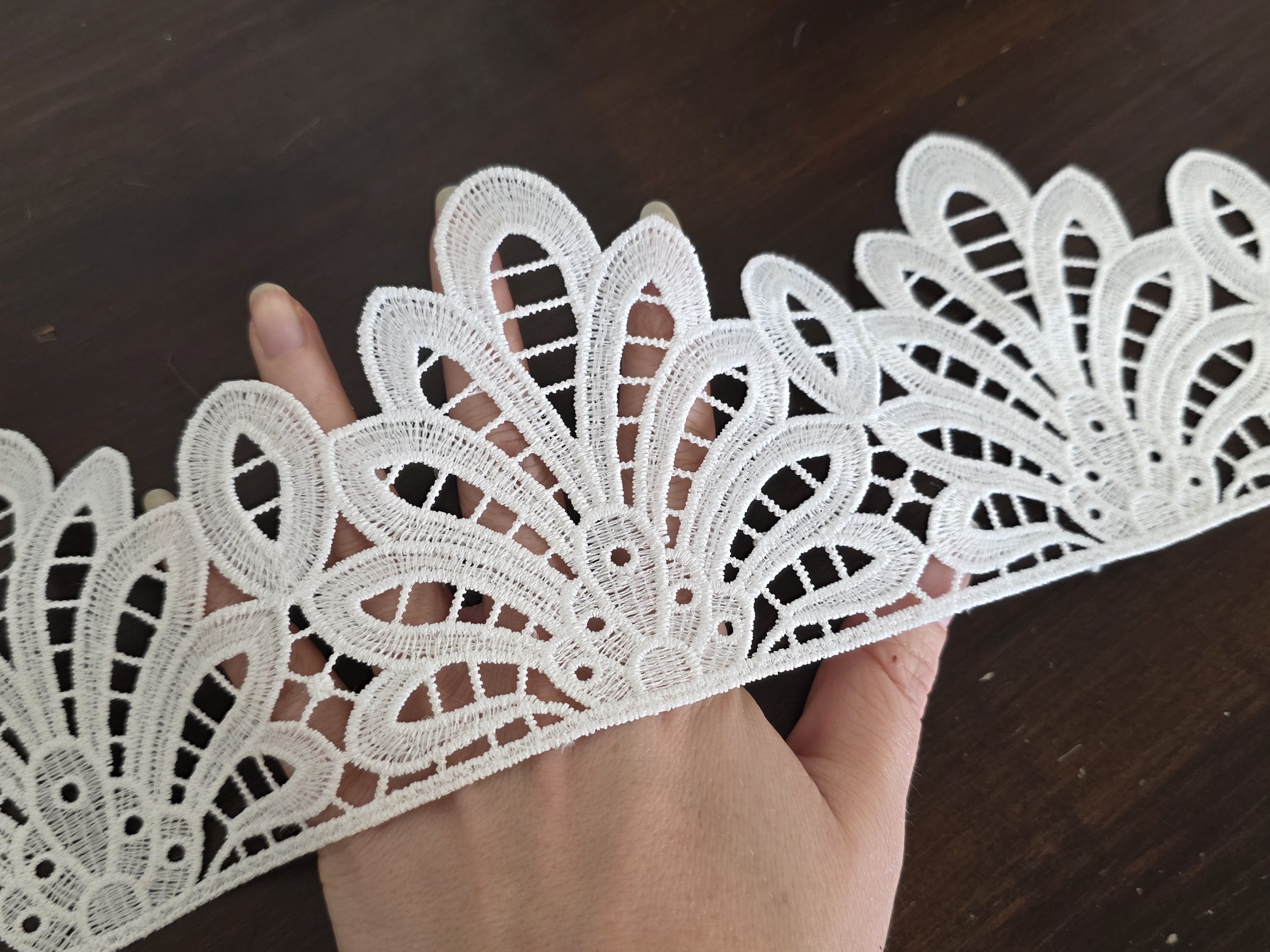 Offrez une finition spectaculaire à vos créations grâce à cette magnifique dentelle brodée blanche de 7 cm, ornée d’un motif en éventail ajouré. Ses lignes élégantes et symétriques apportent du relief et une touche raffinée à tous vos projets couture ou déco.