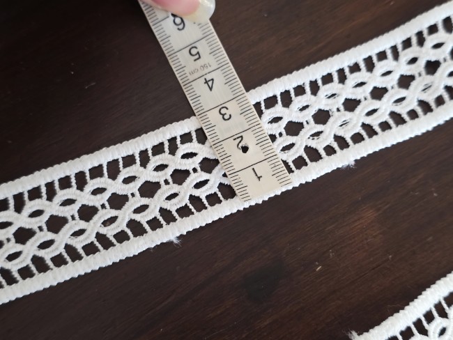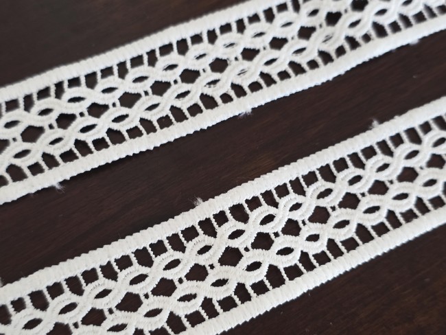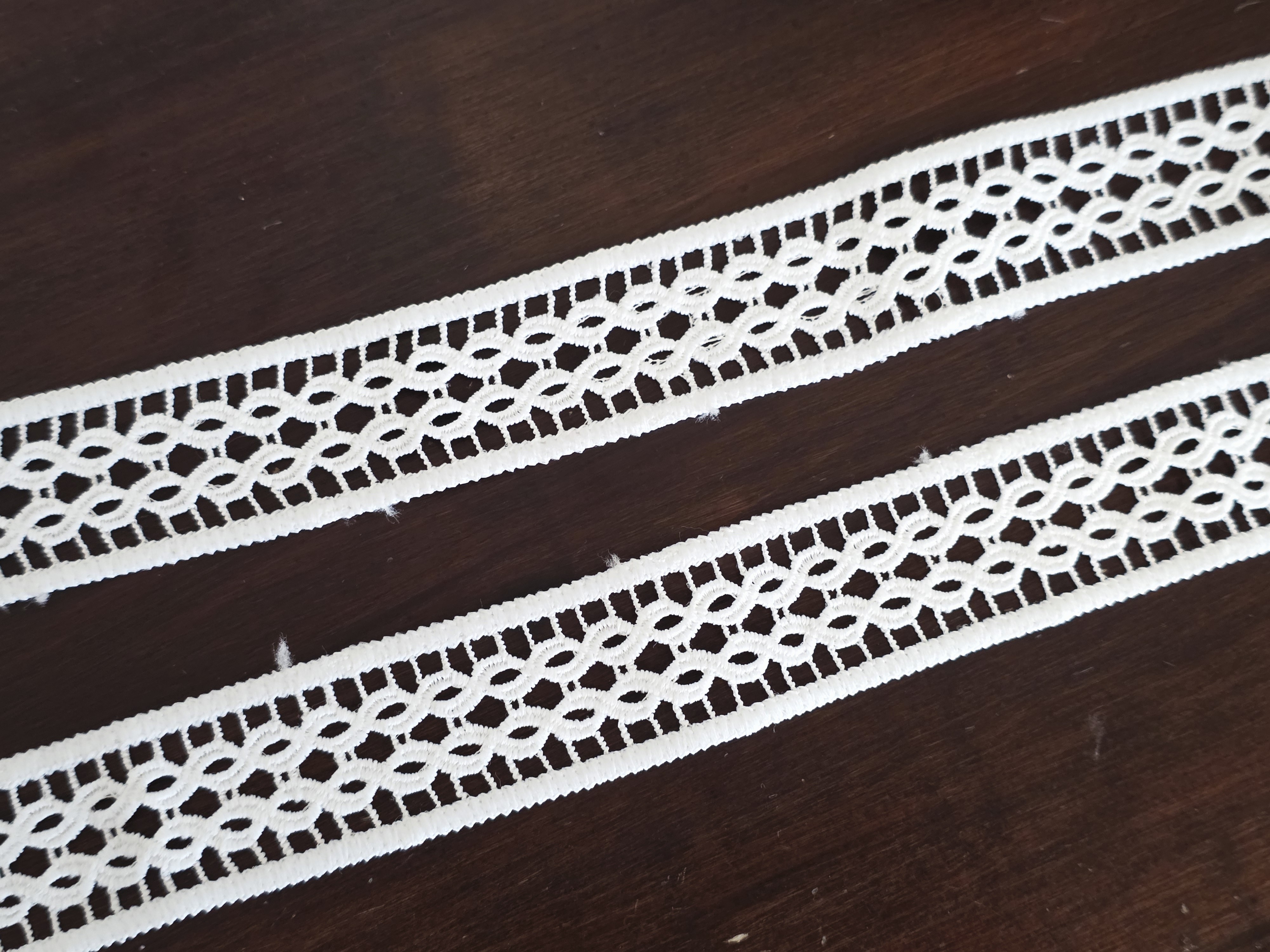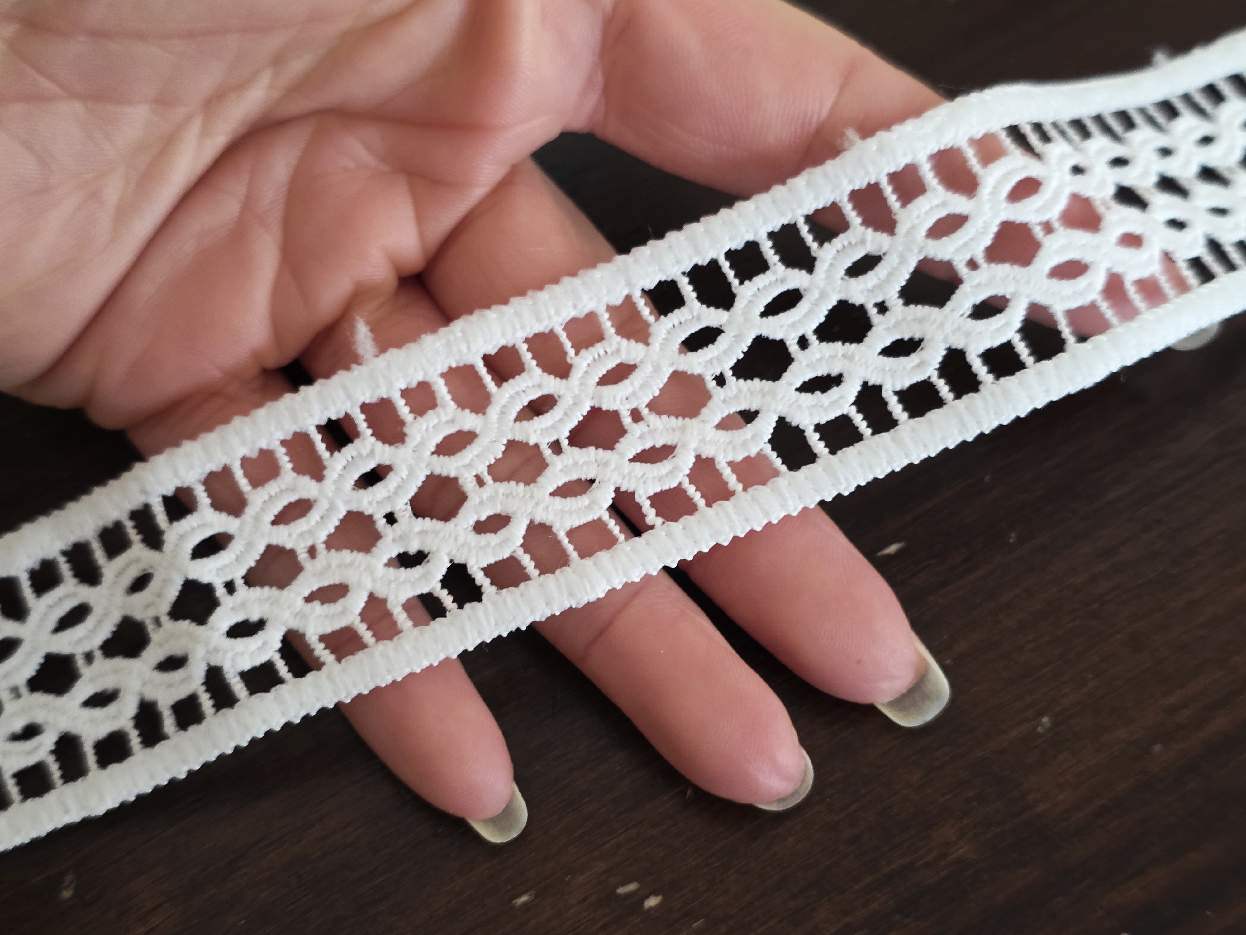 Ce galon de dentelle guipure ivoire clair séduit par son motif géométrique entrelacé, à la fois moderne et délicat. Sa texture ajourée et sa finition soignée en font un choix idéal pour sublimer vêtements, accessoires, linge de maison ou créations DIY. Parfait pour la couture, les personnalisations et les décorations raffinées, ce galon est vendu au mètre pour s’adapter à tous vos projets.
