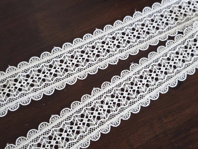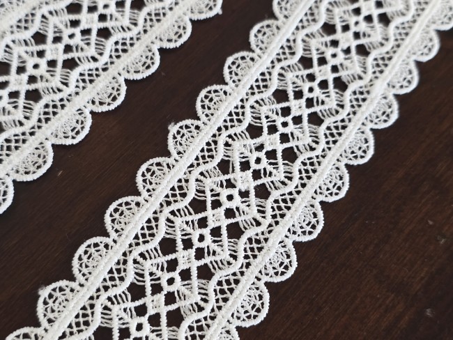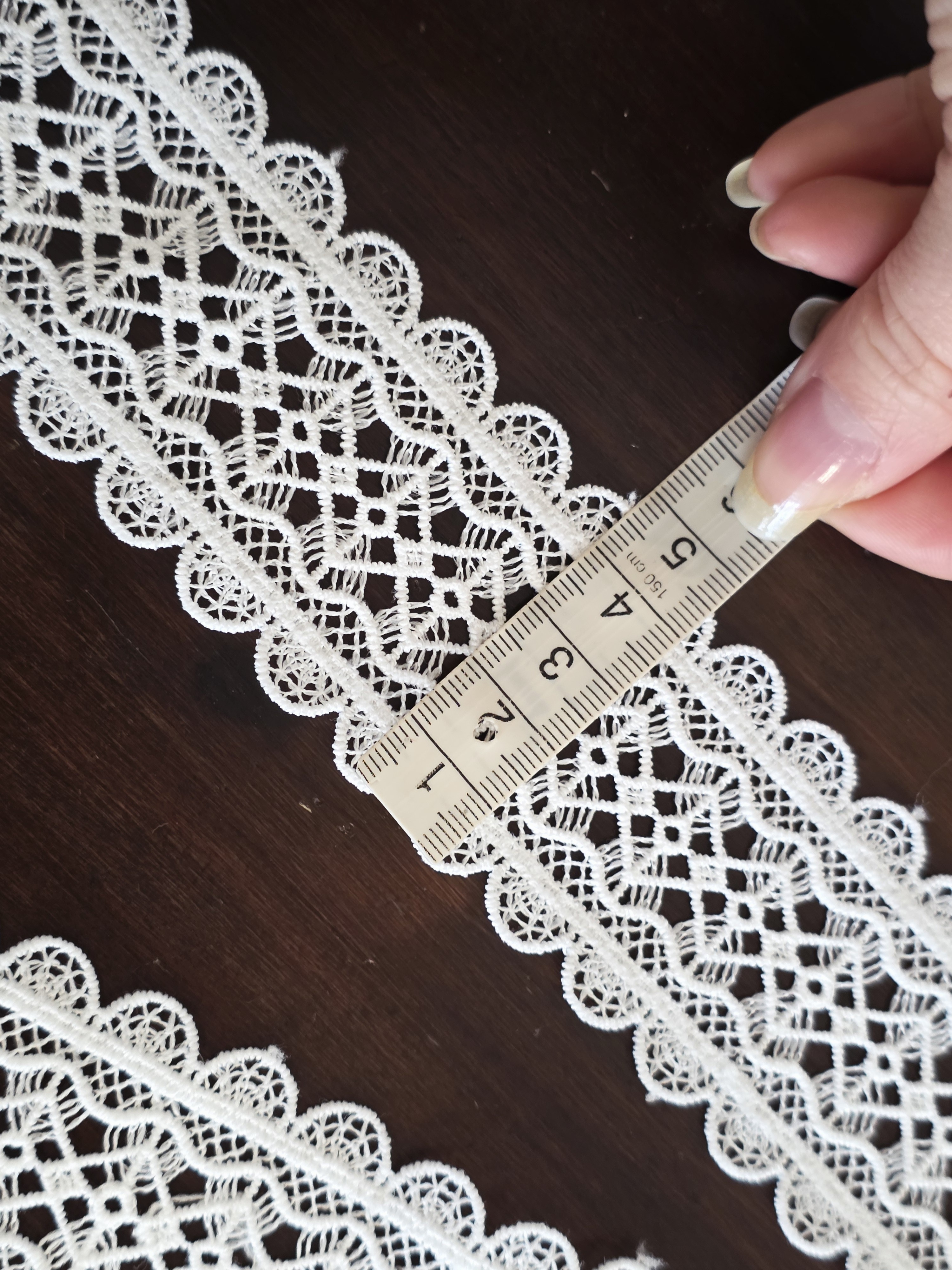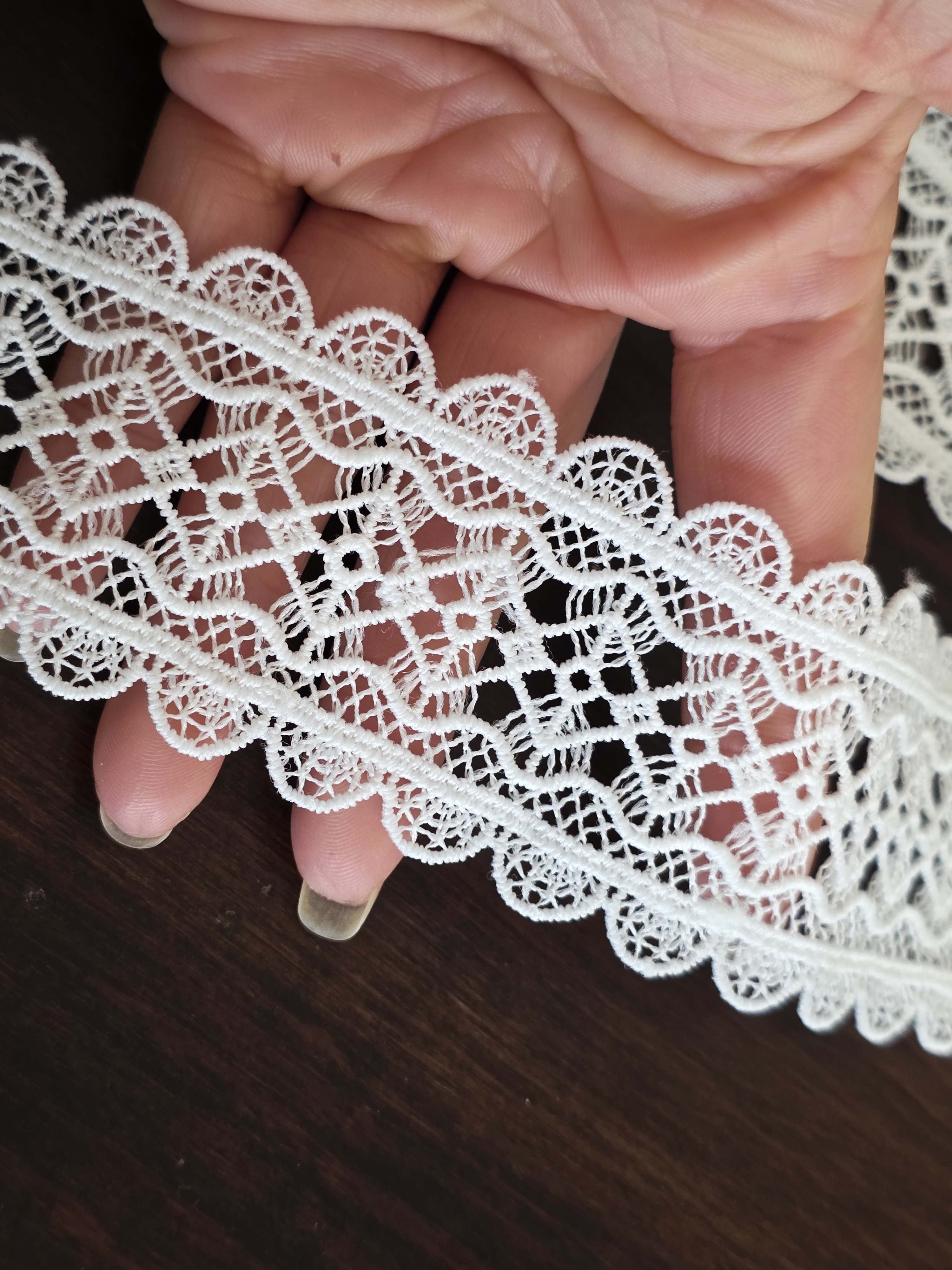 Sublimez vos créations avec ce magnifique galon de dentelle guipure ivoire clair, doté d’un bord festonné délicat et d’un motif géométrique raffiné. Parfait pour enjoliver vêtements, accessoires, décorations mariage ou projets DIY, ce galon offre une finition élégante à prix doux. Souple, résistant et vendu au mètre, il s’adapte à toutes vos envies couture.