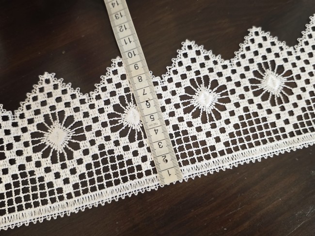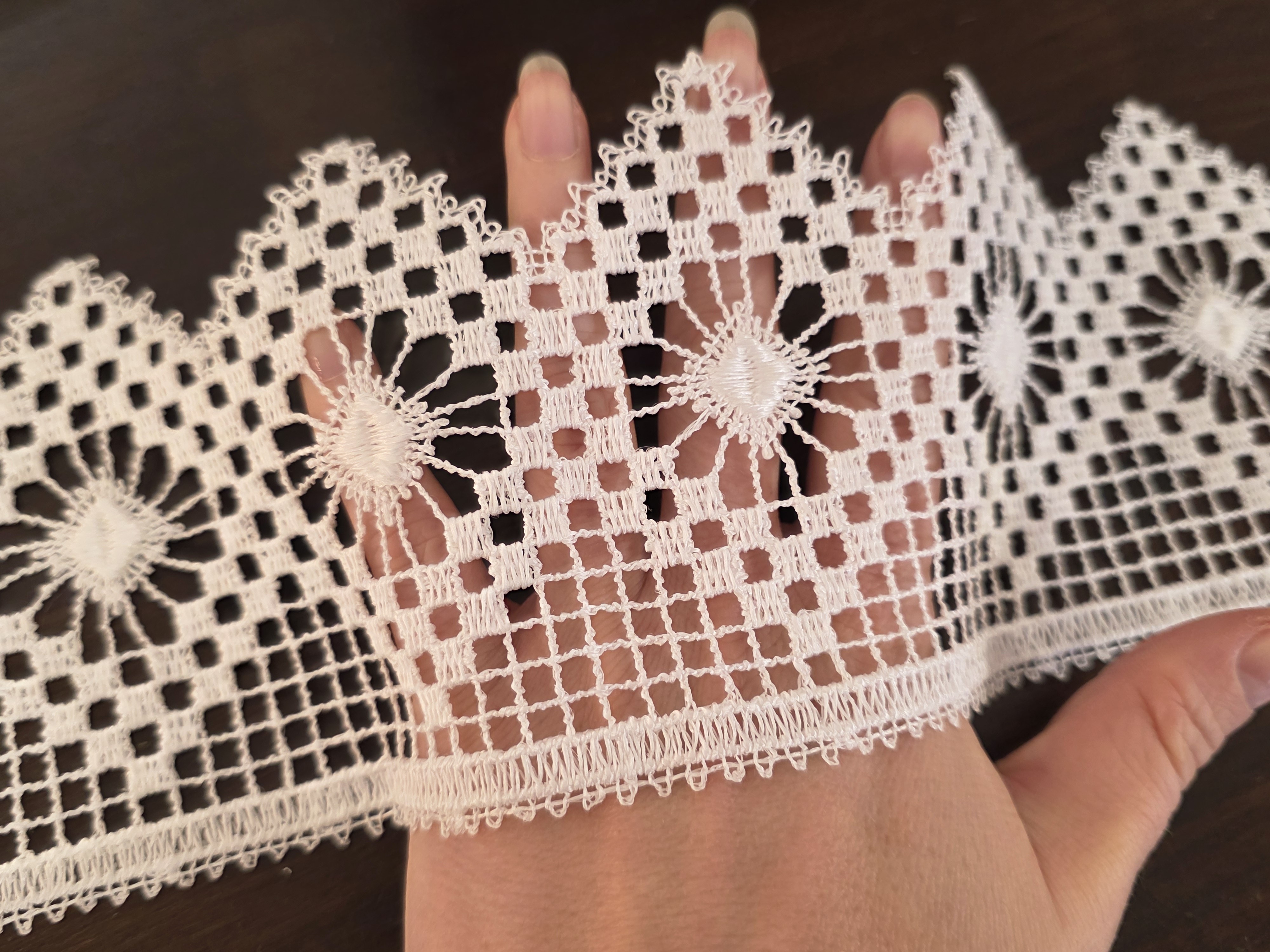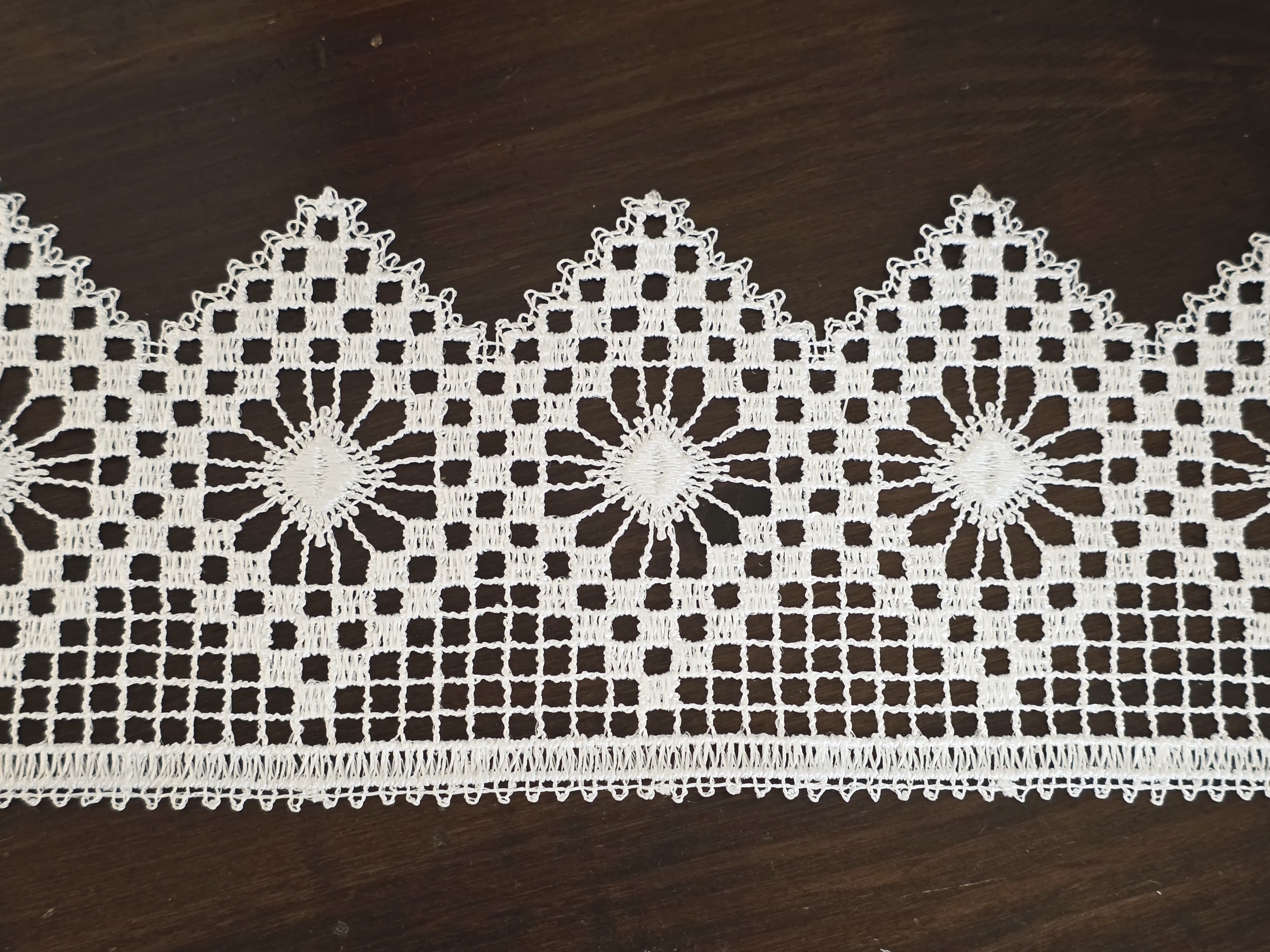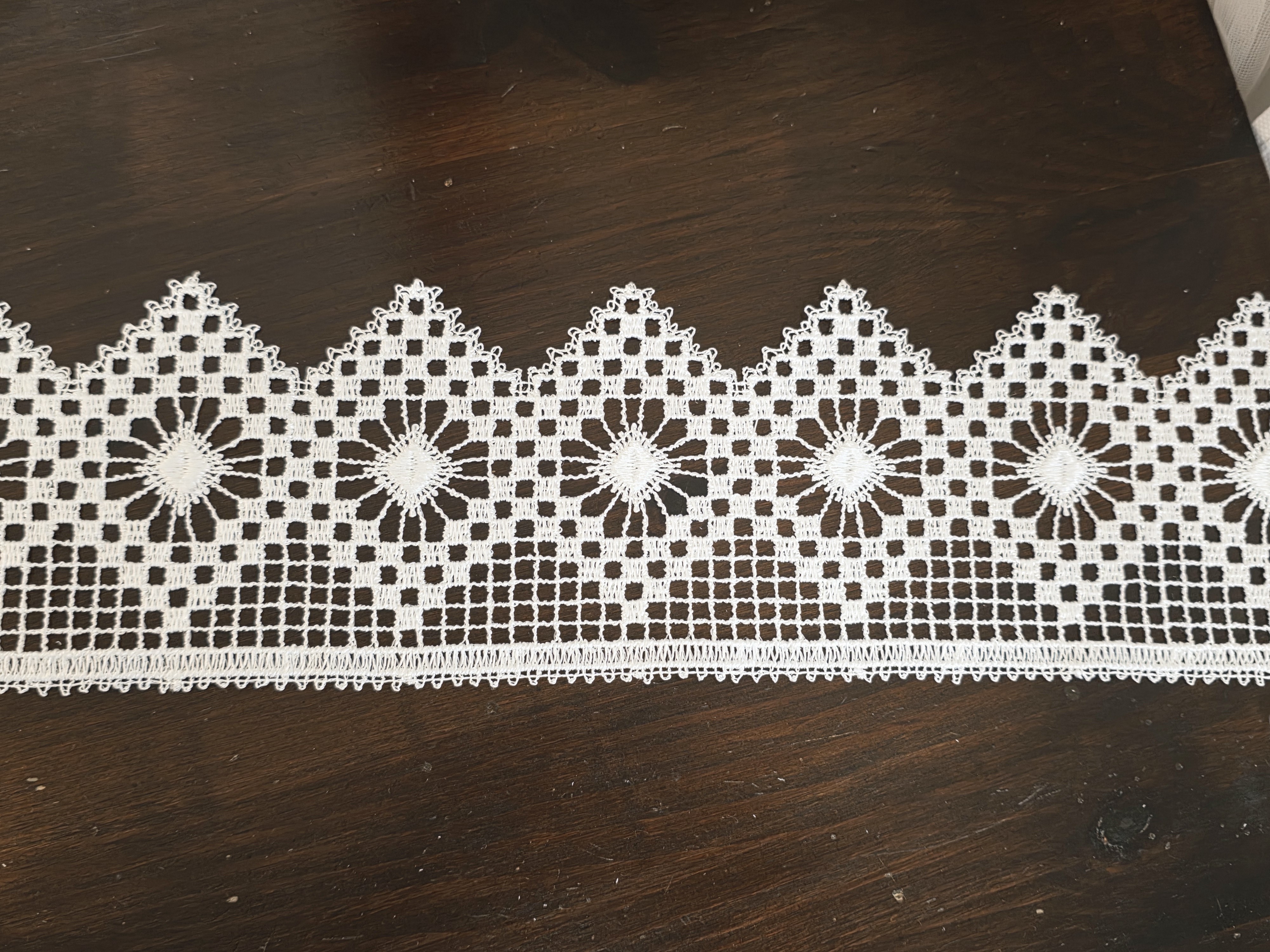 Apportez une touche d’élégance à vos créations grâce à ce superbe galon brodé style guipure, orné d’un motif ajouré en quadrillage et de fleurs finement brodées. Sa bordure supérieure en pointes festonnées lui donne un charme raffiné et un rendu très décoratif.