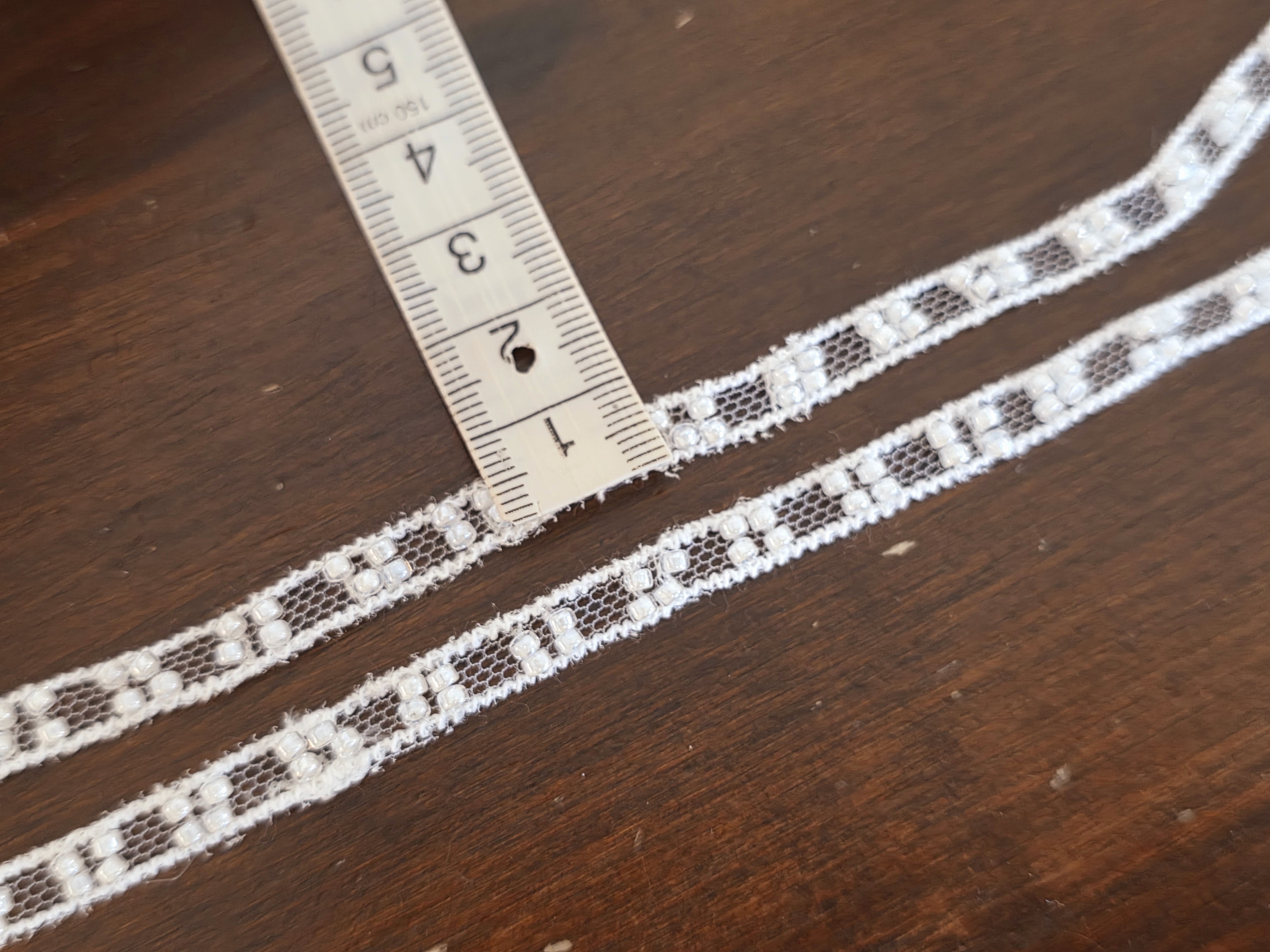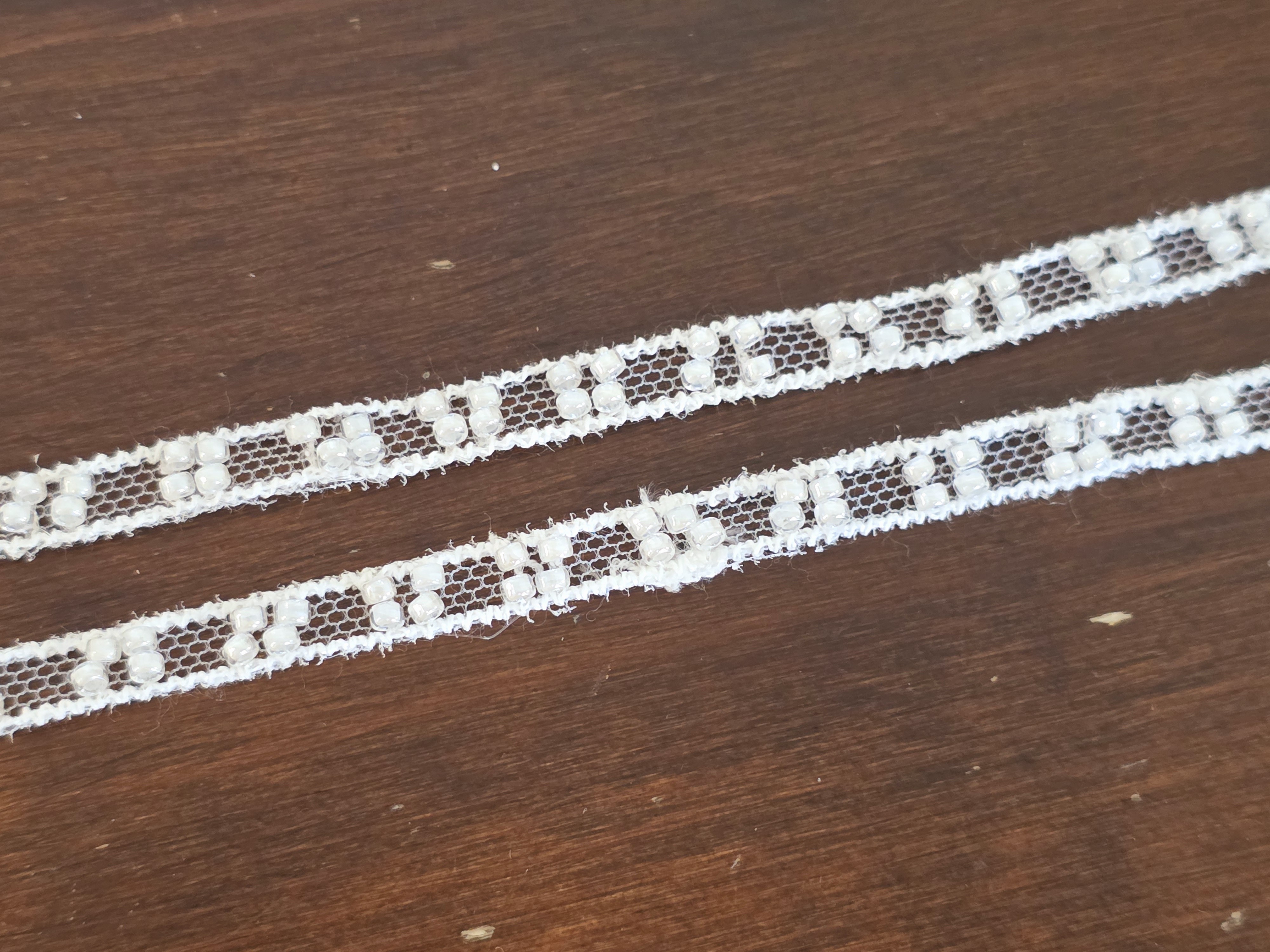 Ajoutez une touche de délicatesse à vos projets avec ce magnifique galon en dentelle blanche décoré de petites perles. Parfait pour les créations raffinées : robes, accessoires, customisation, scrapbooking, décorations de mariage, lingerie ou travaux manuels.
