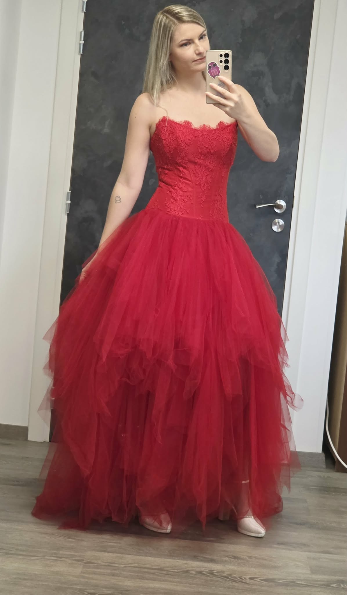 Superbe robe de mariée rouge en mouchoirs de tulle et dentelle.