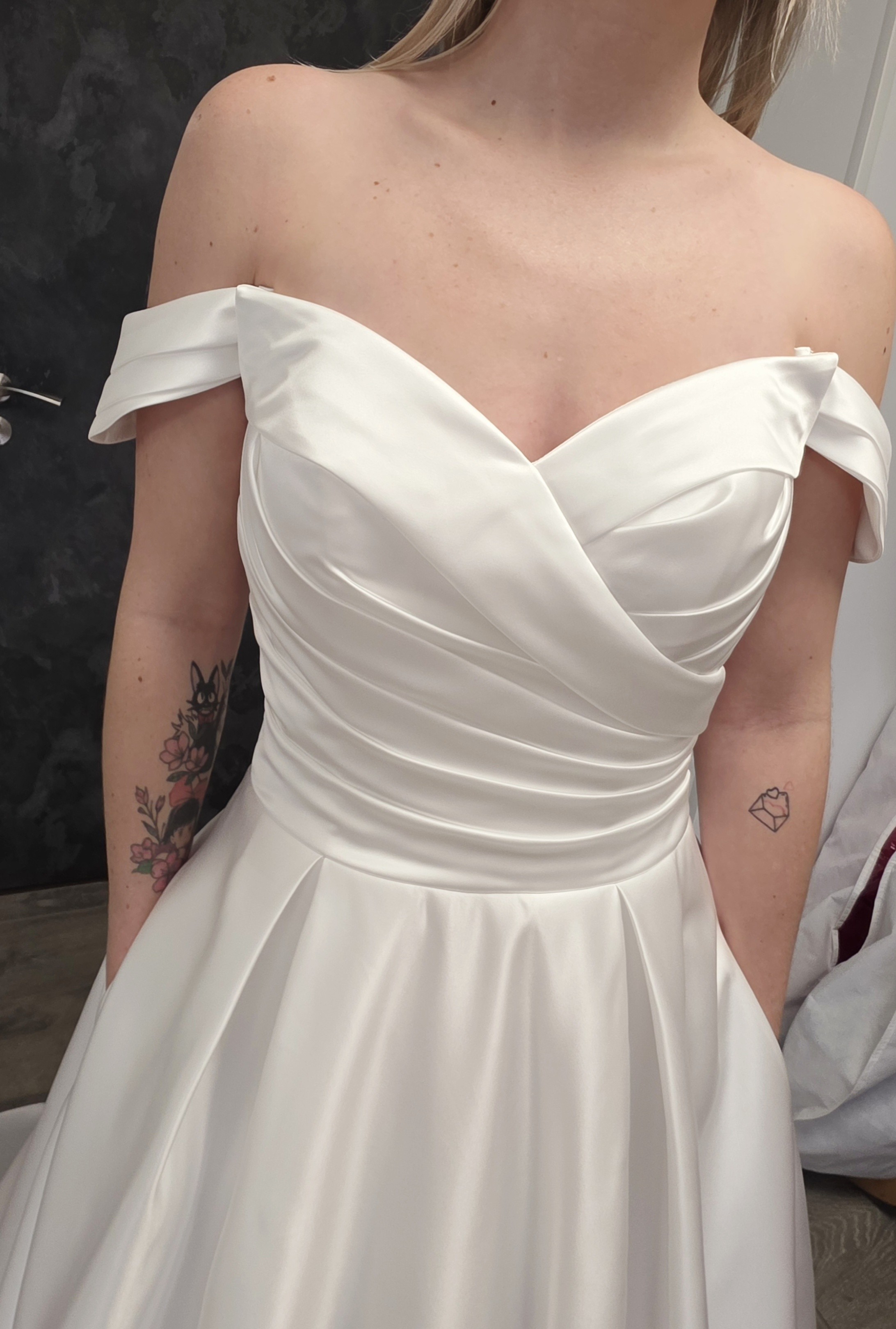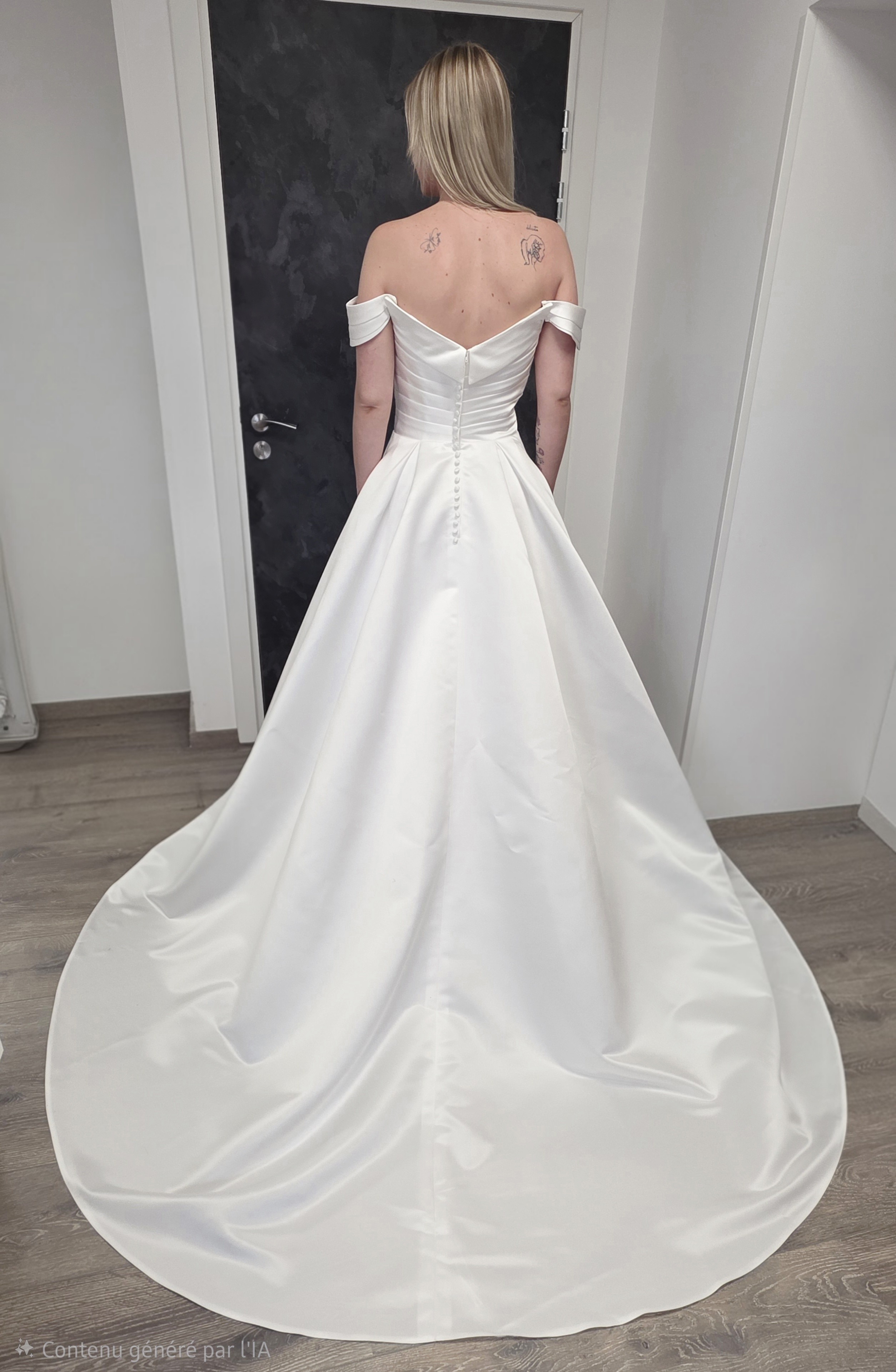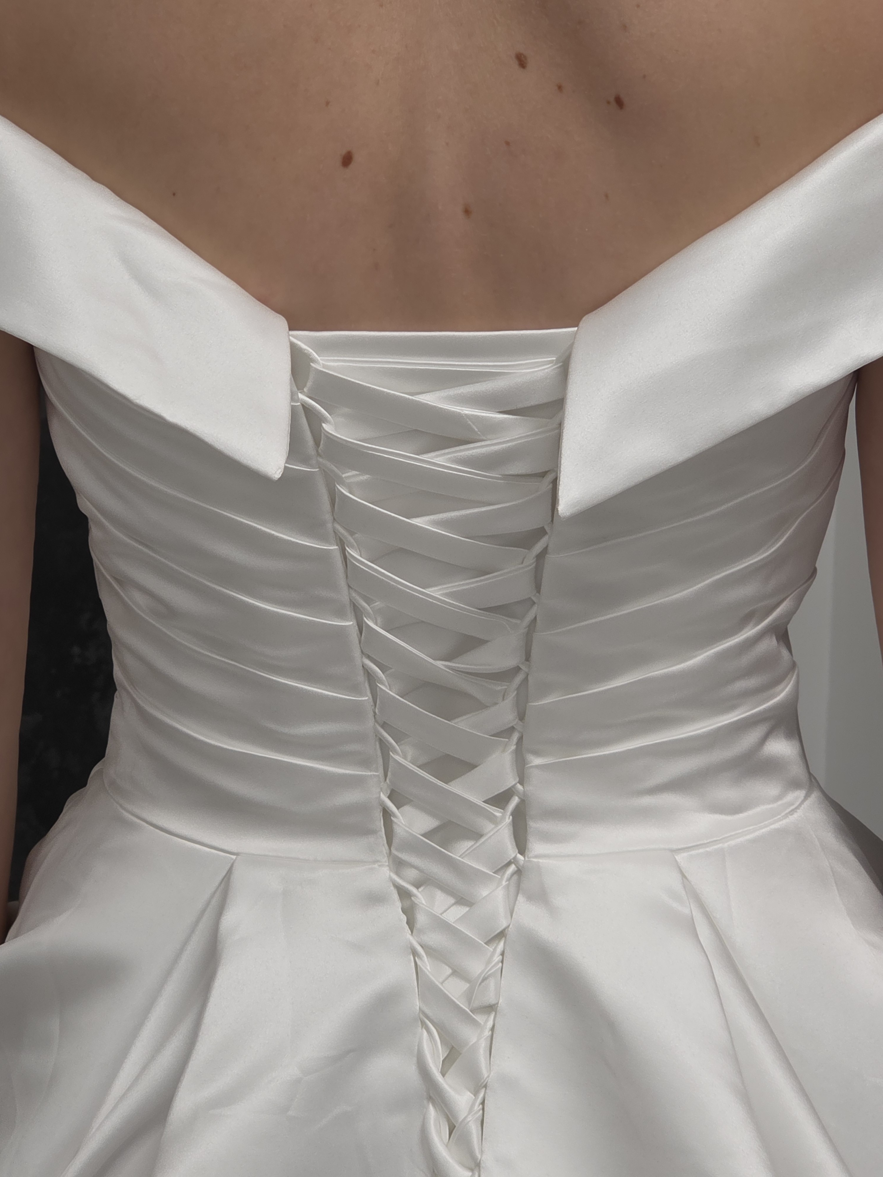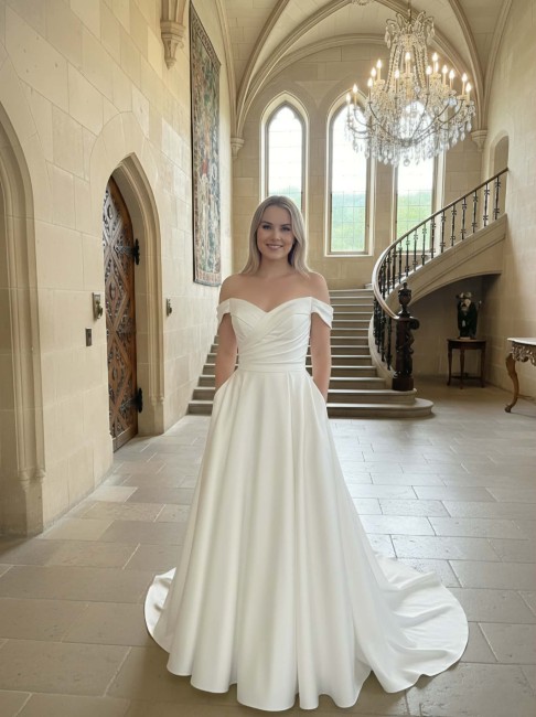 Robe de mariée satin ivoire – Bustier princesse trapèze petit volume – Bardot avec manches amovibles – Train – Zip et boutons ou Laçage – Sur commande