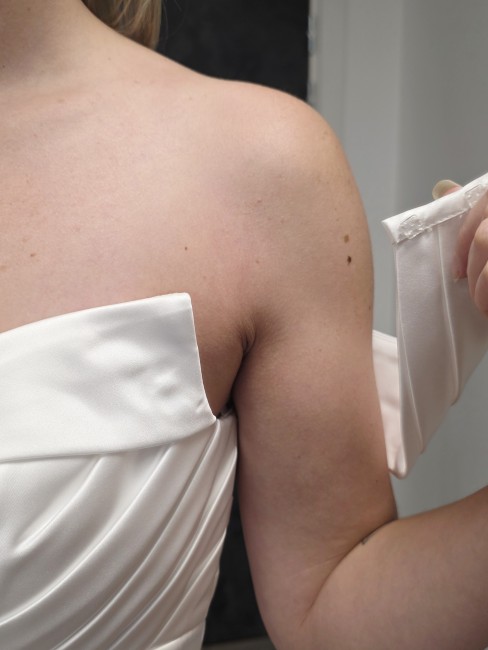 Le col Bardot dévoile délicatement les épaules, tandis que les manchettes amovibles fixées par boutons-pressions permettent de porter la robe en bustier ou avec les bretelles Bardot, selon votre envie.