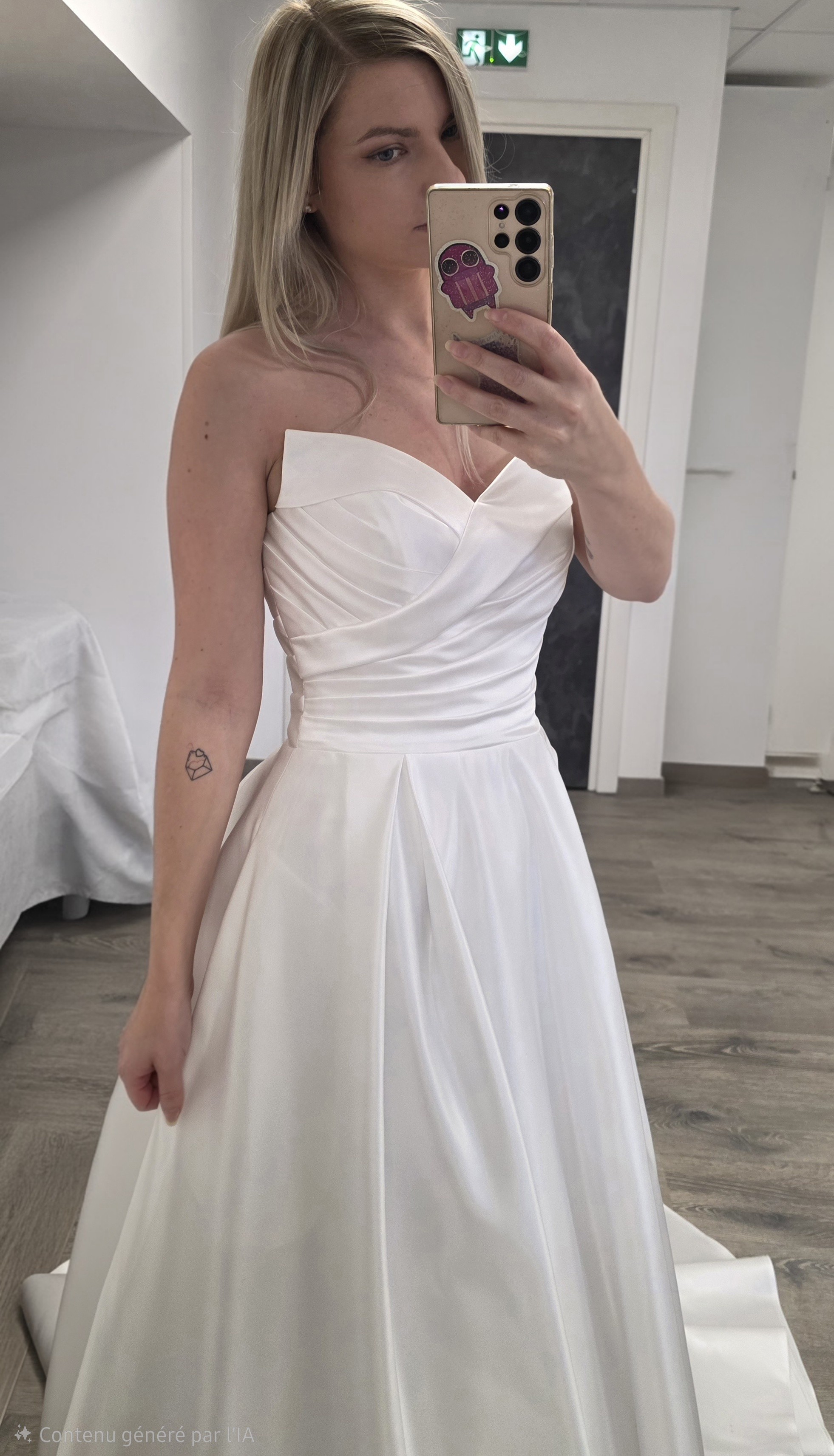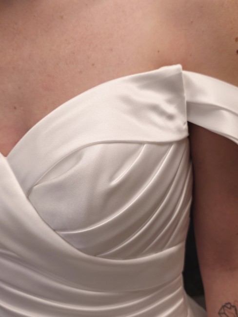Cette élégante robe de mariée en satin ivoire clair sublime la silhouette grâce à sa forme bustier princesse trapèze petit volume, pour une allure romantique, féminine et moderne.
