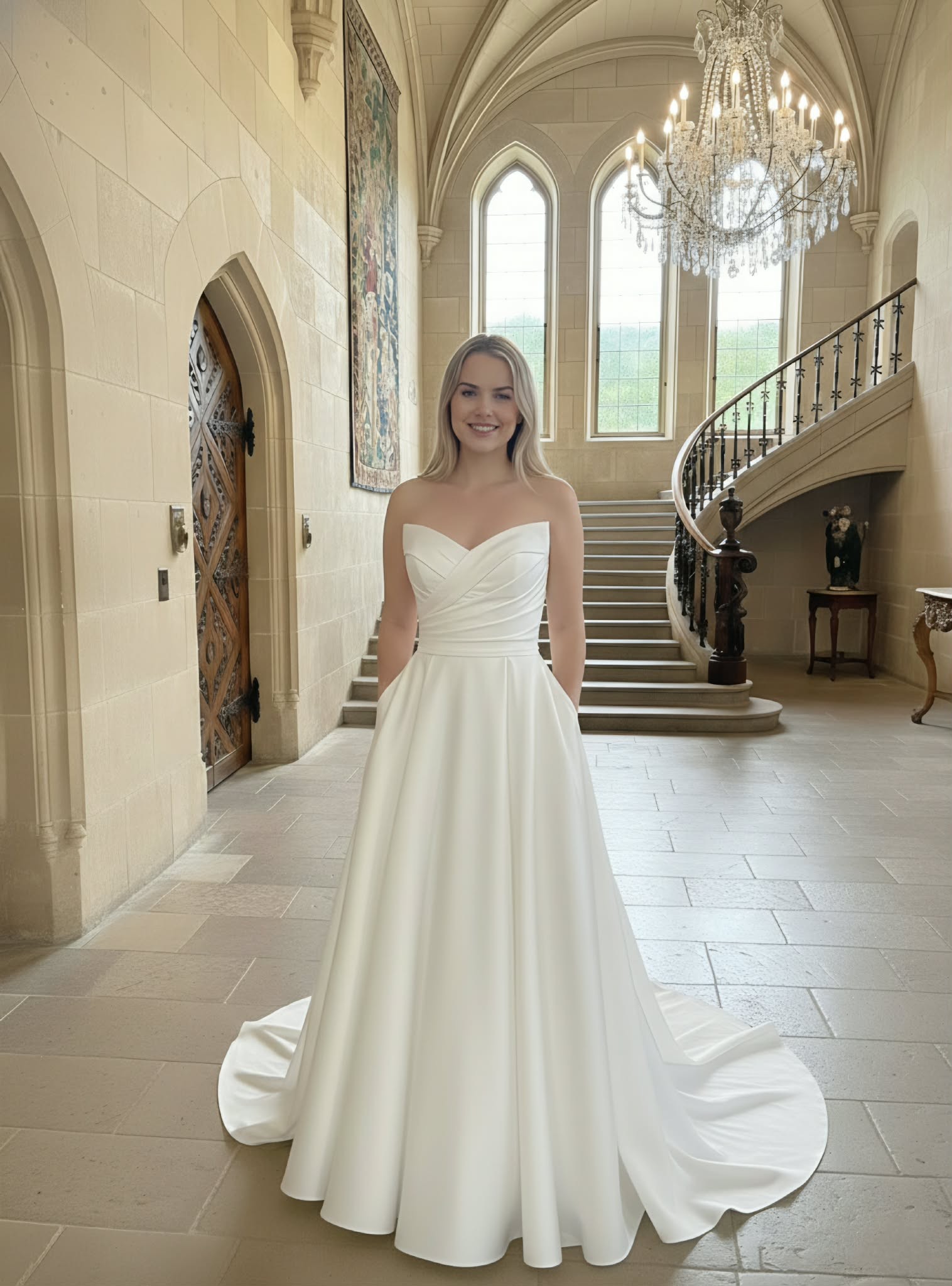 Robe de mariée en satin ivoire clair – style princesse trapèze à petit volume avec traîne