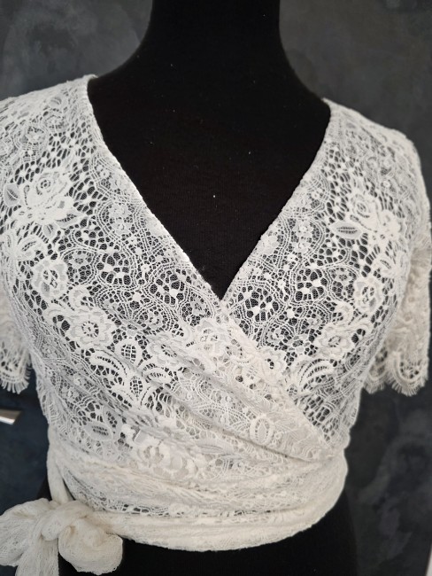 Ce top en dentelle cache-cœur ivoire clair est l’accessoire idéal pour apporter une touche bohème et raffinée à votre tenue de mariage. Léger et élégant, il se porte parfaitement sur une robe de mariée simple ou fluide.