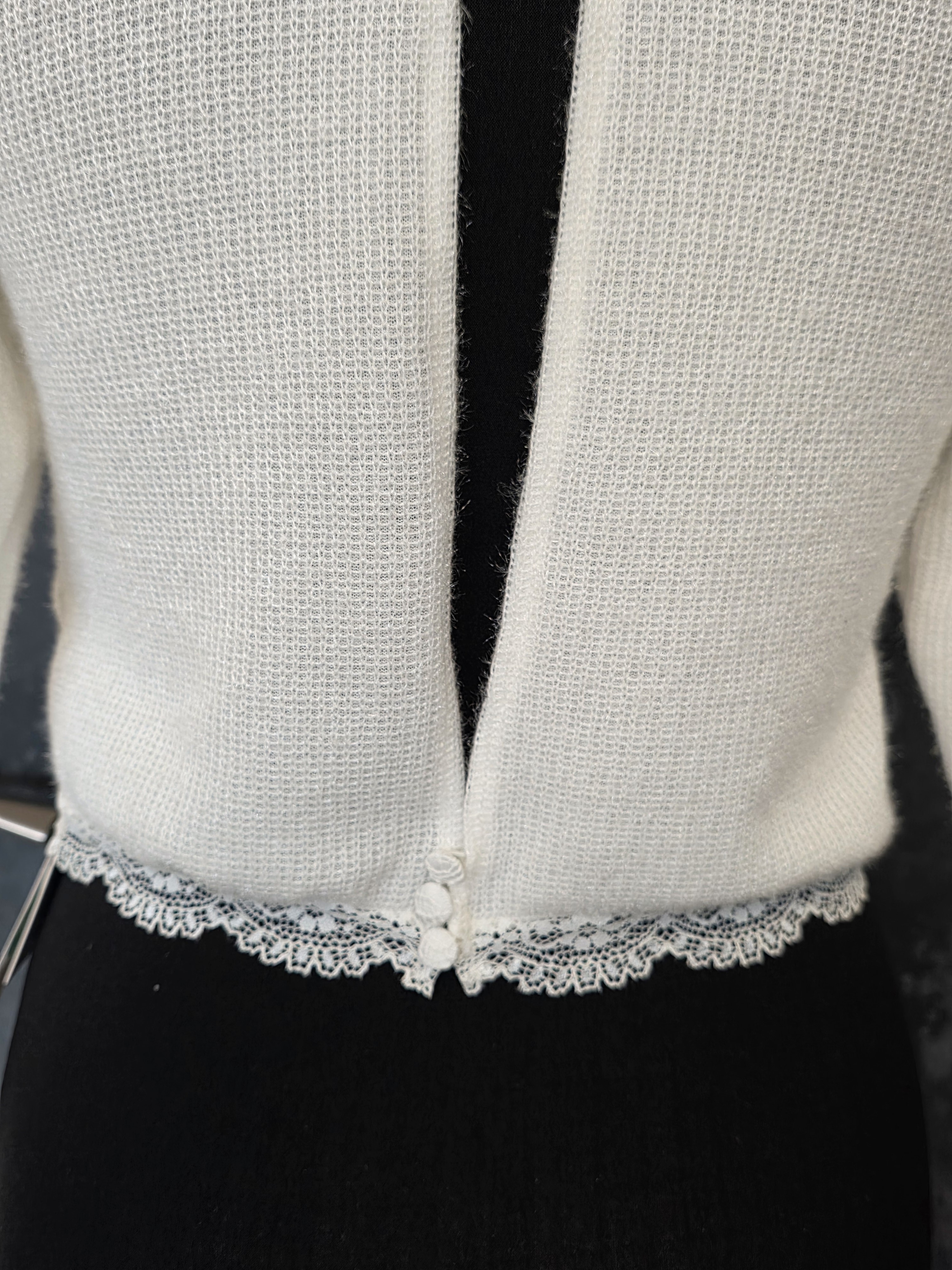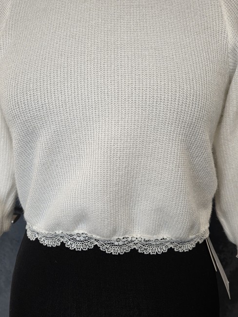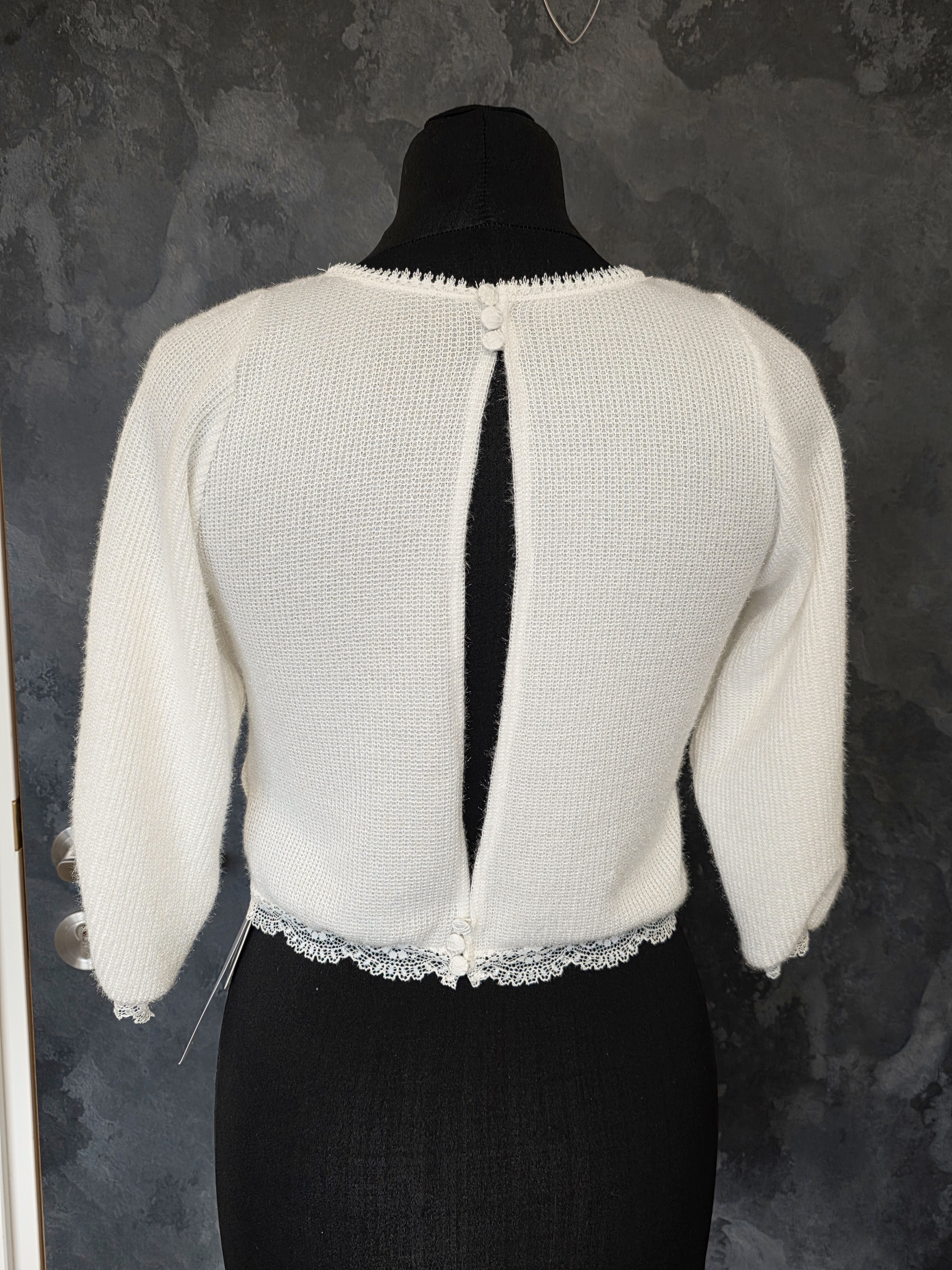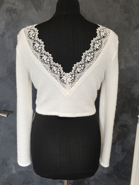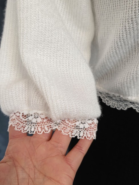 Sa maille légère et moelleuse enveloppe délicatement les épaules tout en conservant une silhouette raffinée. Les finitions en dentelle aux poignets, à l’encolure et à la base ajoutent une touche romantique subtile.