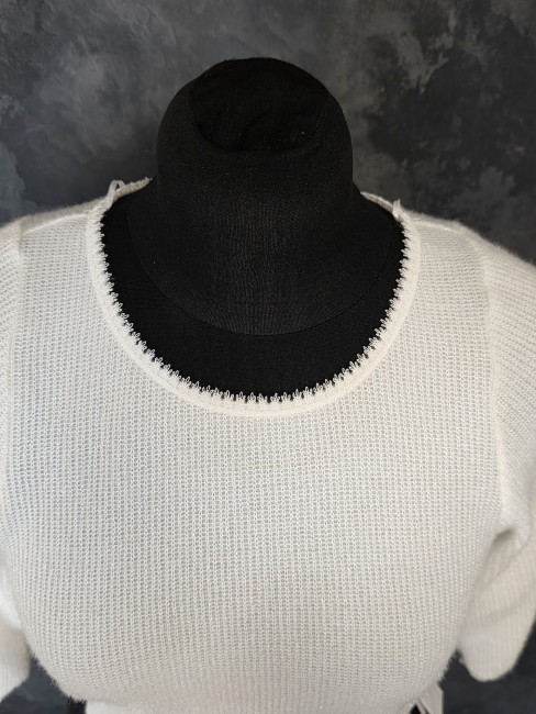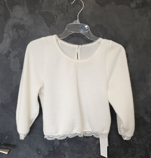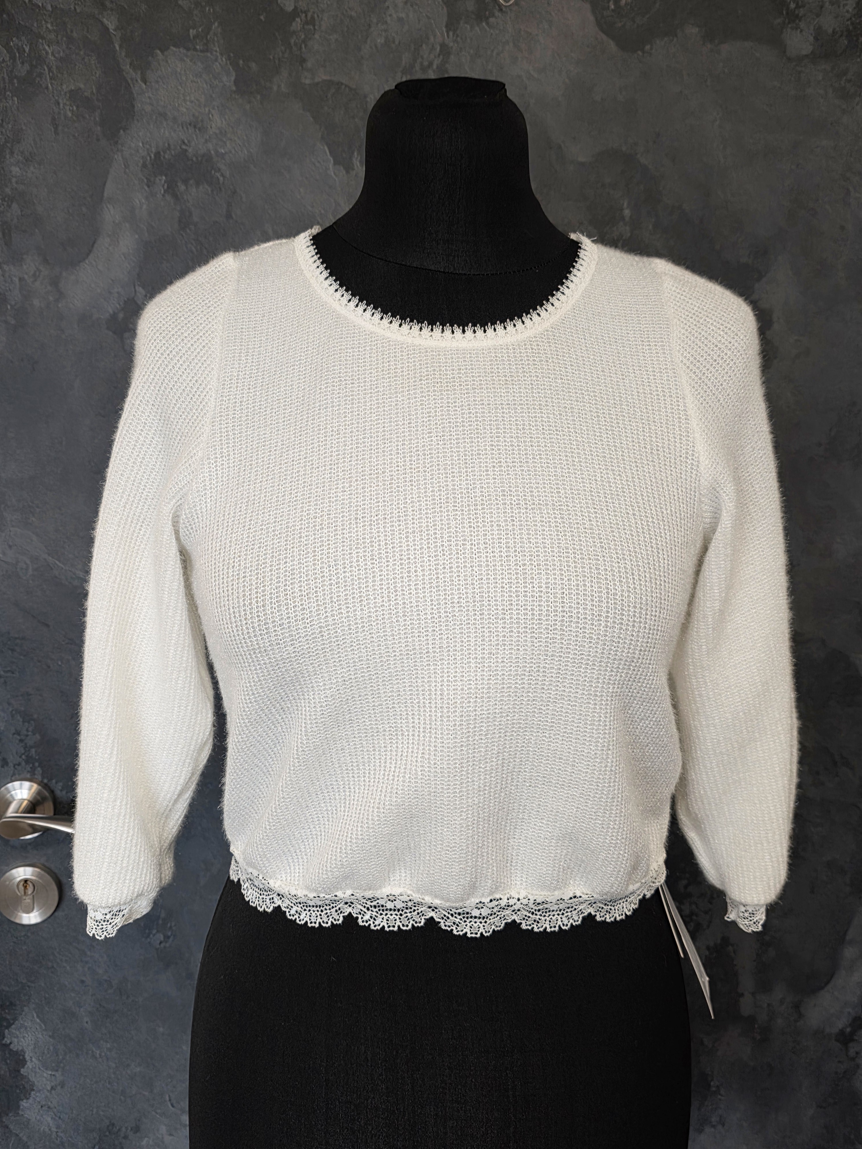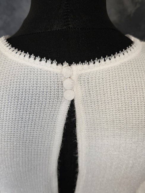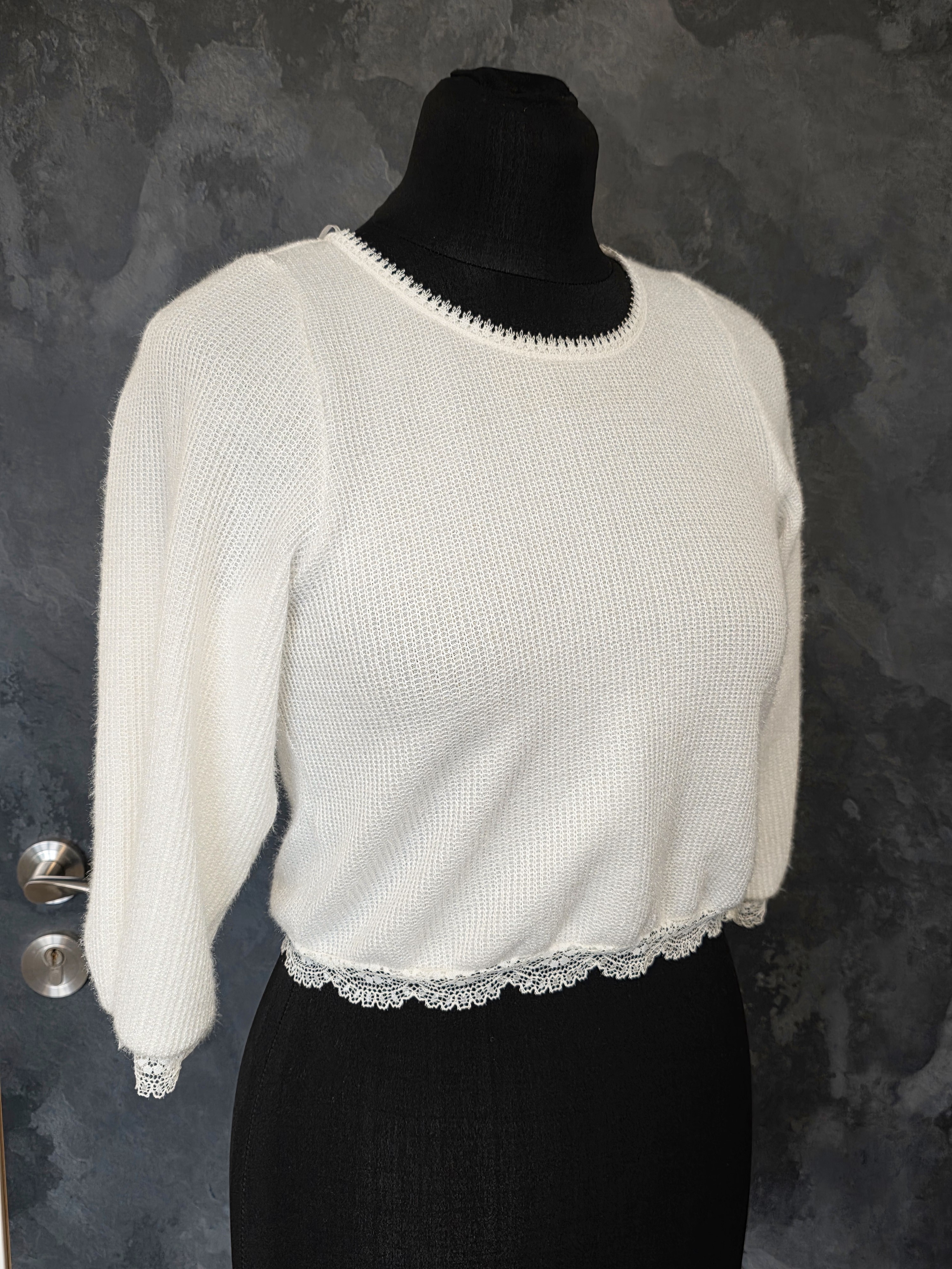 Sa maille légère et moelleuse enveloppe délicatement les épaules tout en conservant une silhouette raffinée. Les finitions en dentelle aux poignets, à l’encolure et à la base ajoutent une touche romantique subtile.