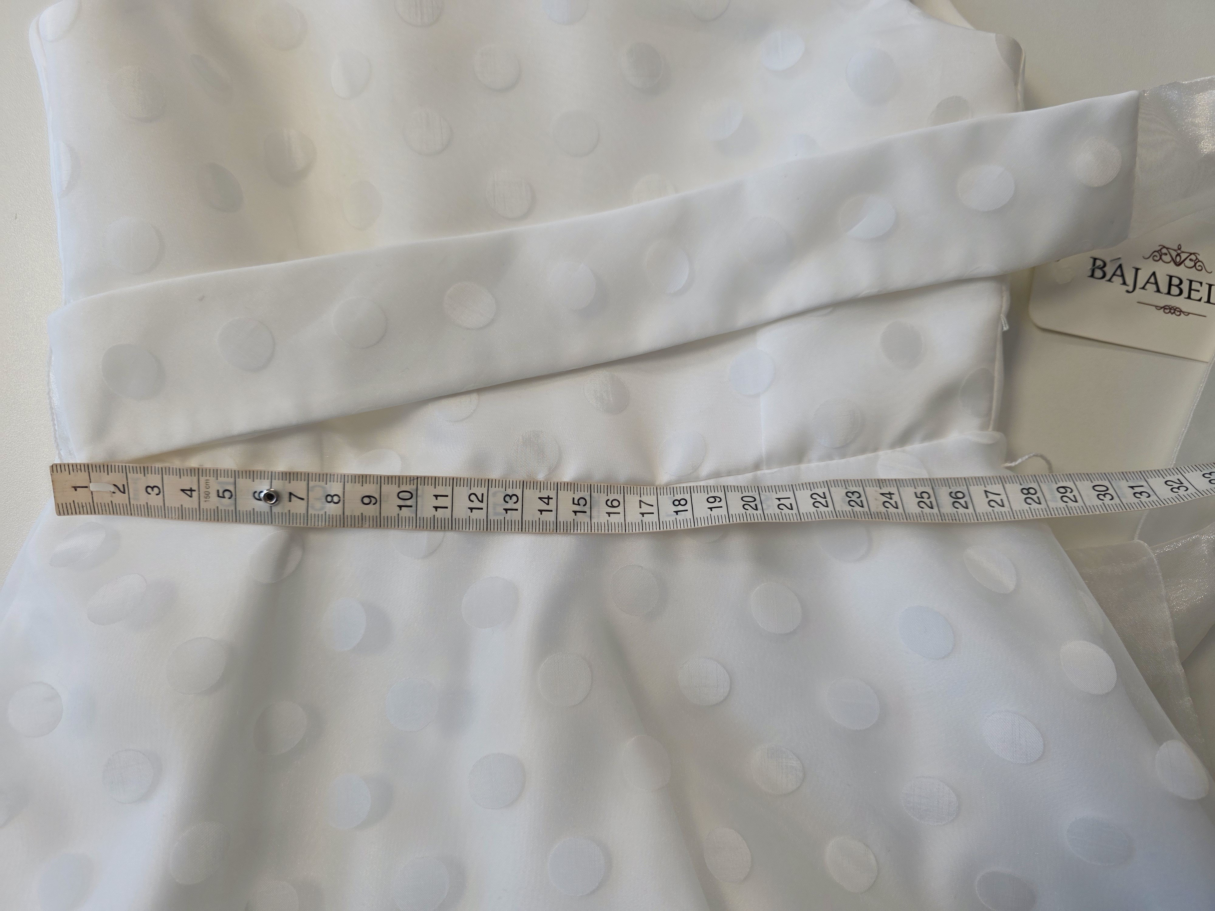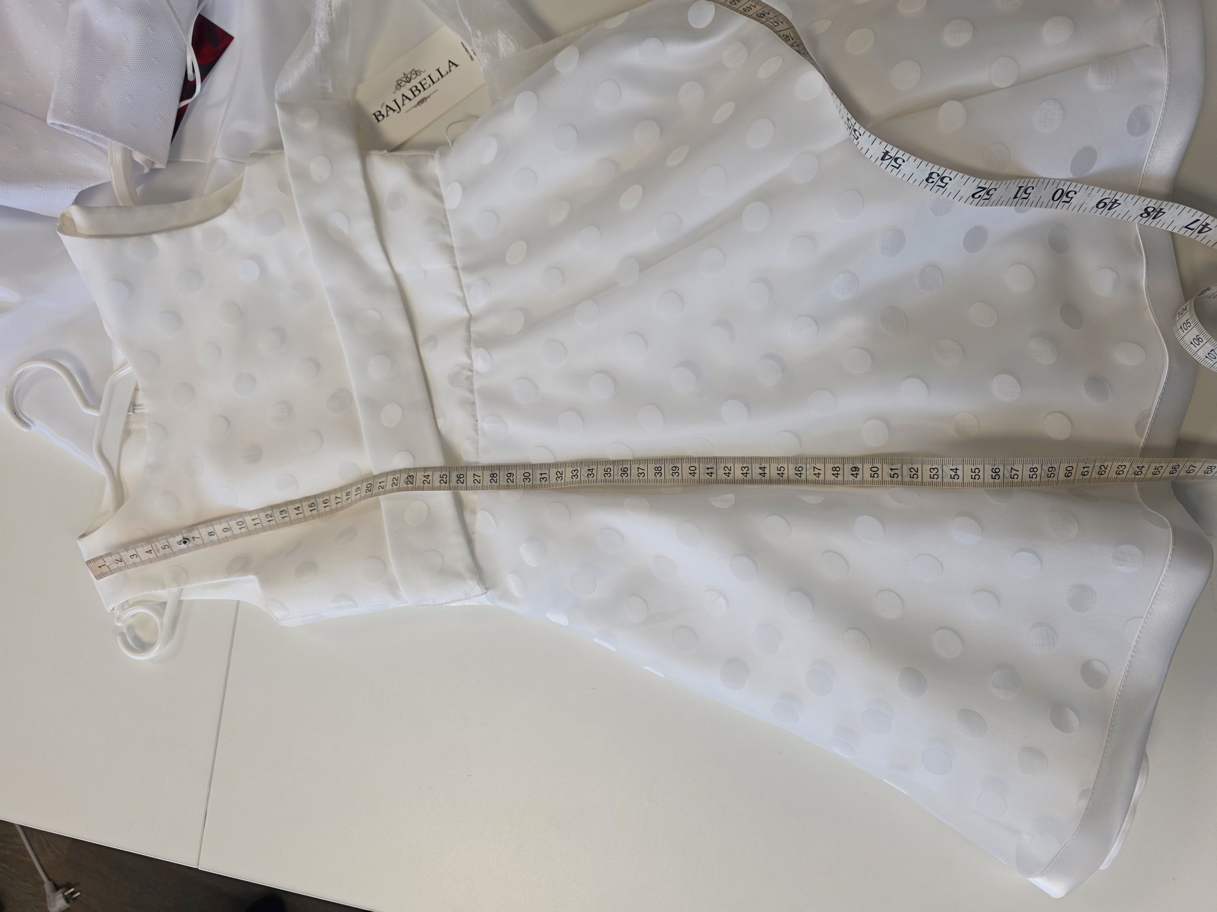 Organza léger à pois, doublée, biais de satin sur le bas de la jupe.