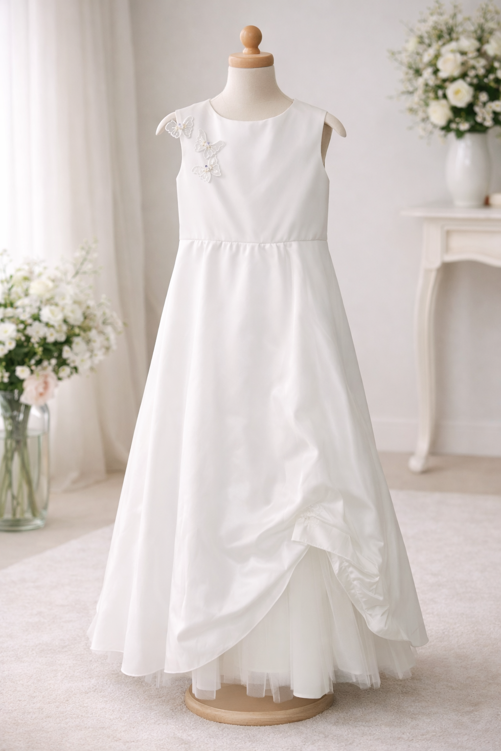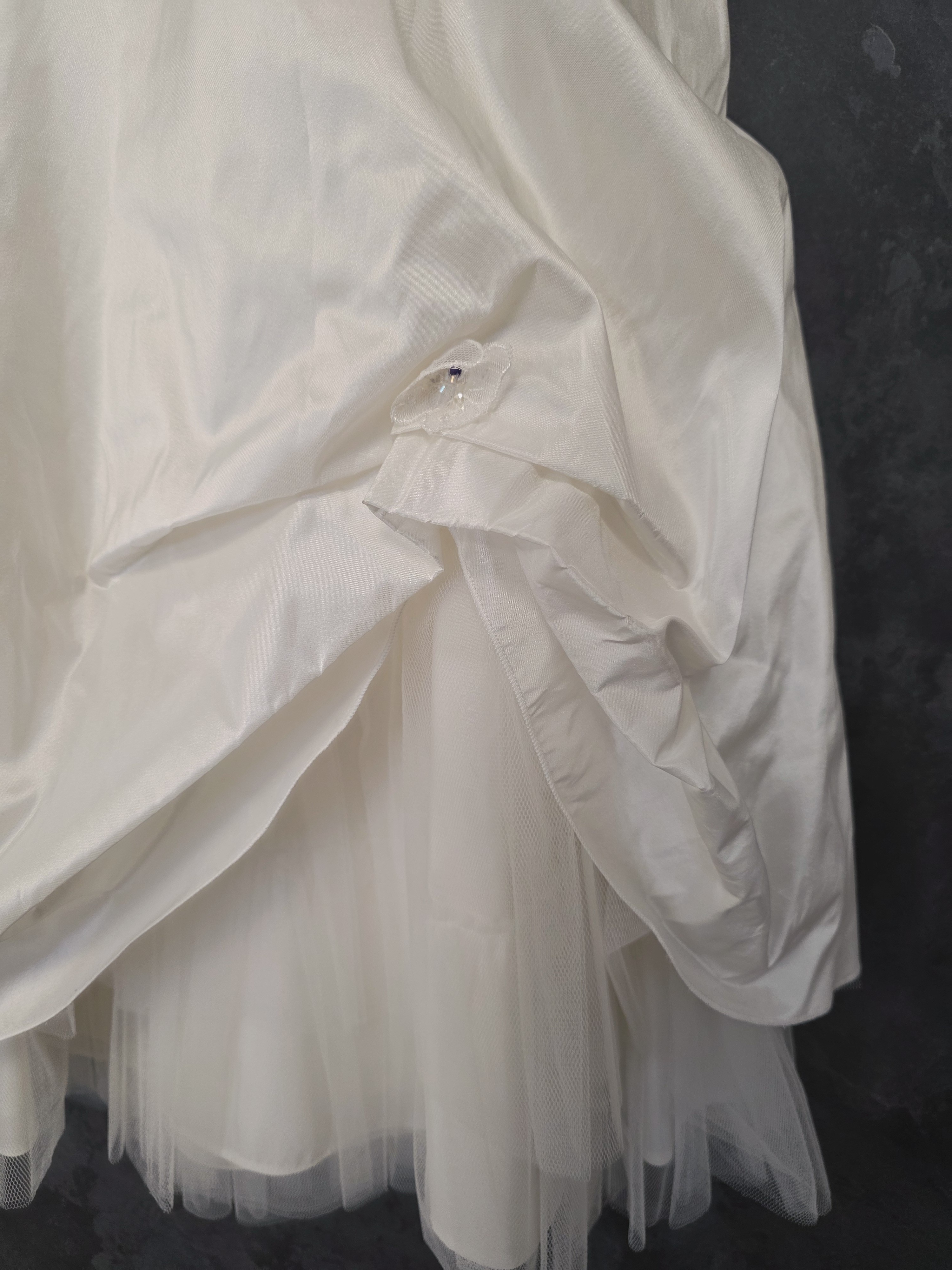 taille 8 ans, réalisée dans un atelier français en taffetas craquant ivoire, petit volant de tulle dans le bas.