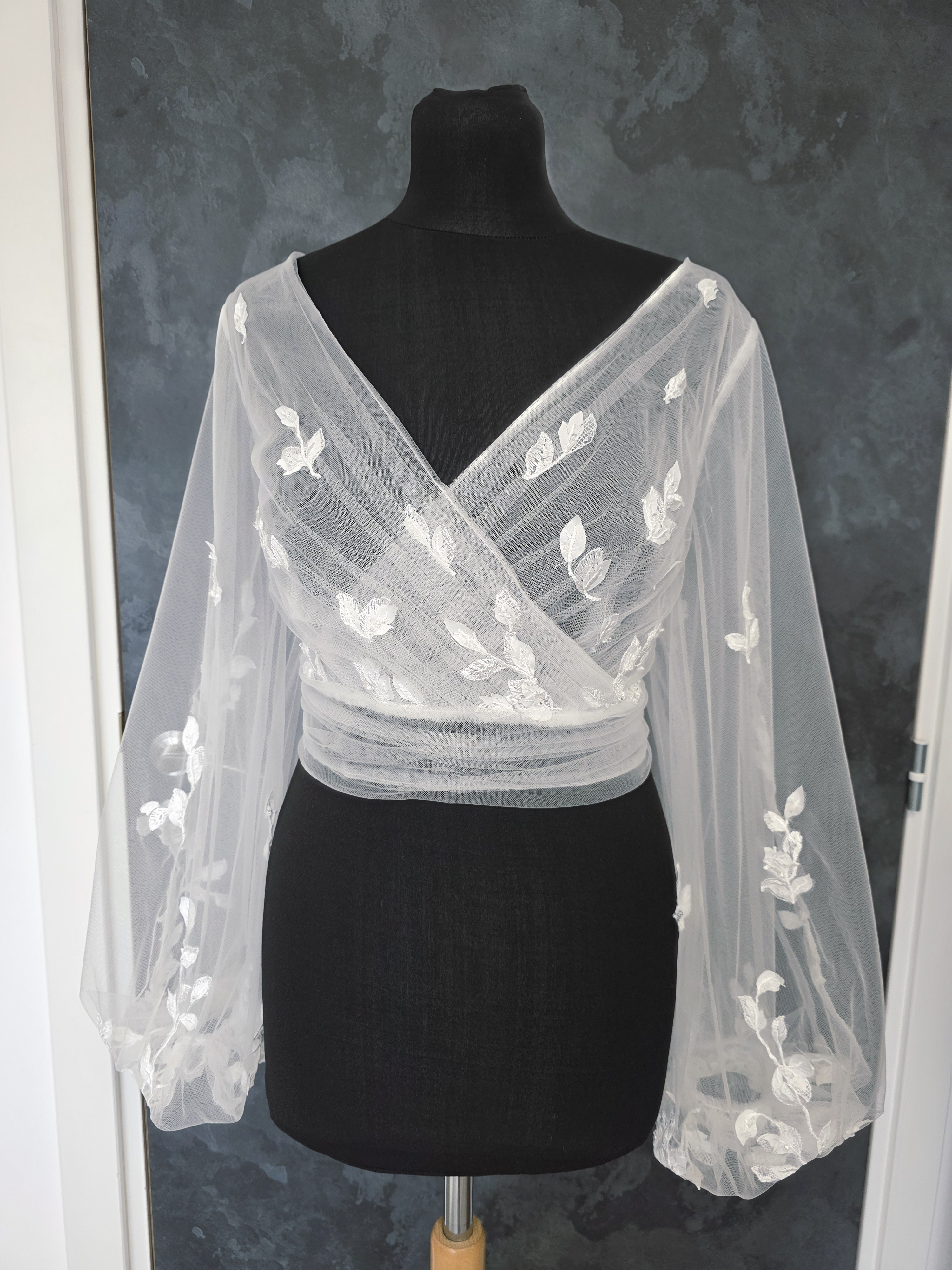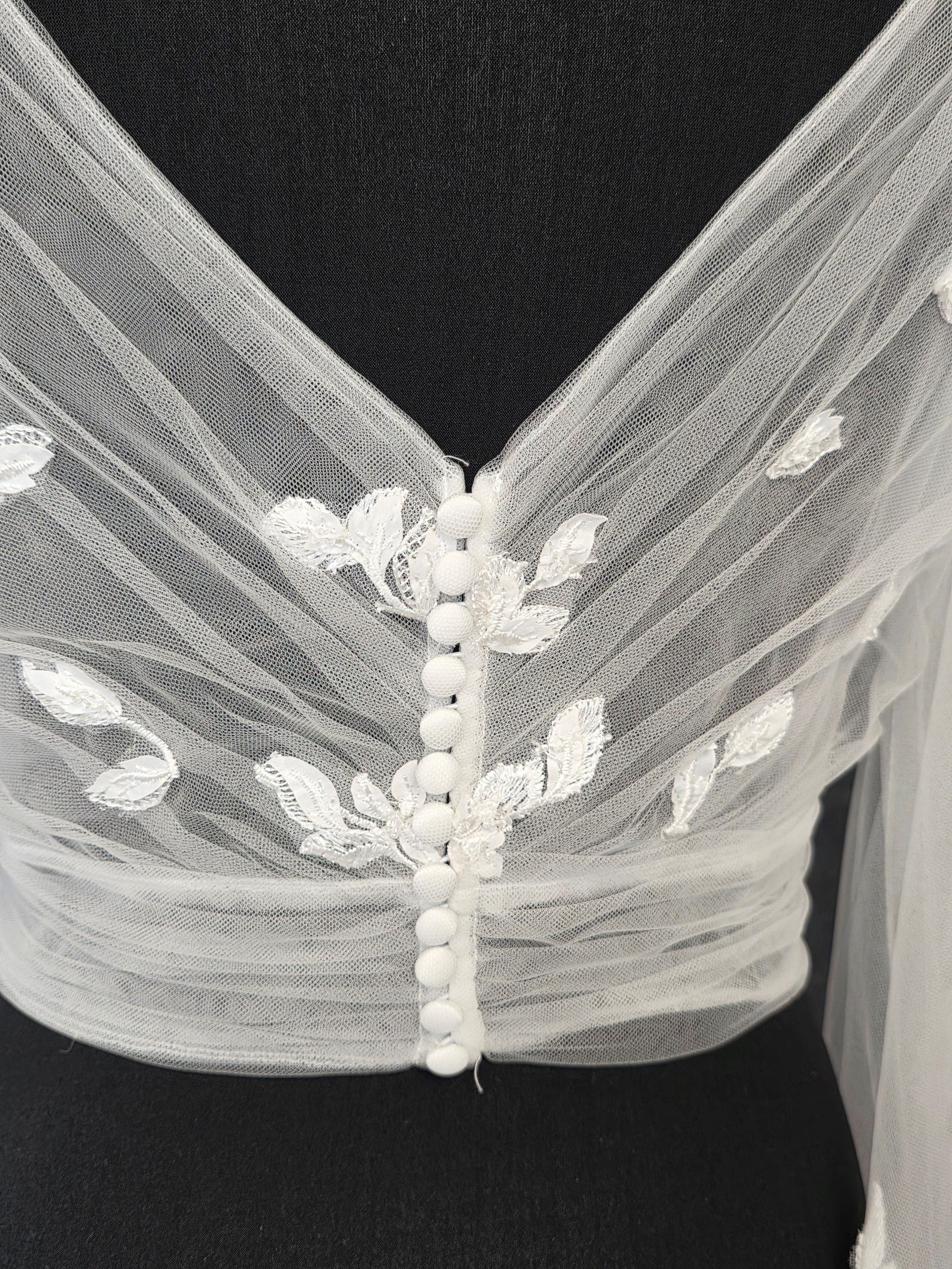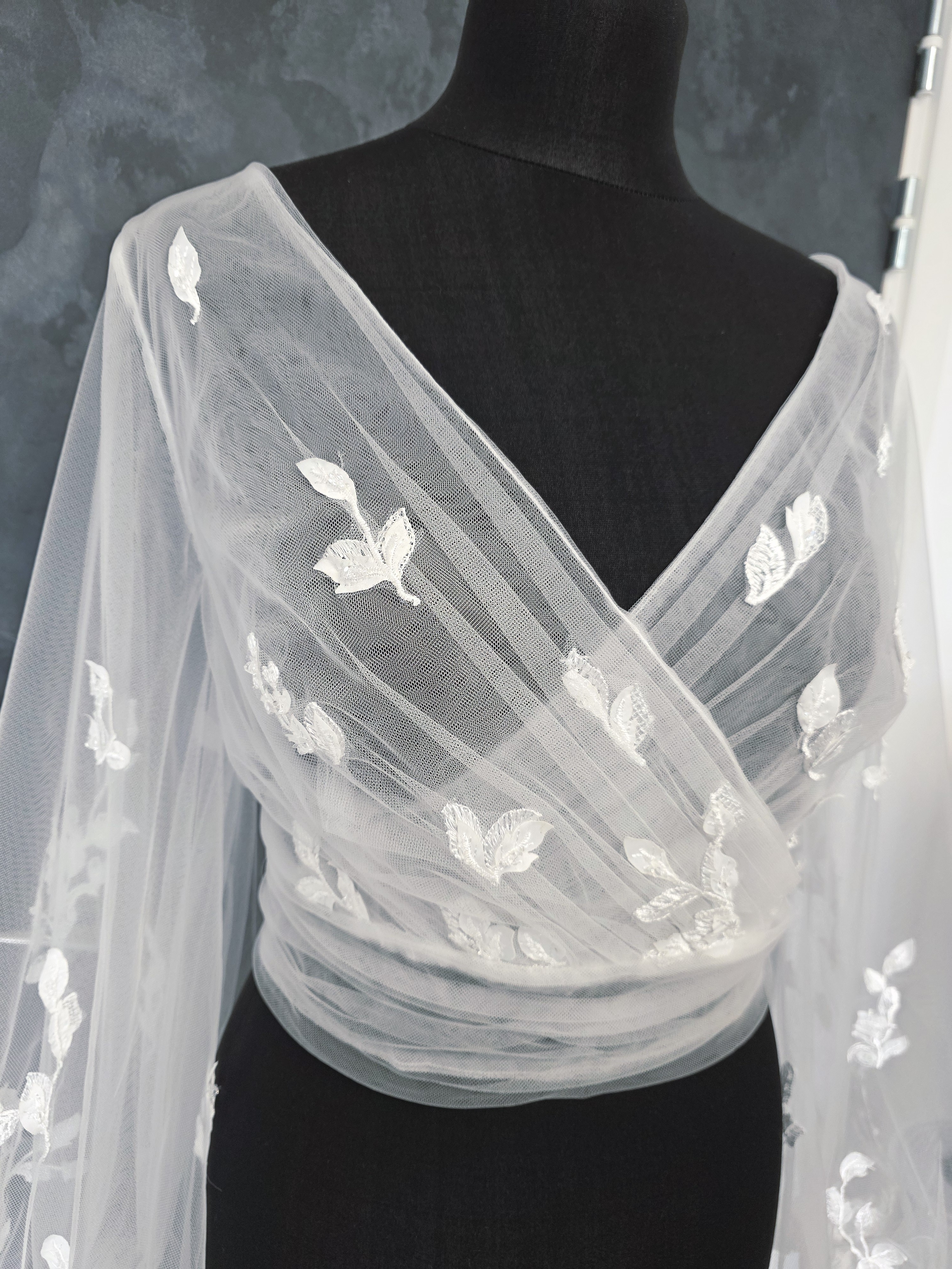 Top pour robe de mariée en tulle ivoire délicatement drapé, orné d’appliqués feuilles brodées.