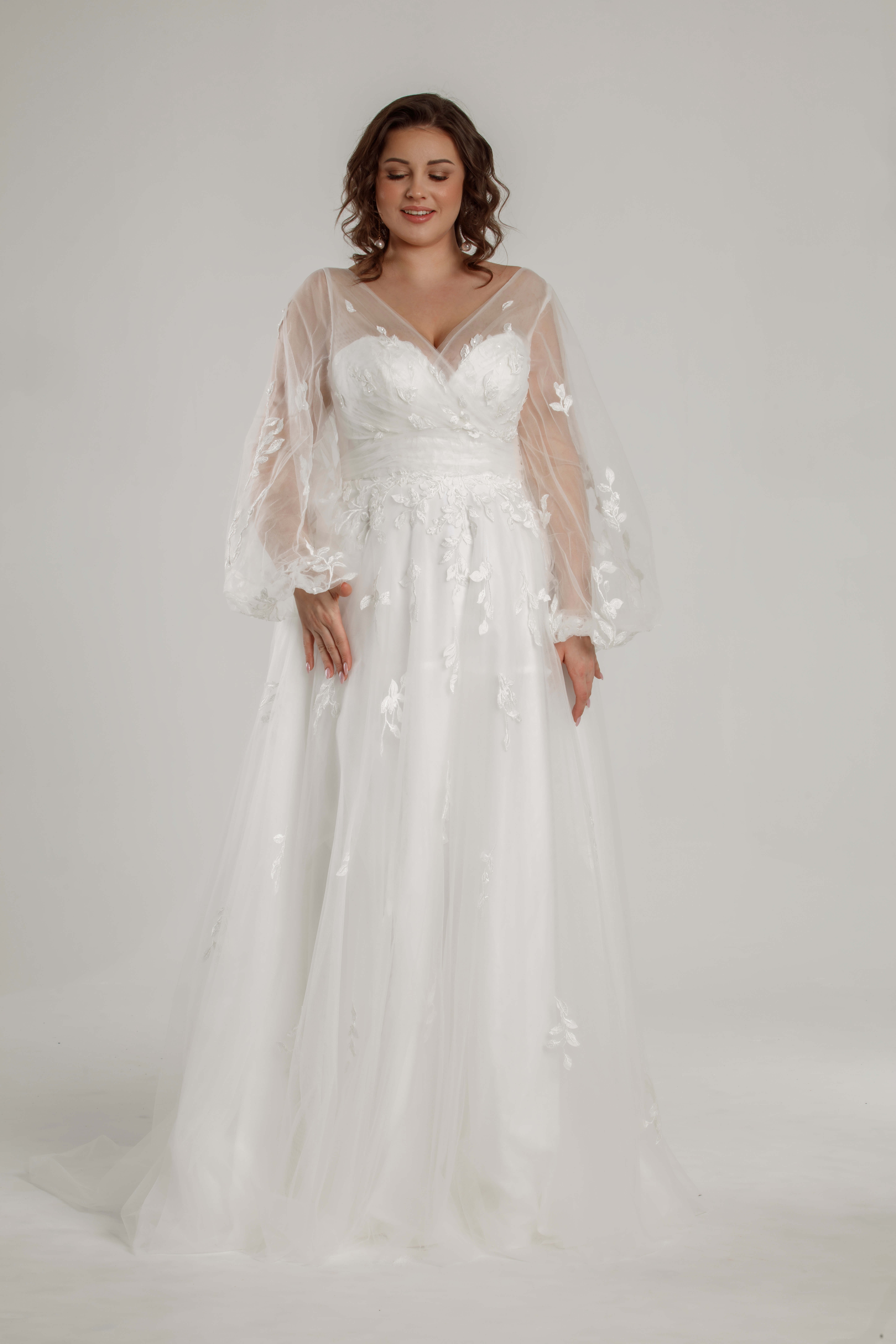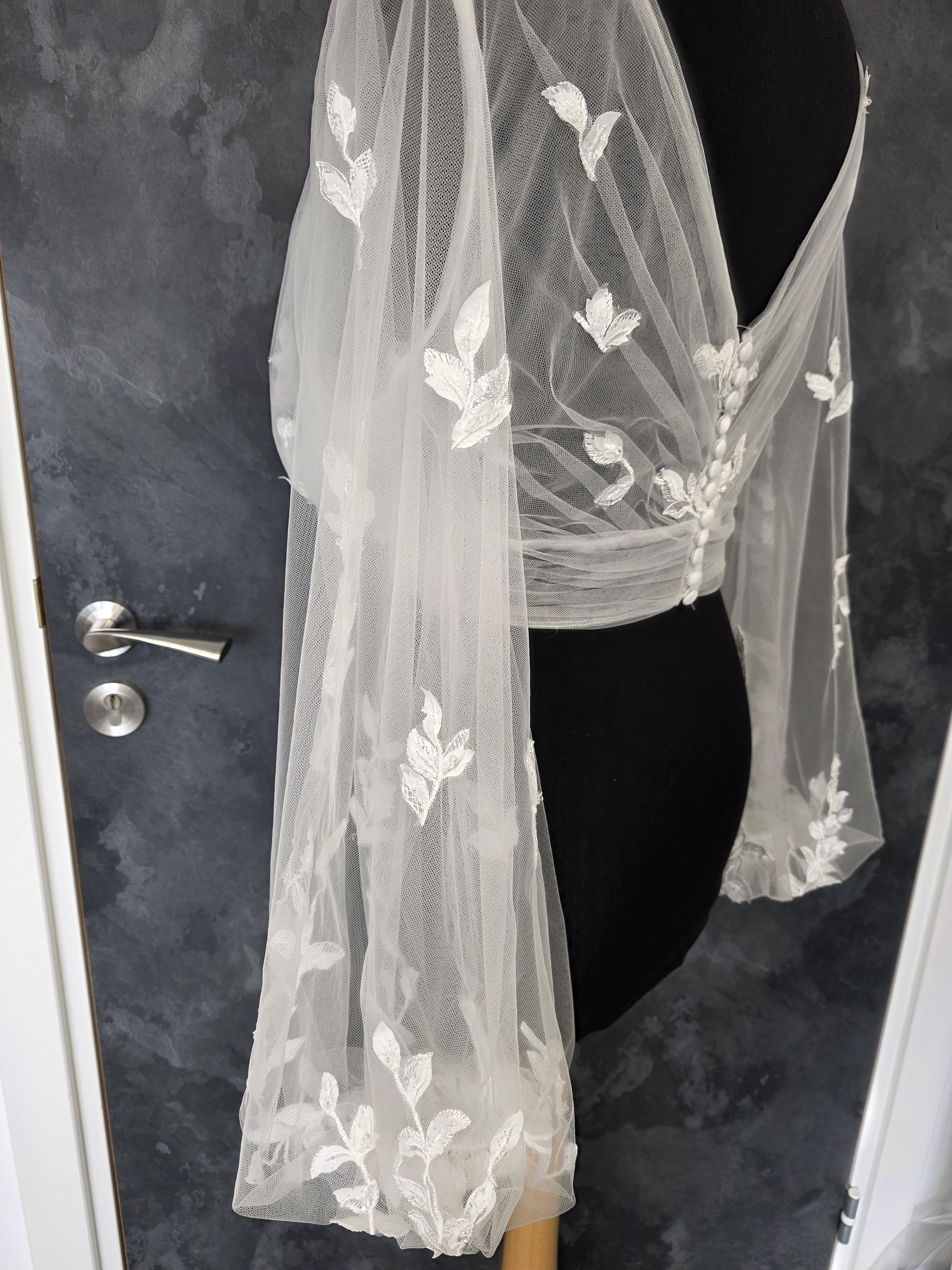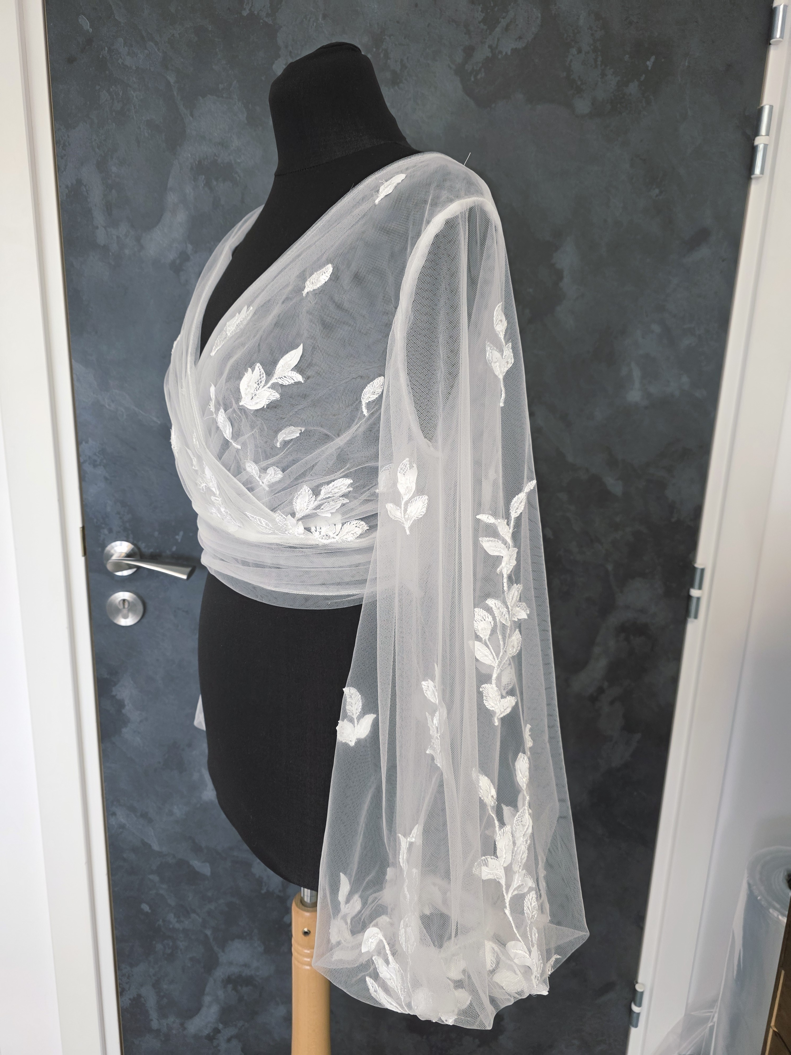 Top pour robe de mariée en tulle ivoire délicatement drapé, orné d’appliqués feuilles brodées.