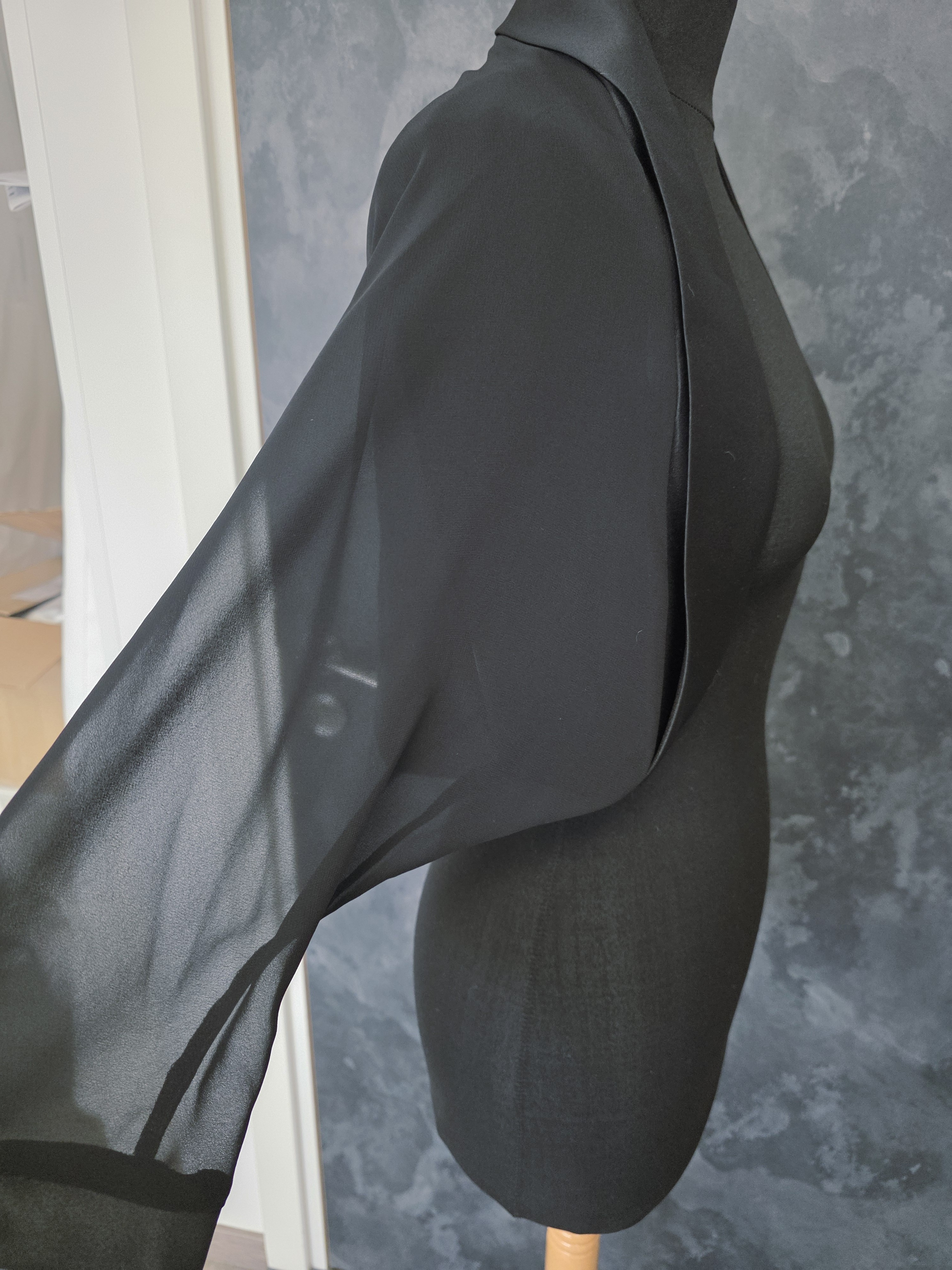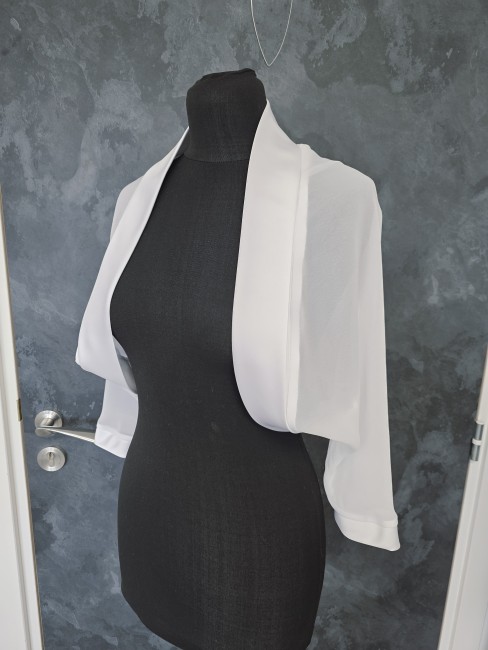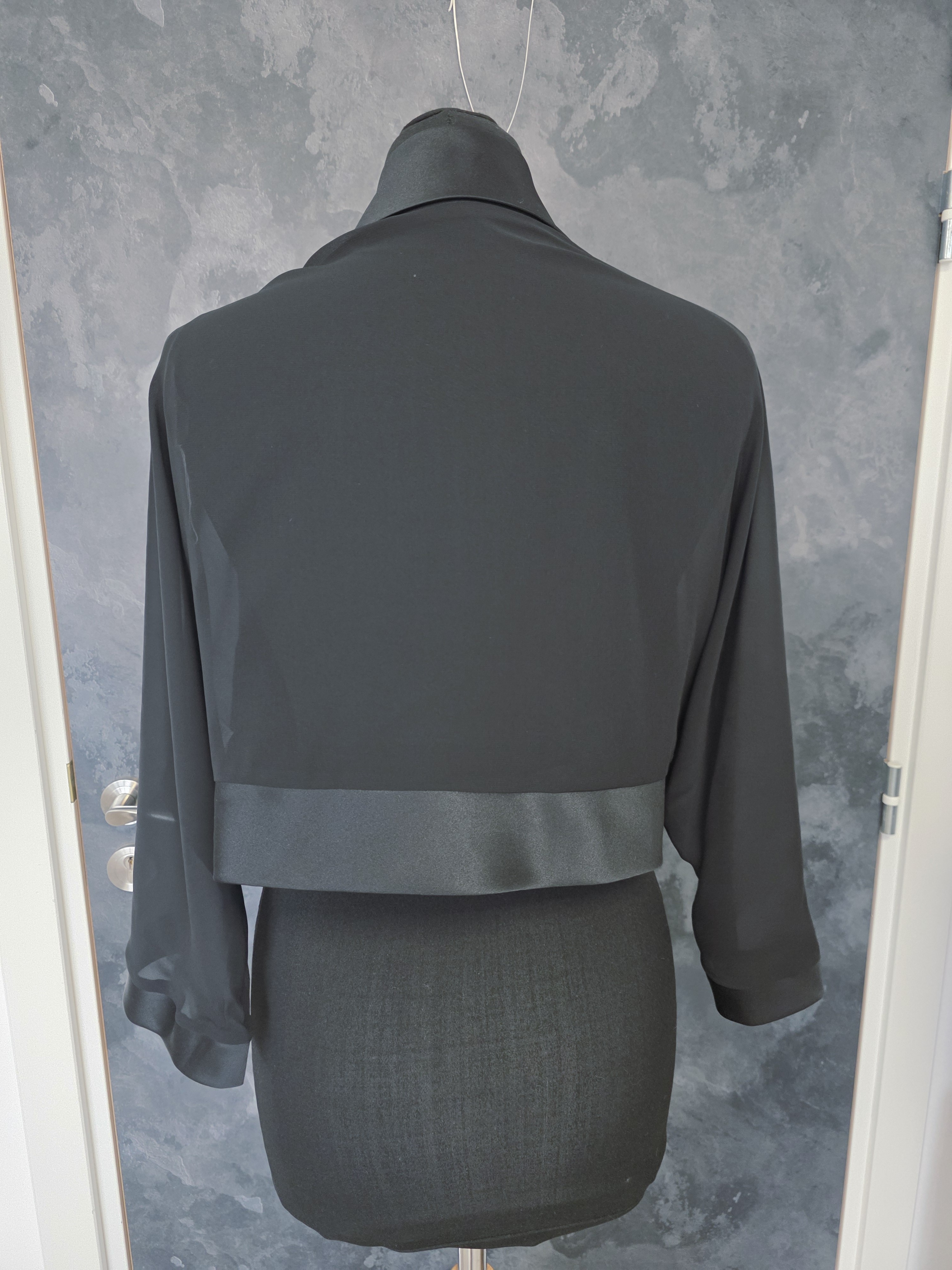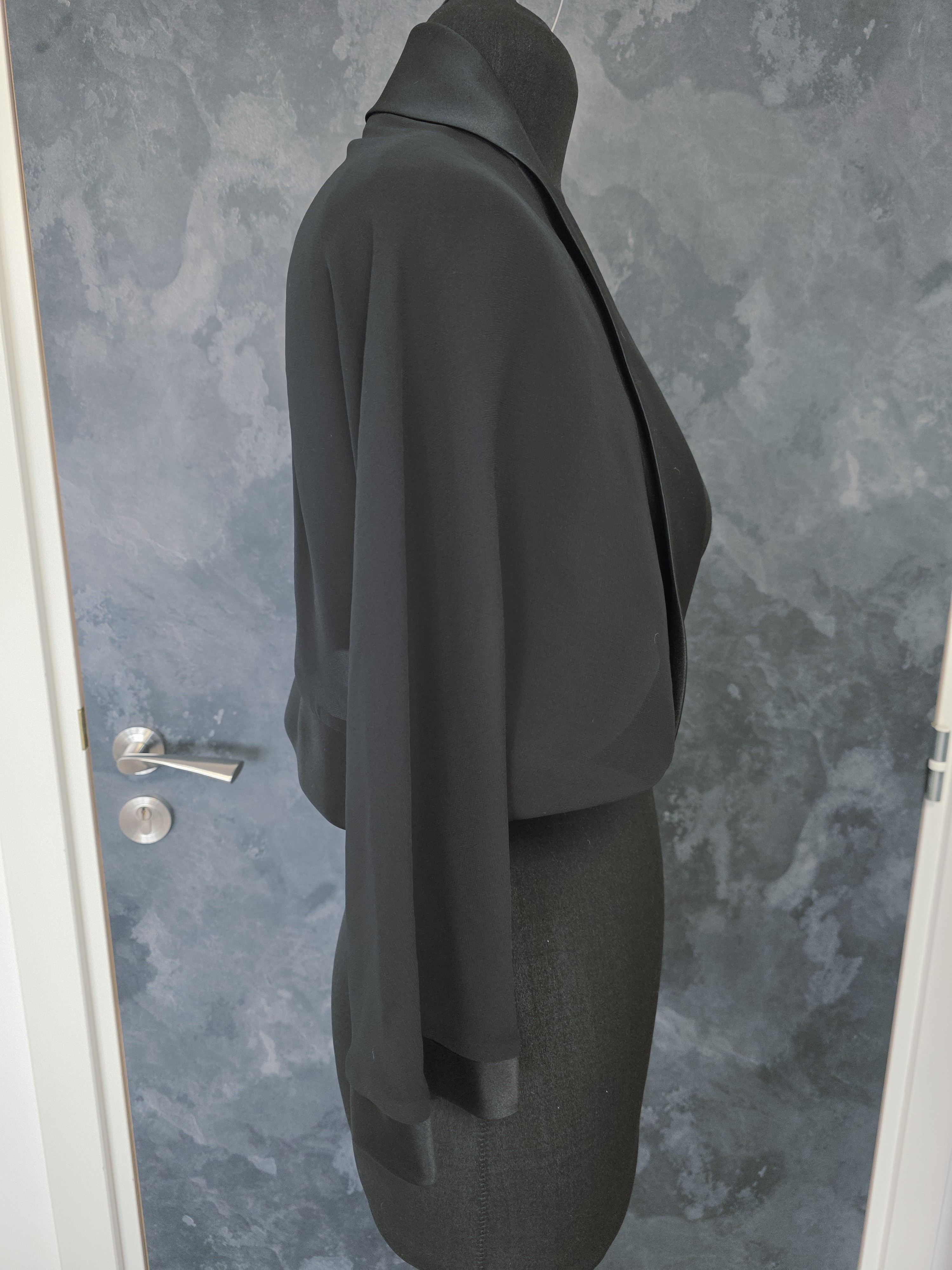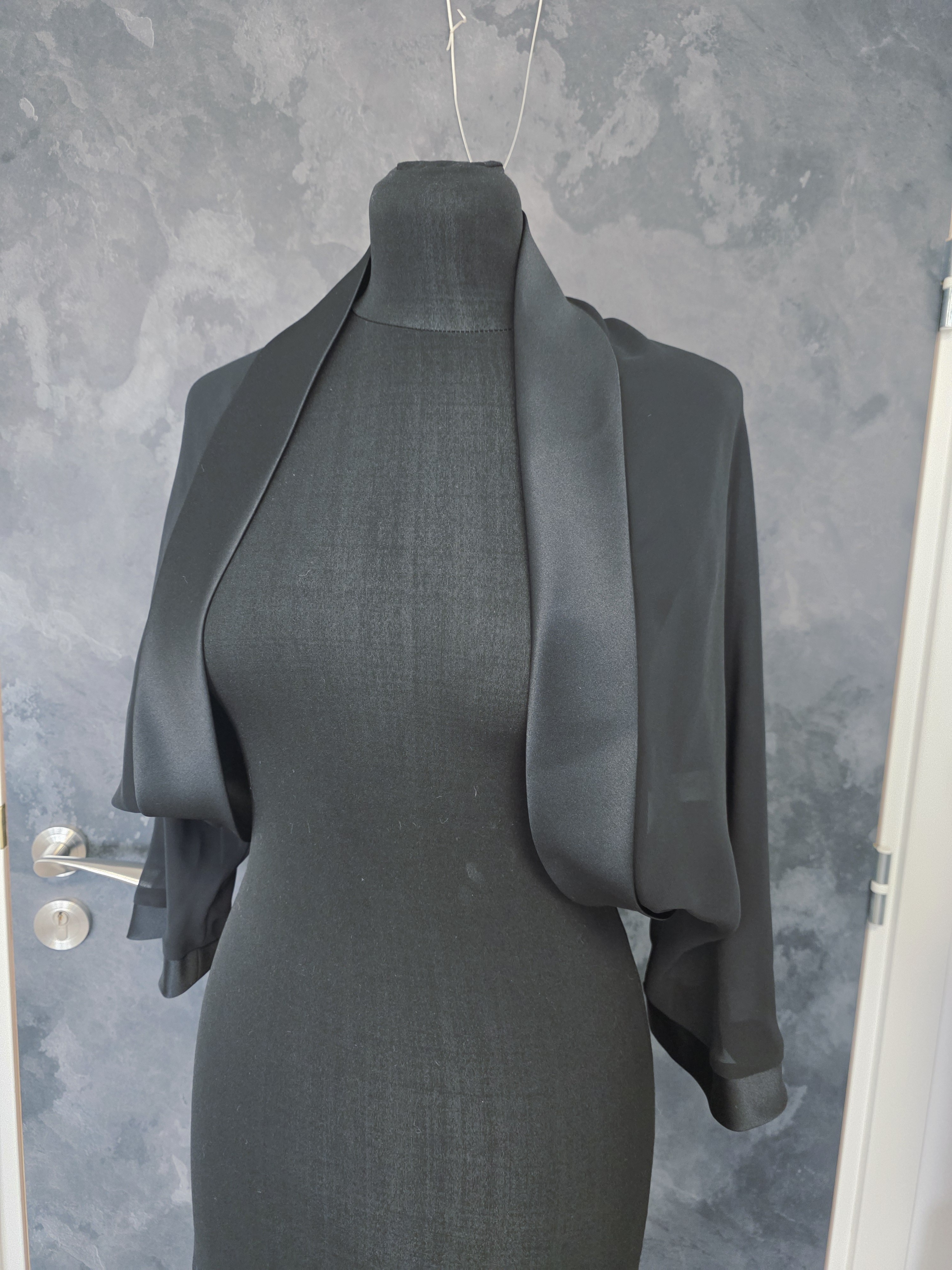 Boléro noir élégant en mousseline fluide, parfait pour sublimer une robe de soirée, une tenue de cérémonie ou une robe de mariée moderne.