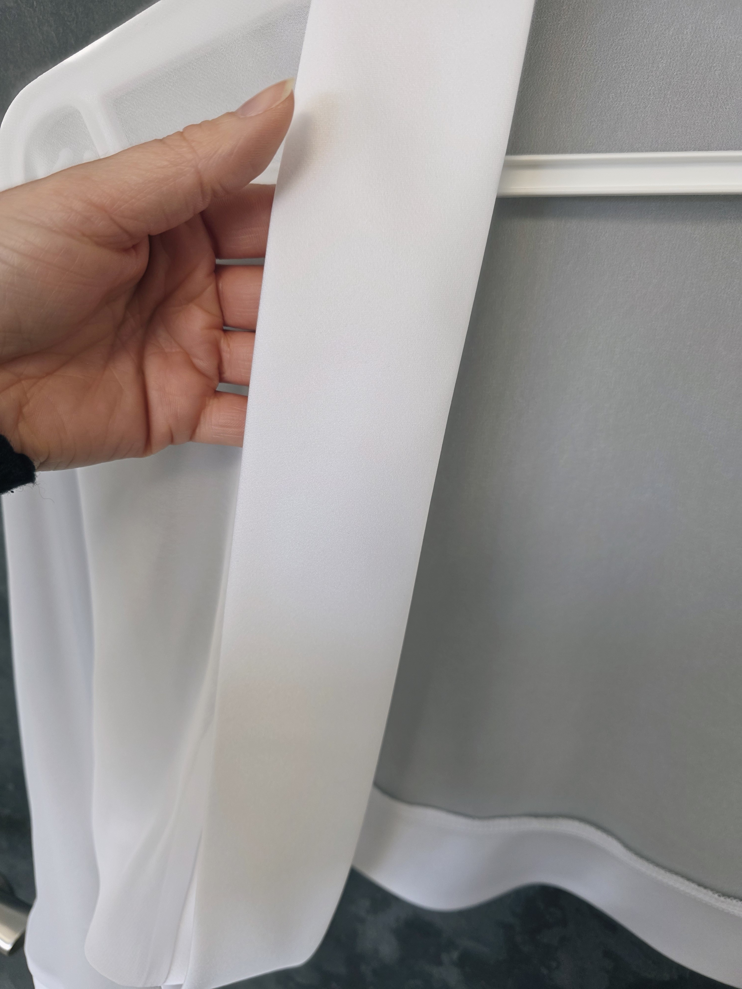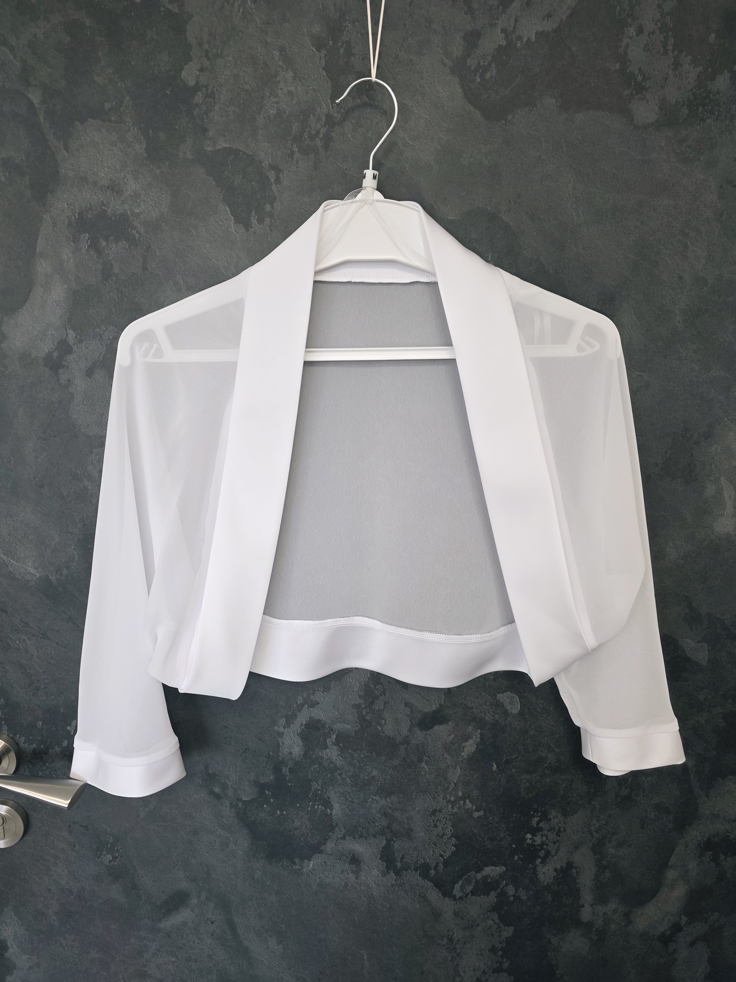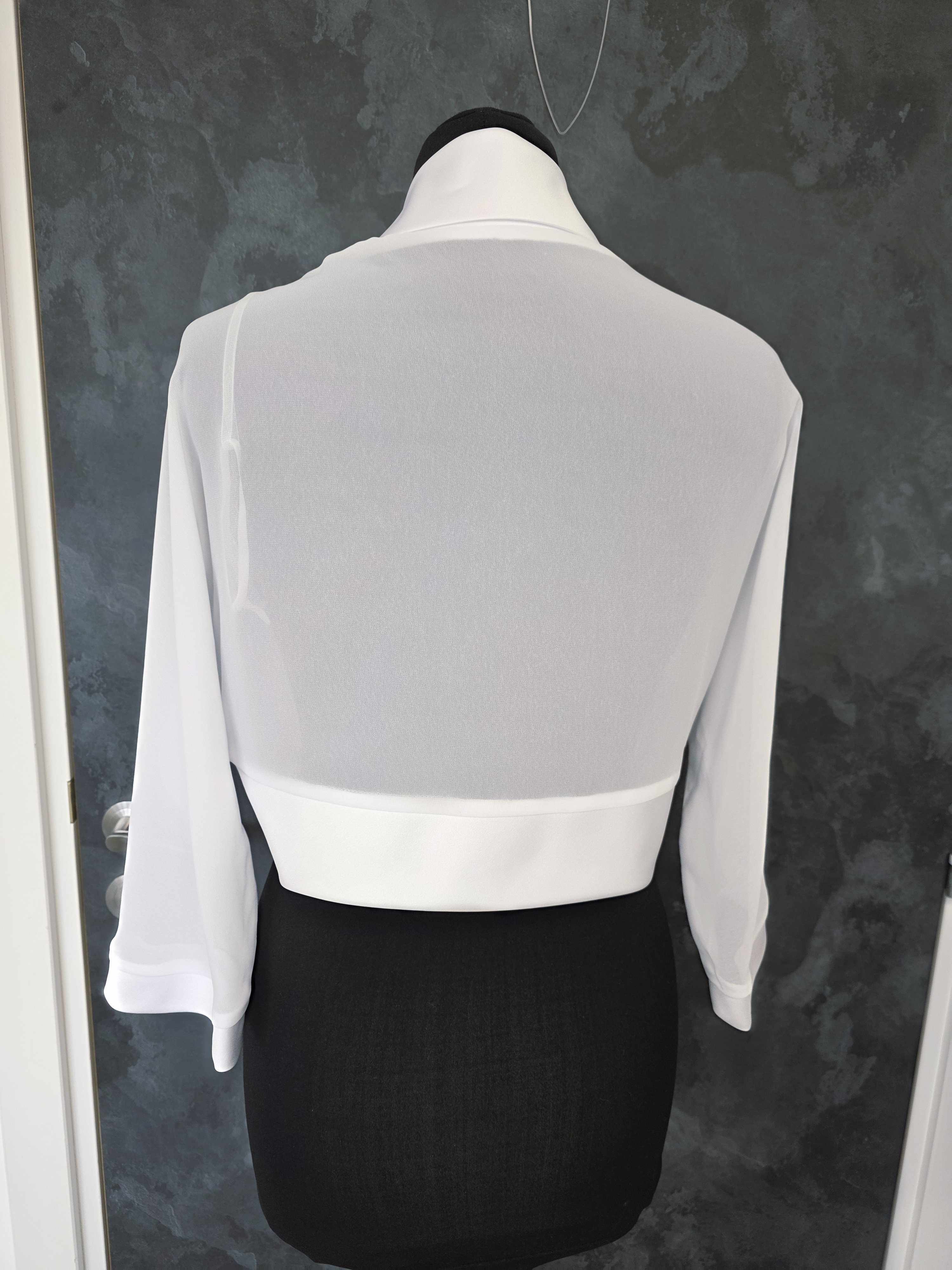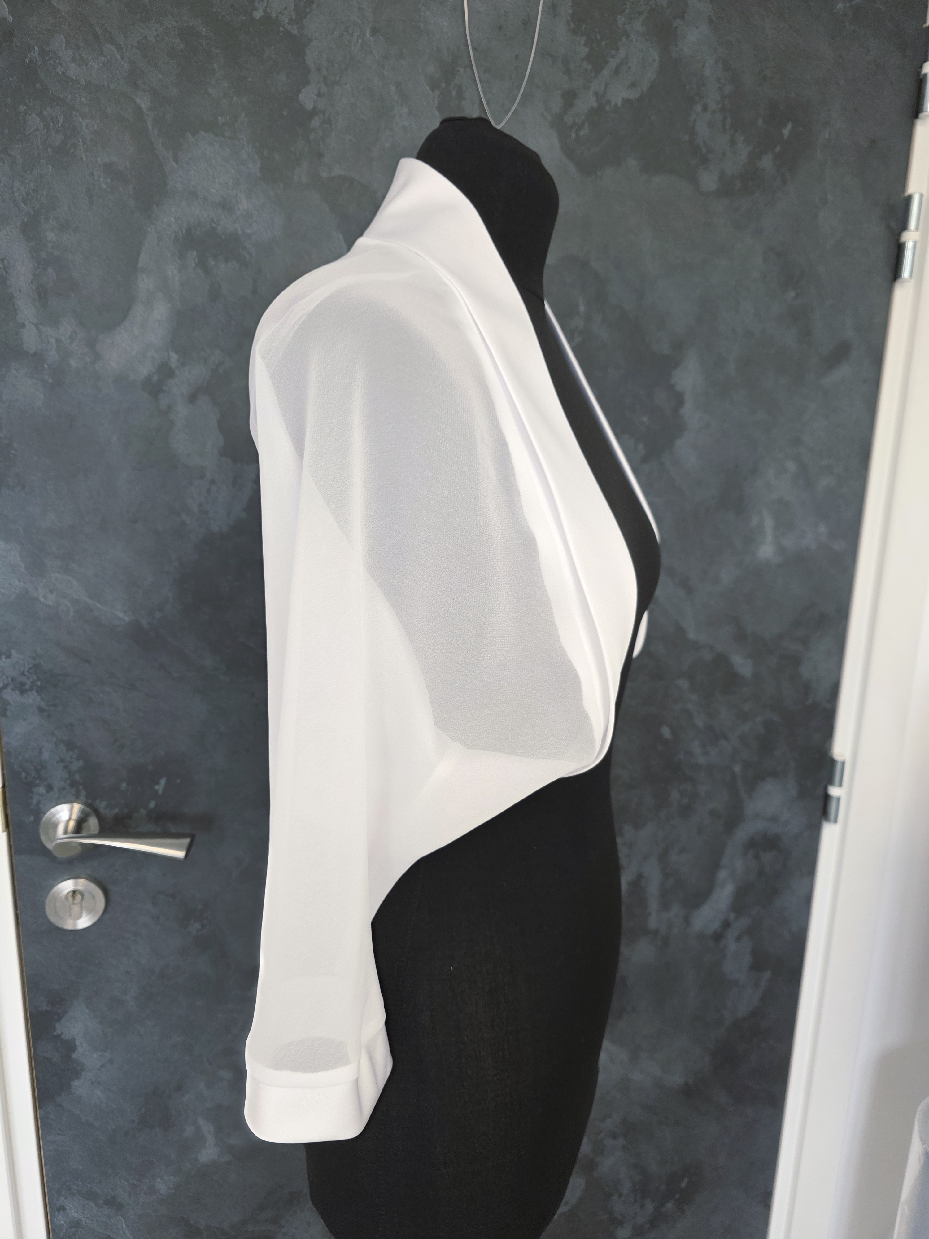 Boléro blanc élégant en mousseline légère, idéal pour accompagner une robe de mariée, une tenue de cérémonie ou une robe d’été habillée.