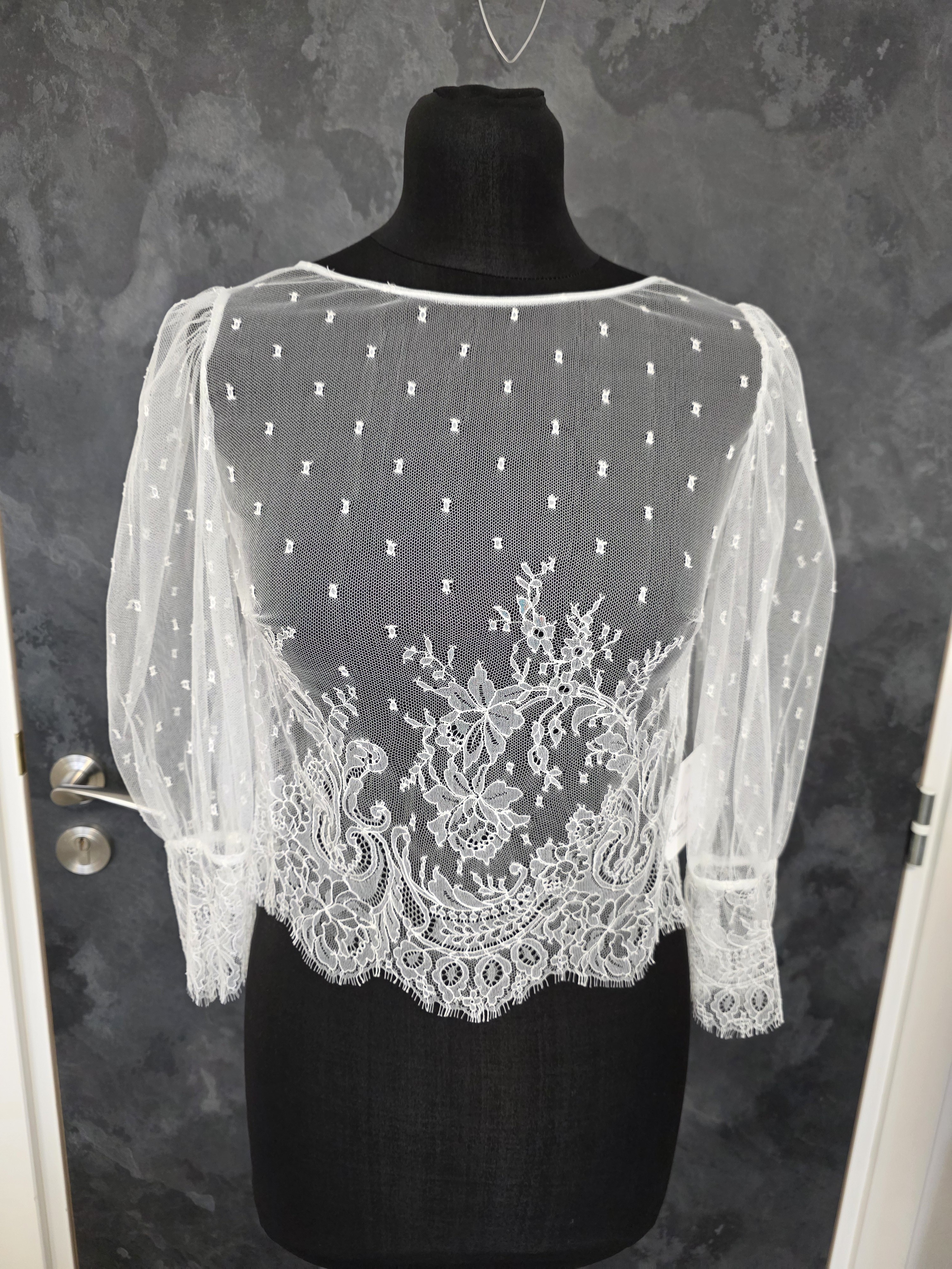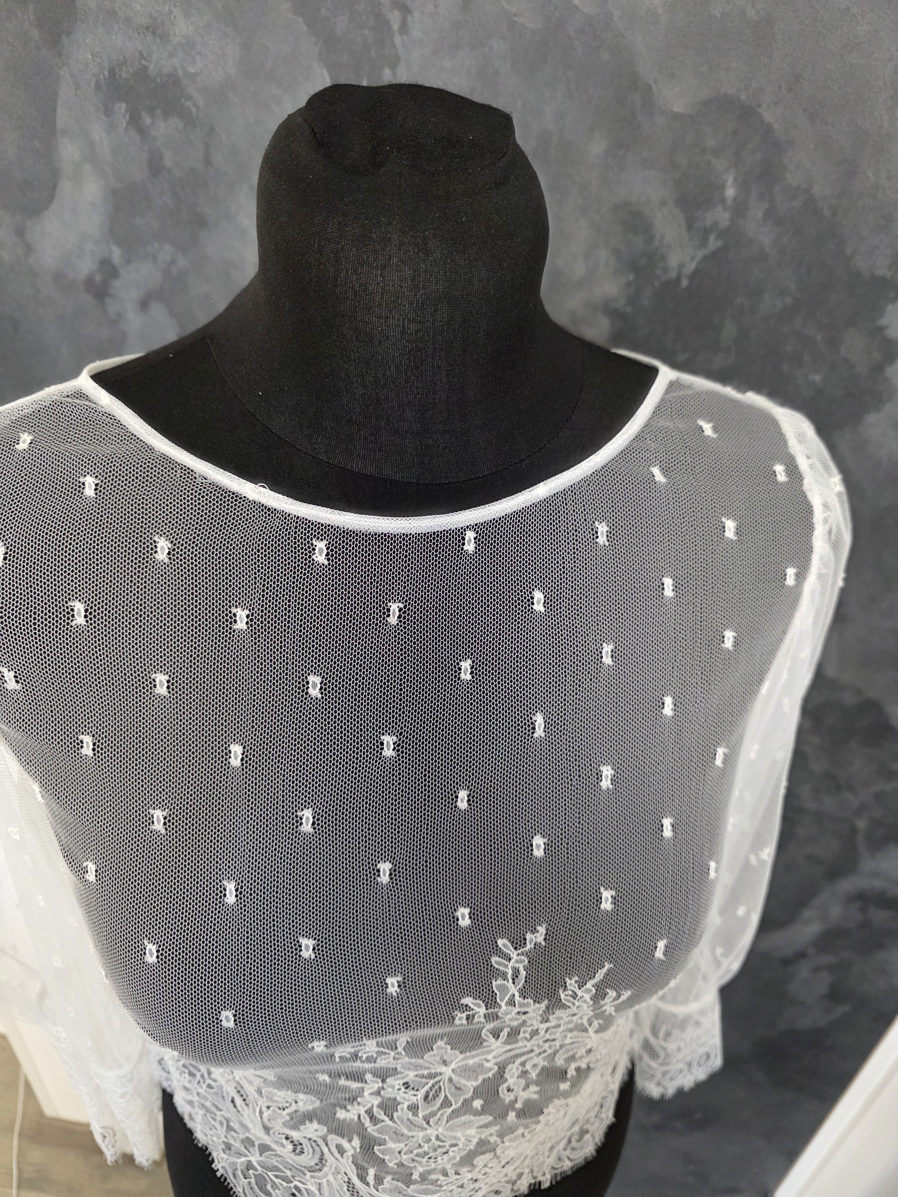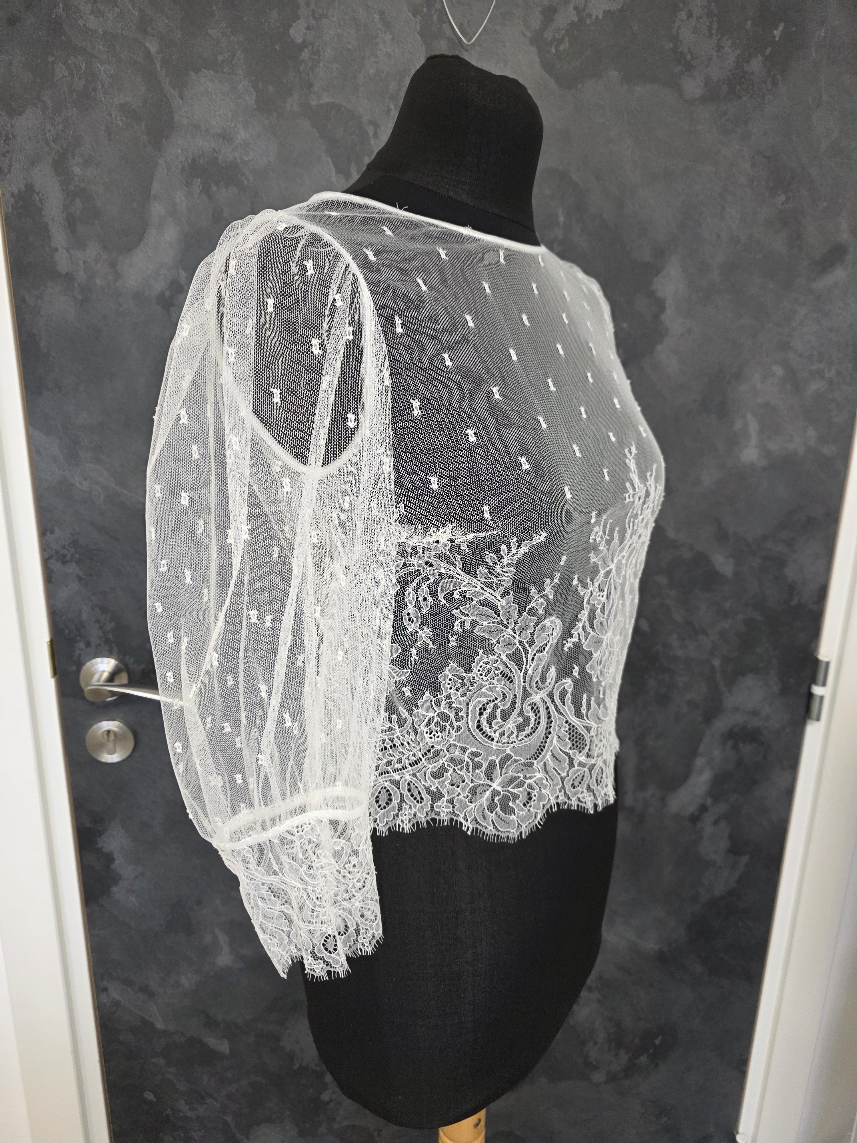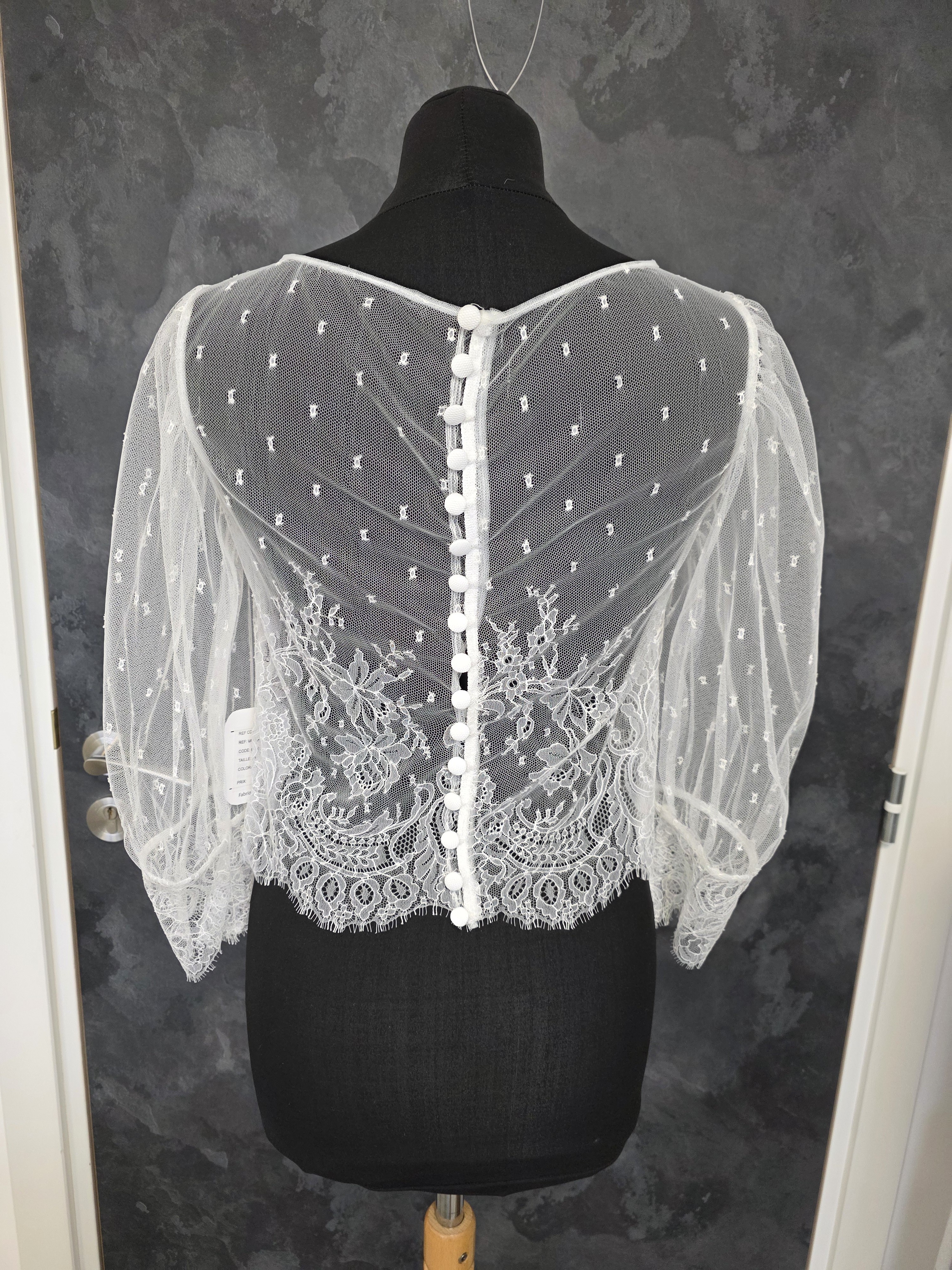 Top pour robe de mariée en ivoire clair, confectionné en dentelle française et fabriqué en France.