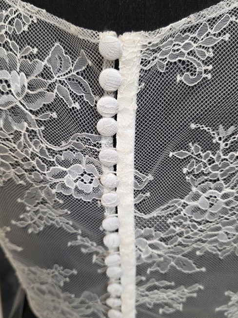 Ce modèle séduit par sa transparence subtile, ses motifs floraux légers et son dos entièrement boutonné qui apporte une touche romantique et couture.