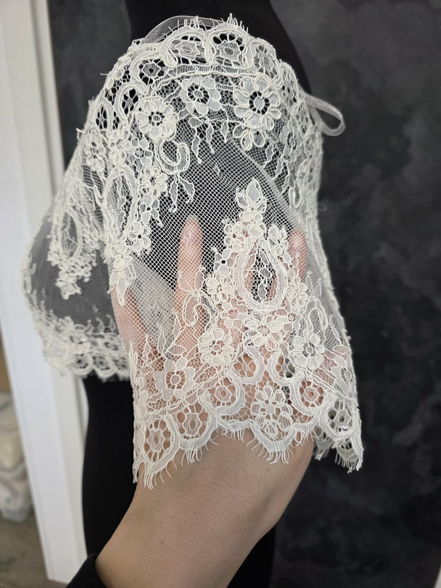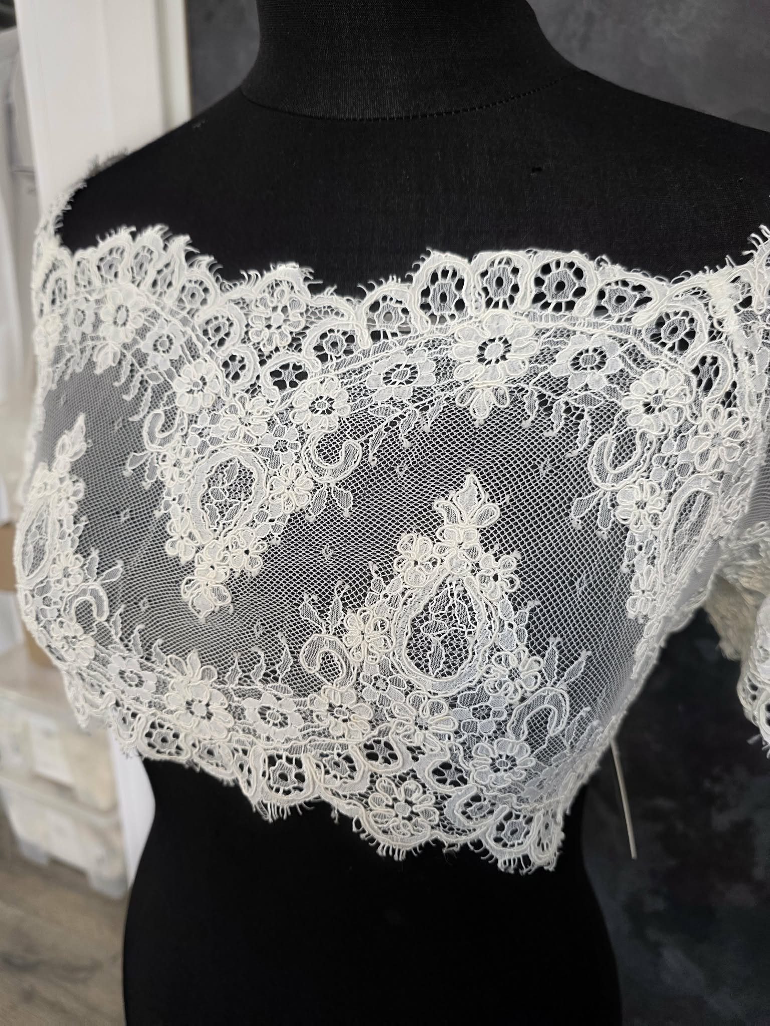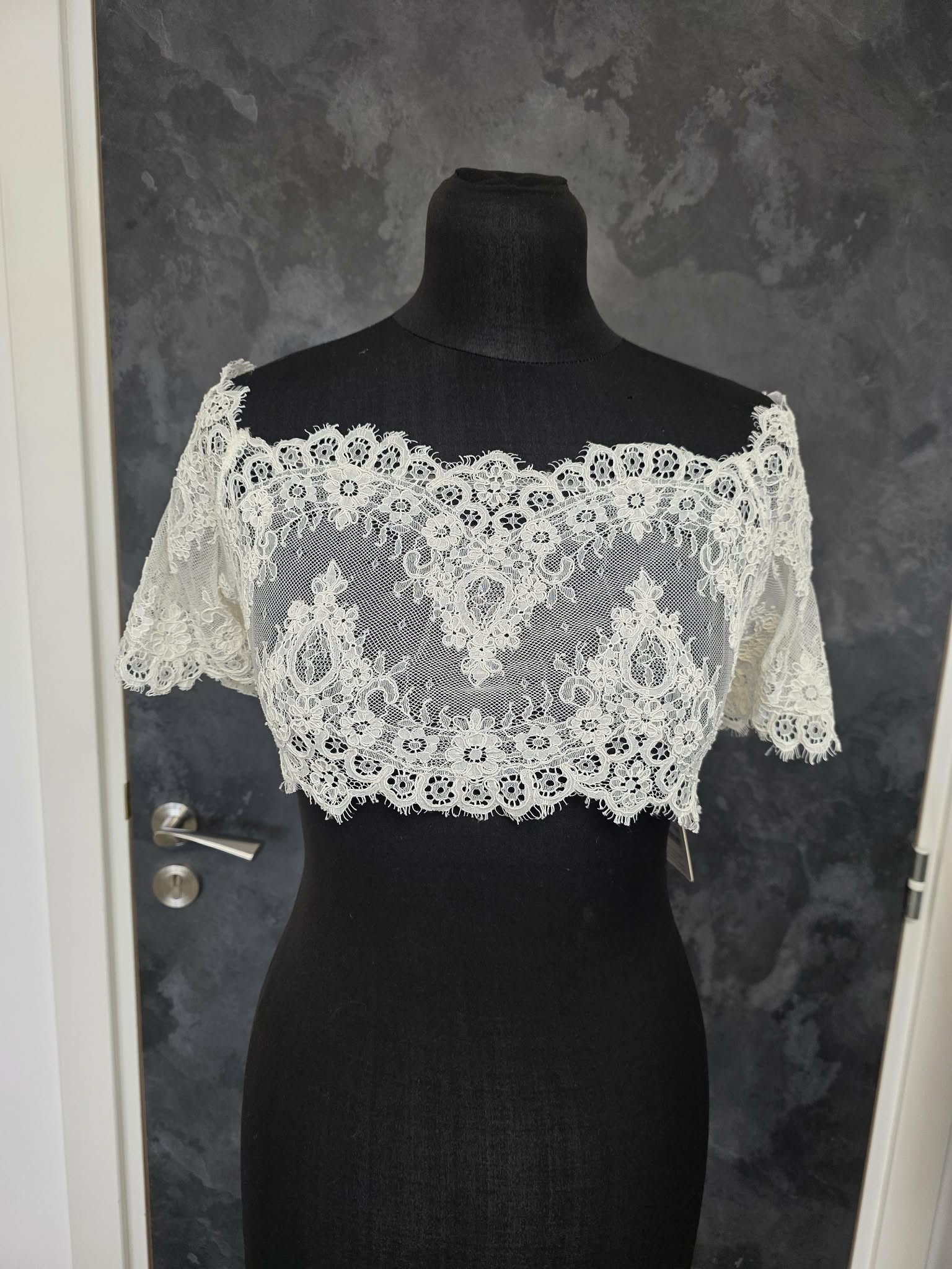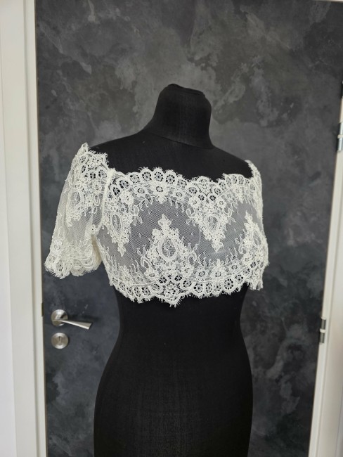Délicat top de mariée en dentelle ivoire, finement brodée de motifs floraux élégants.