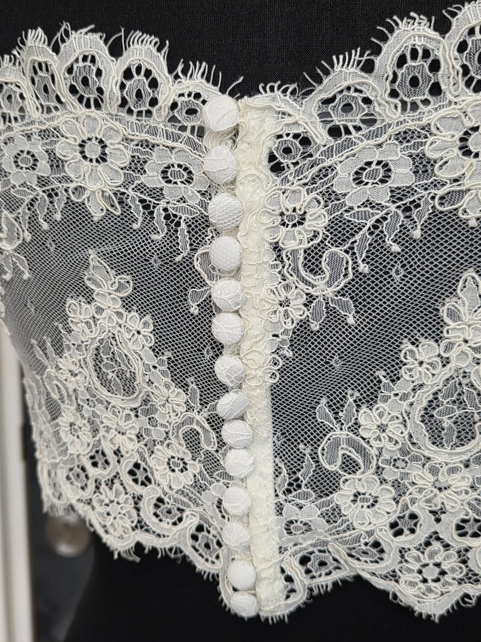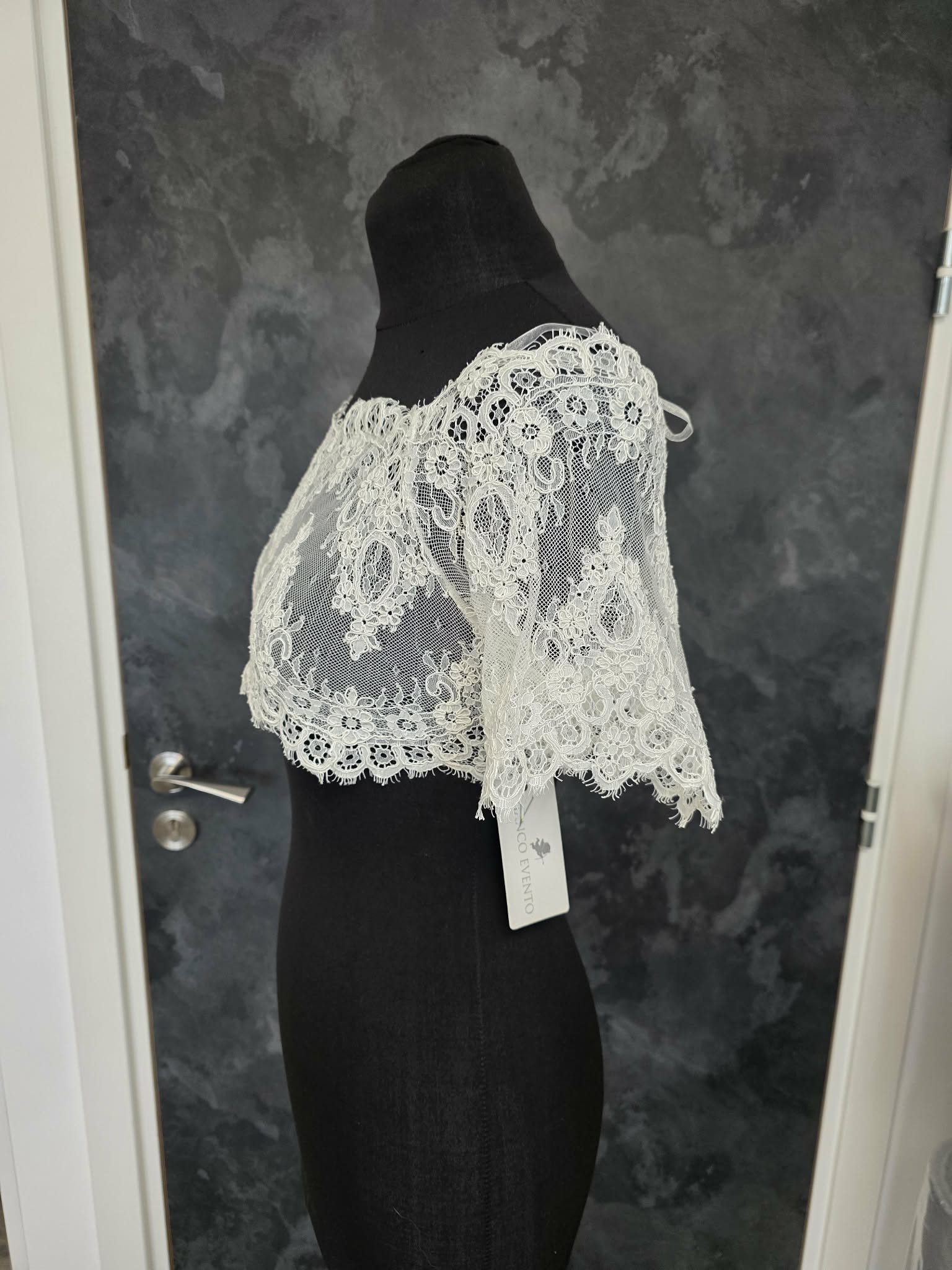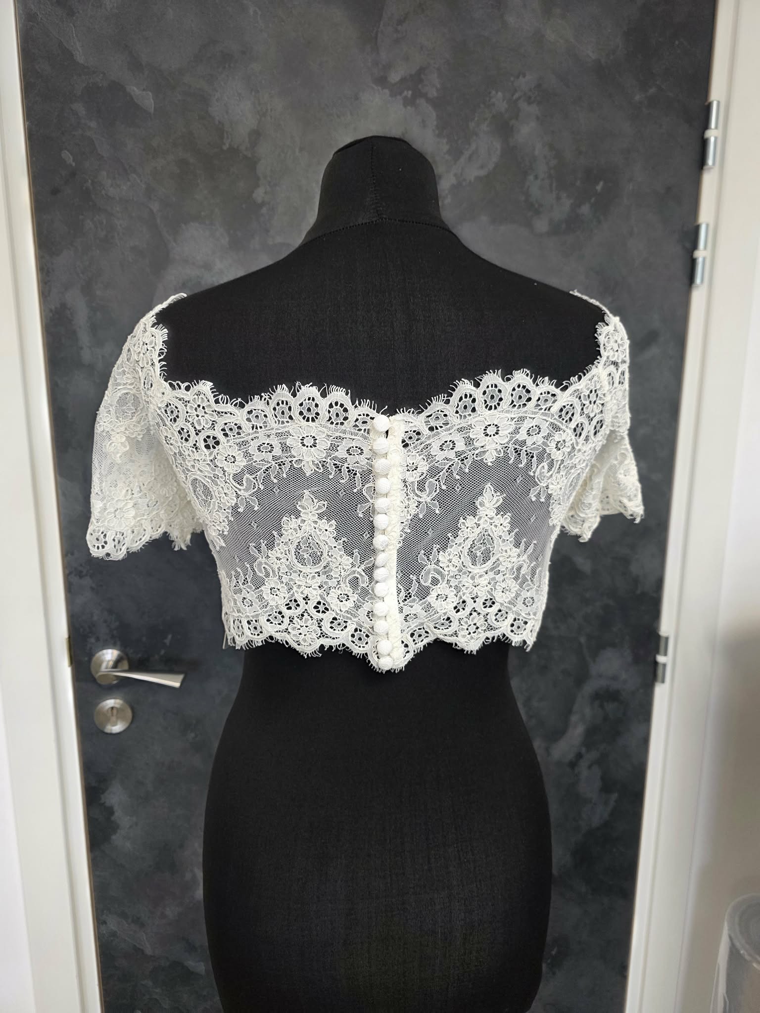Délicat top de mariée en dentelle ivoire, finement brodée de motifs floraux élégants.