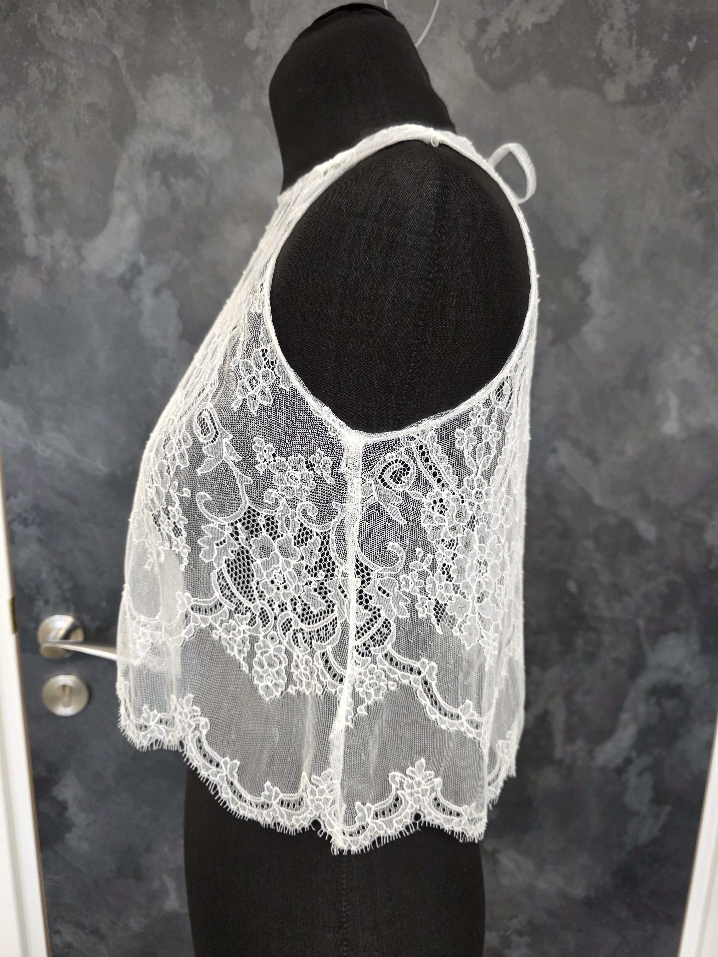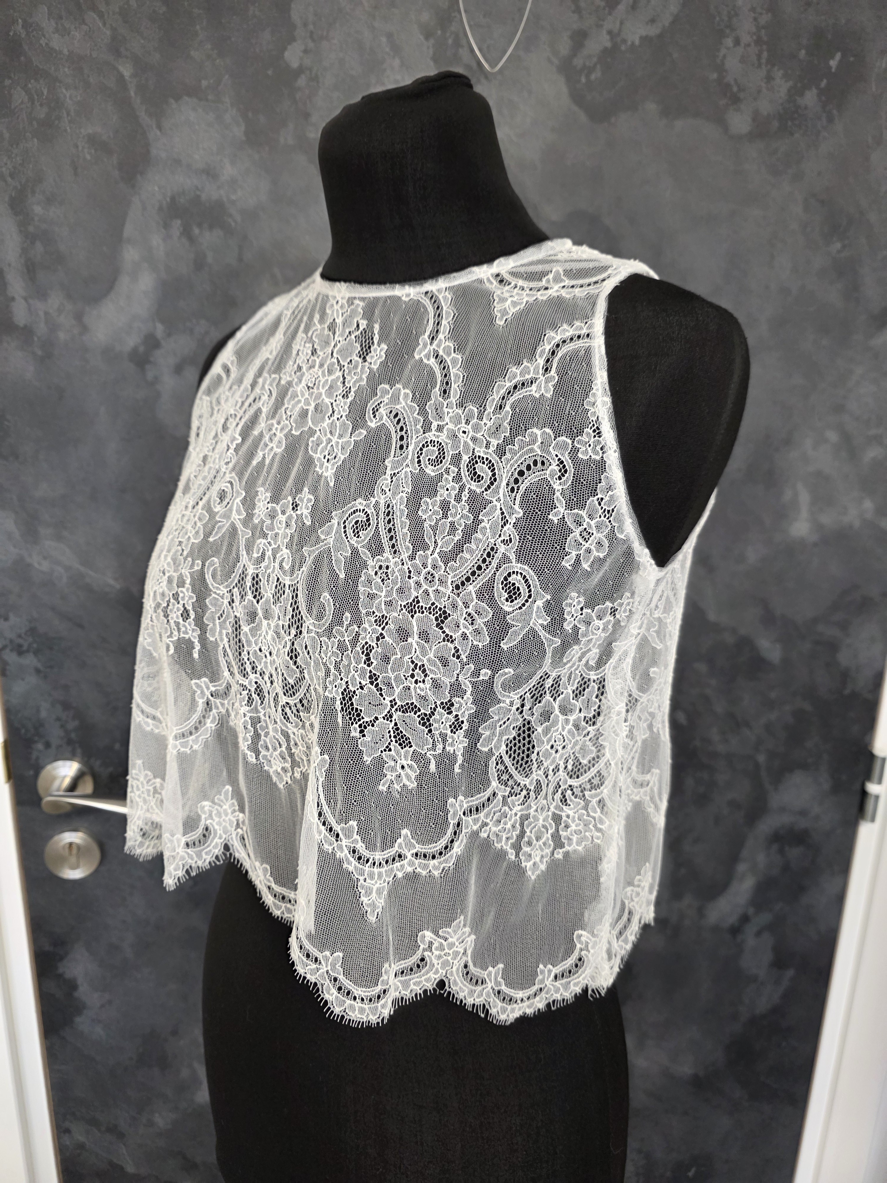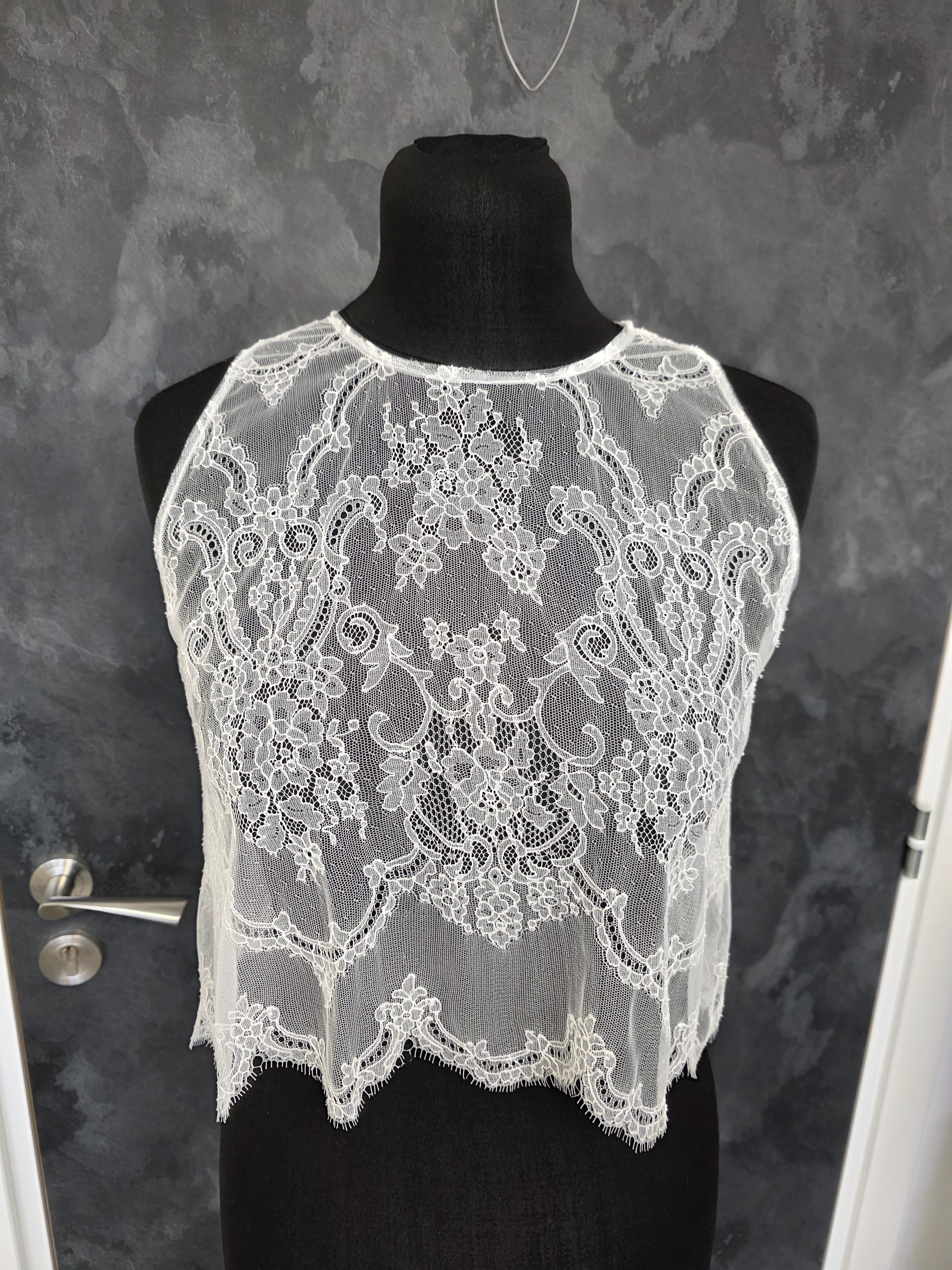Top de mariée en dentelle fine ivoire clair, aux motifs floraux délicats et à la finition subtilement festonnée.
