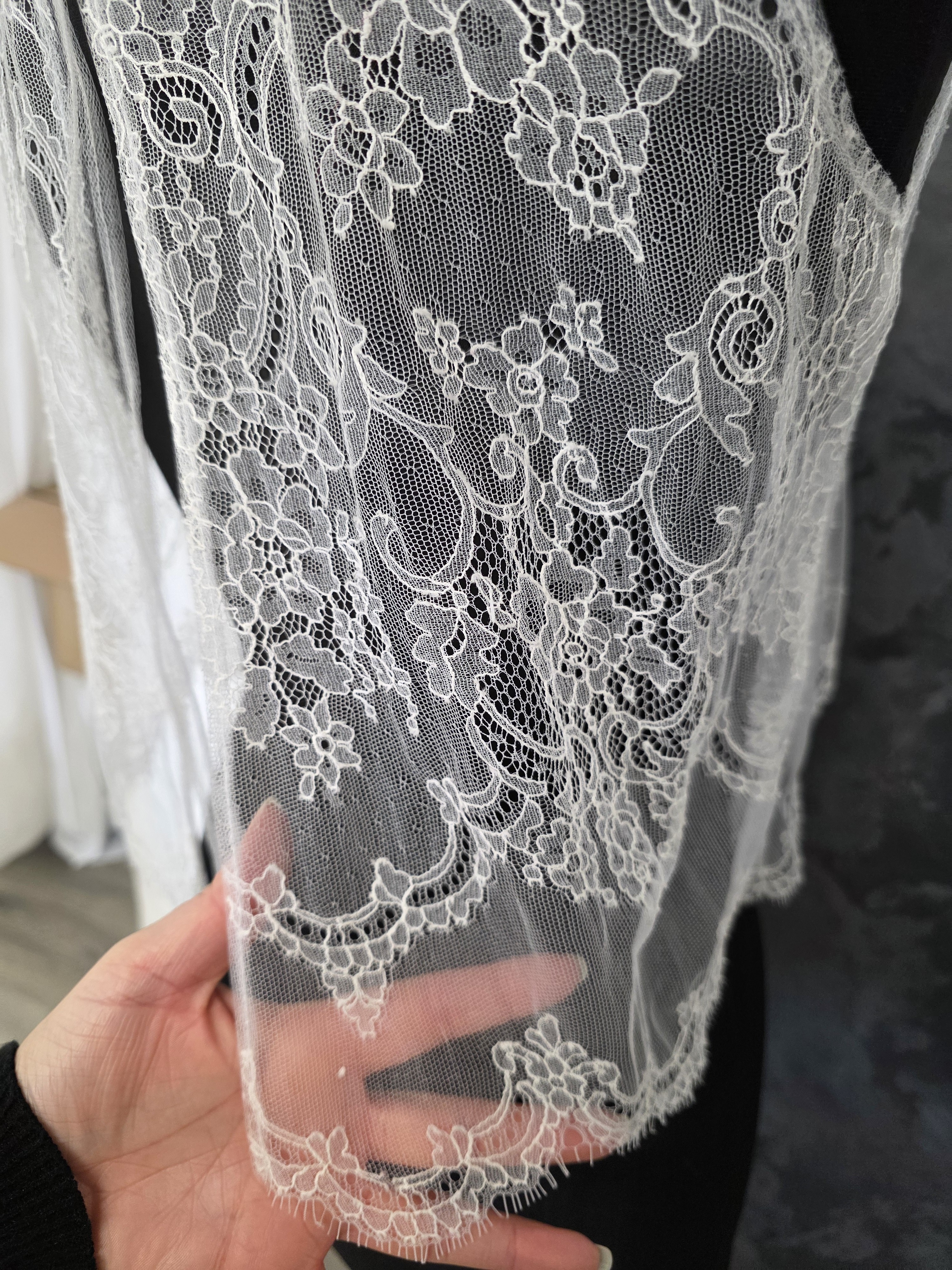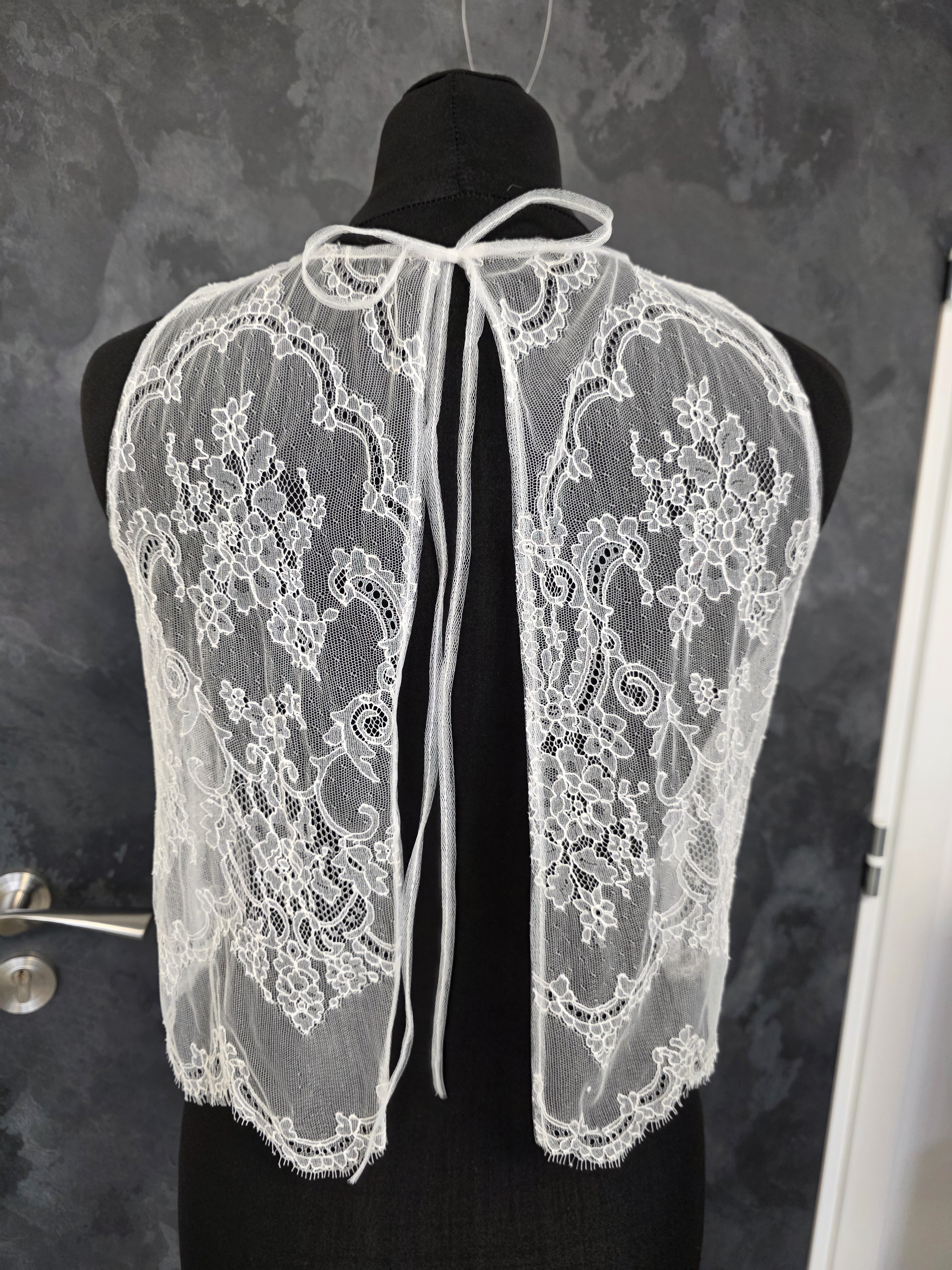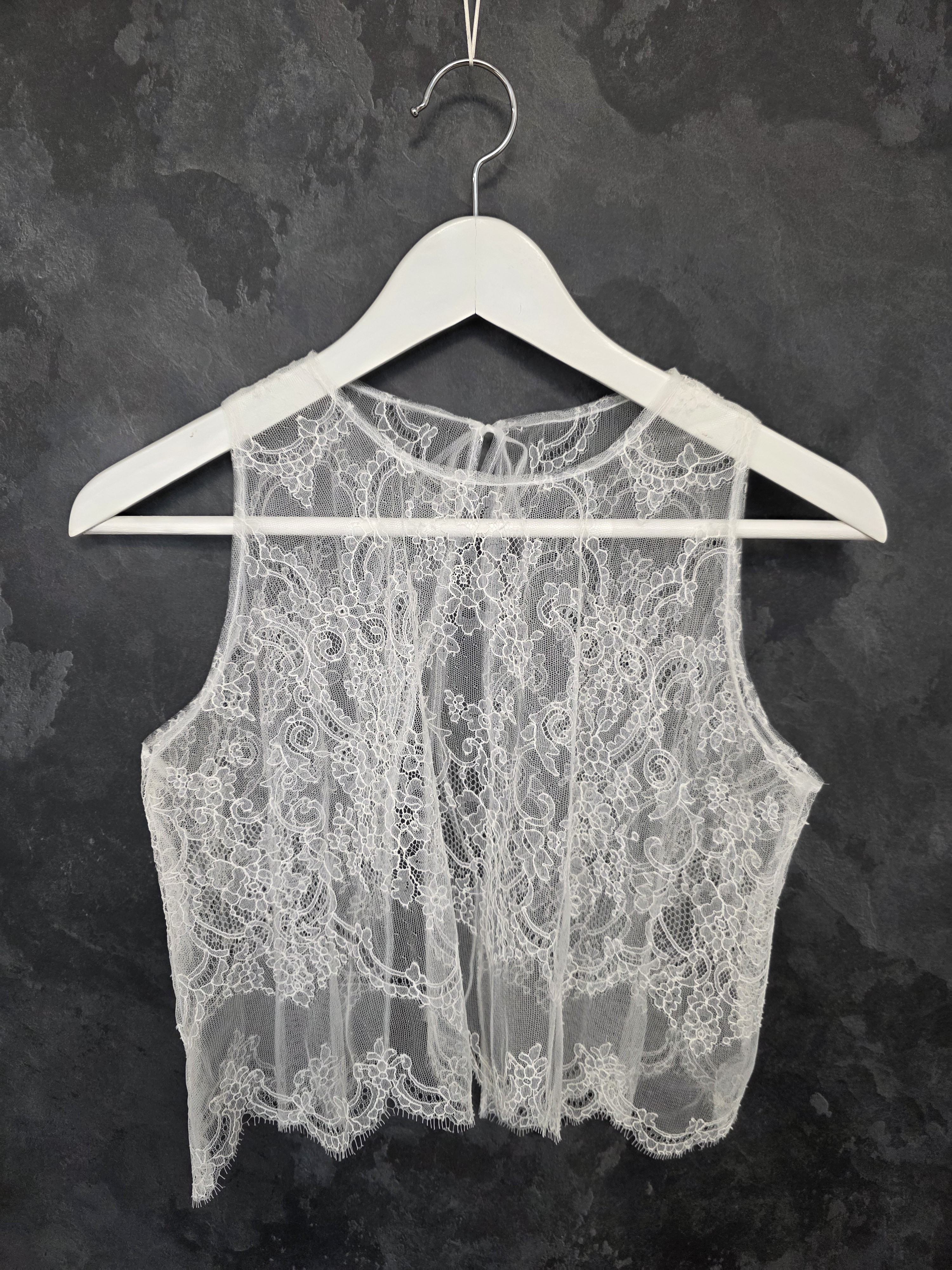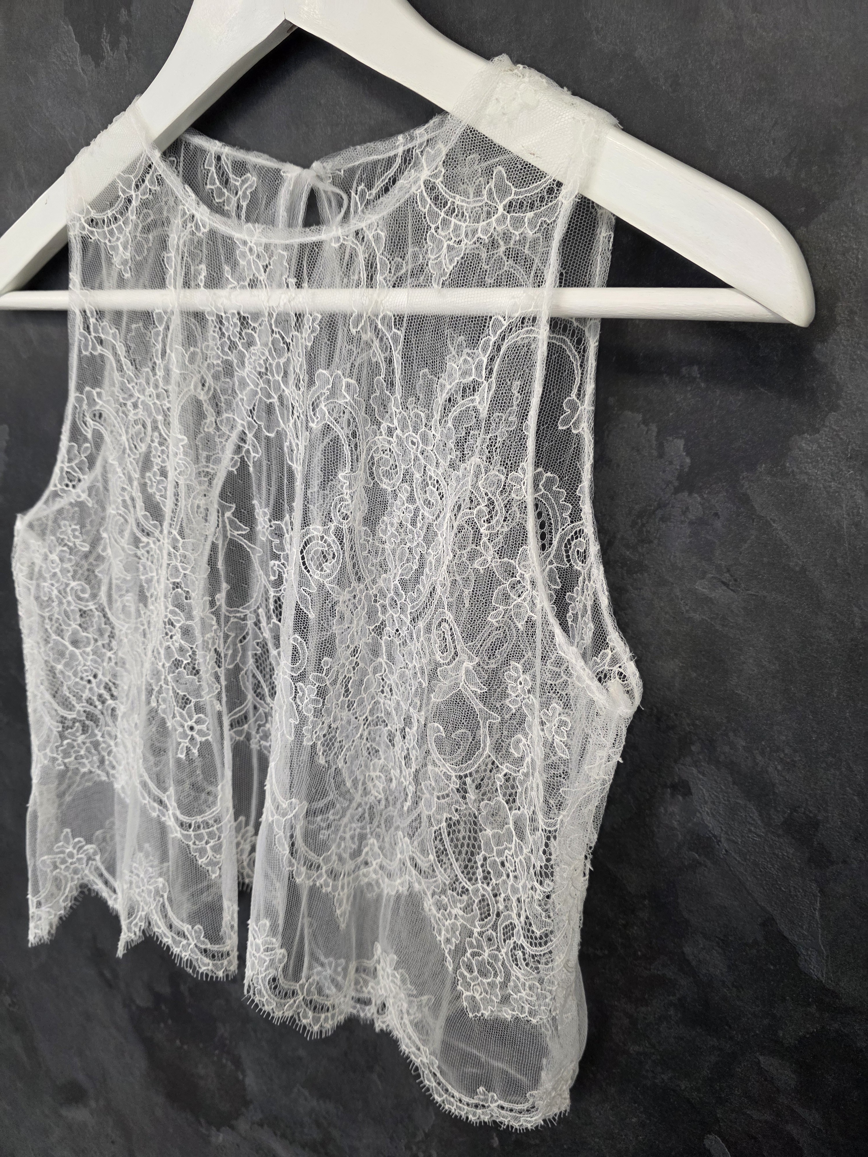 Top de mariée en dentelle fine ivoire clair, aux motifs floraux délicats et à la finition subtilement festonnée.
