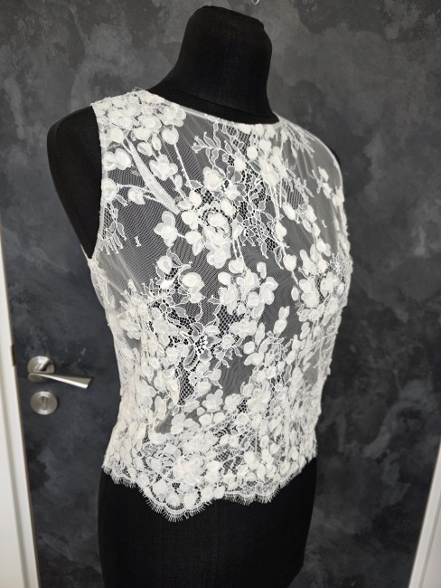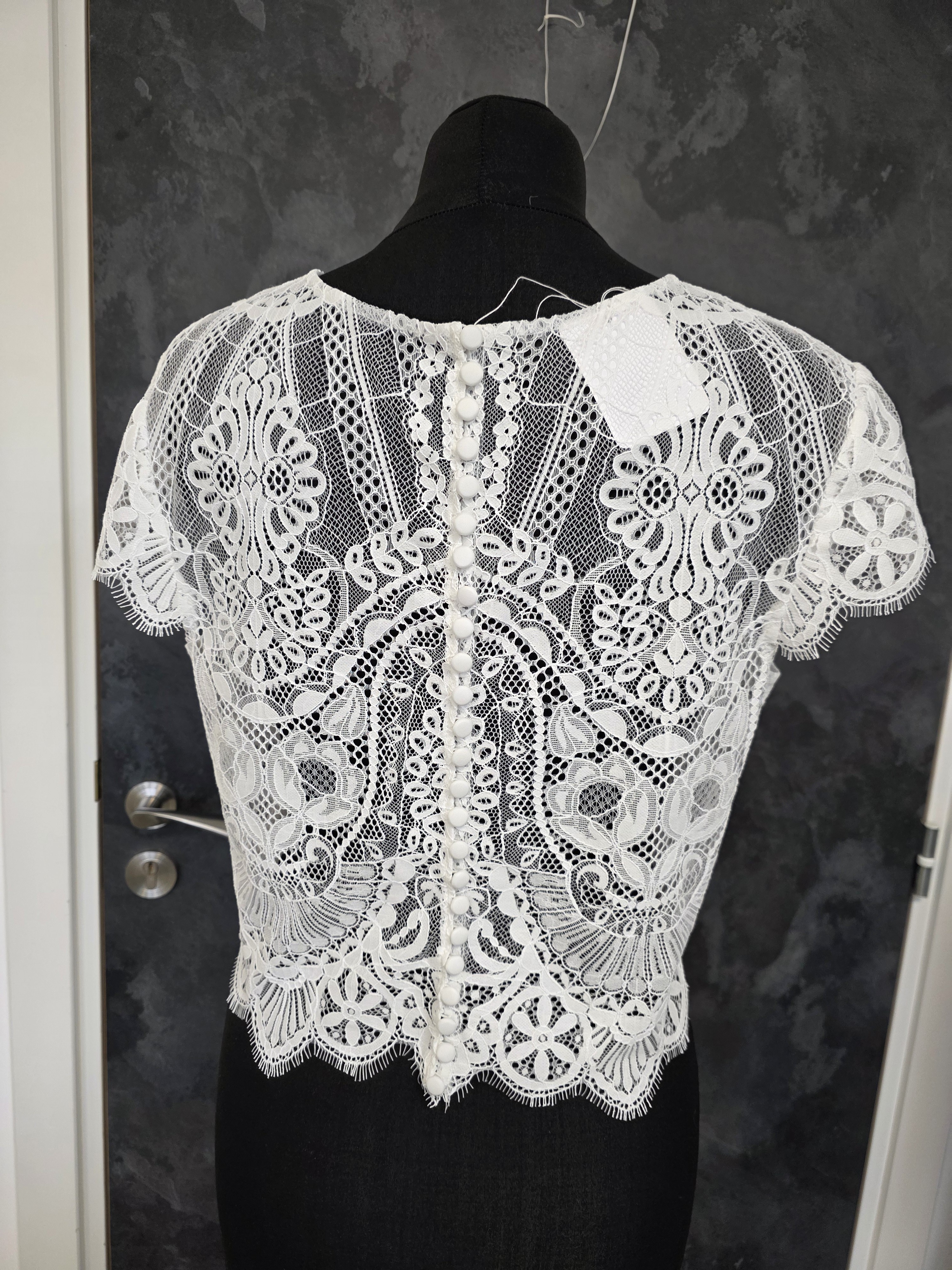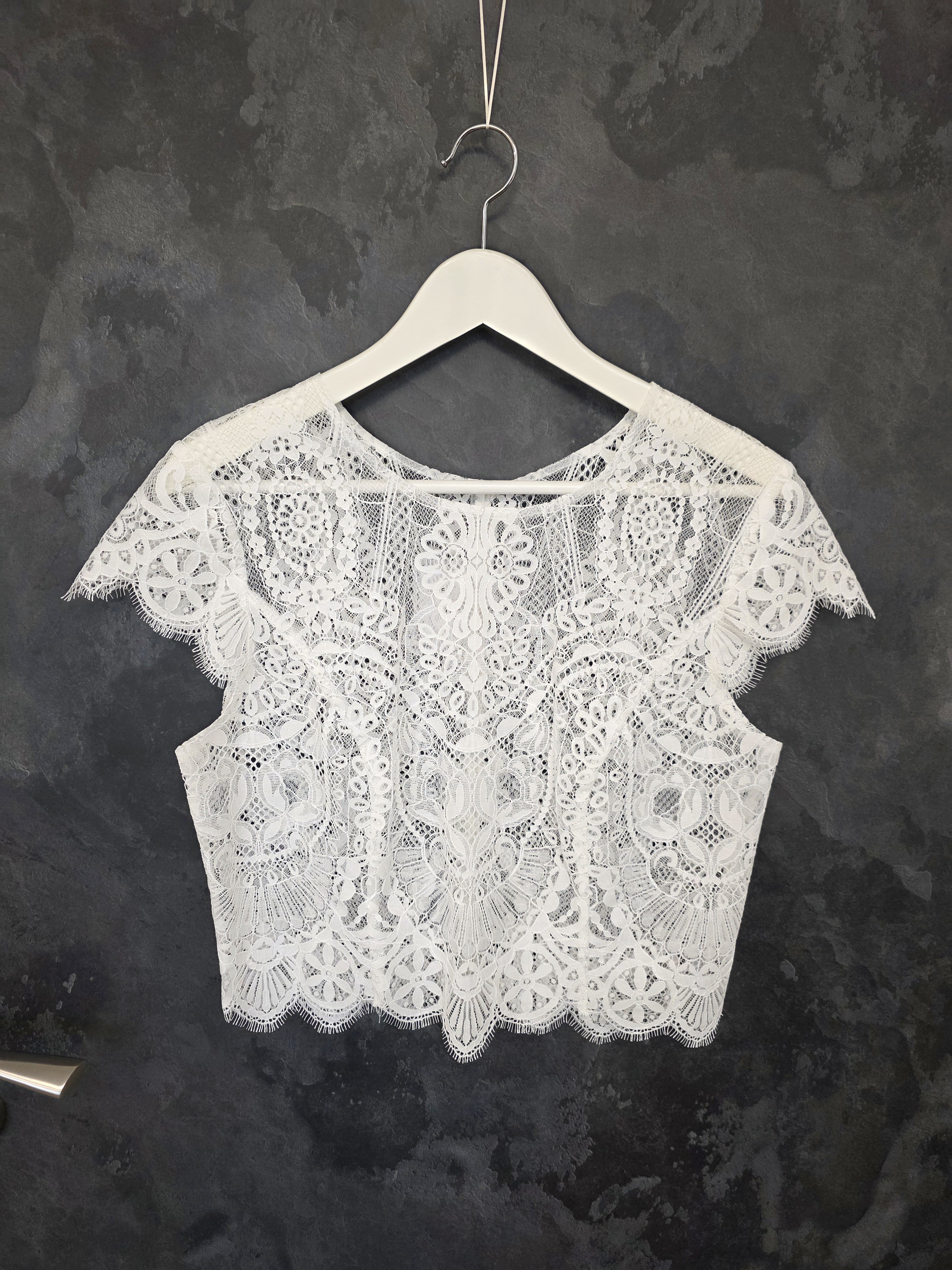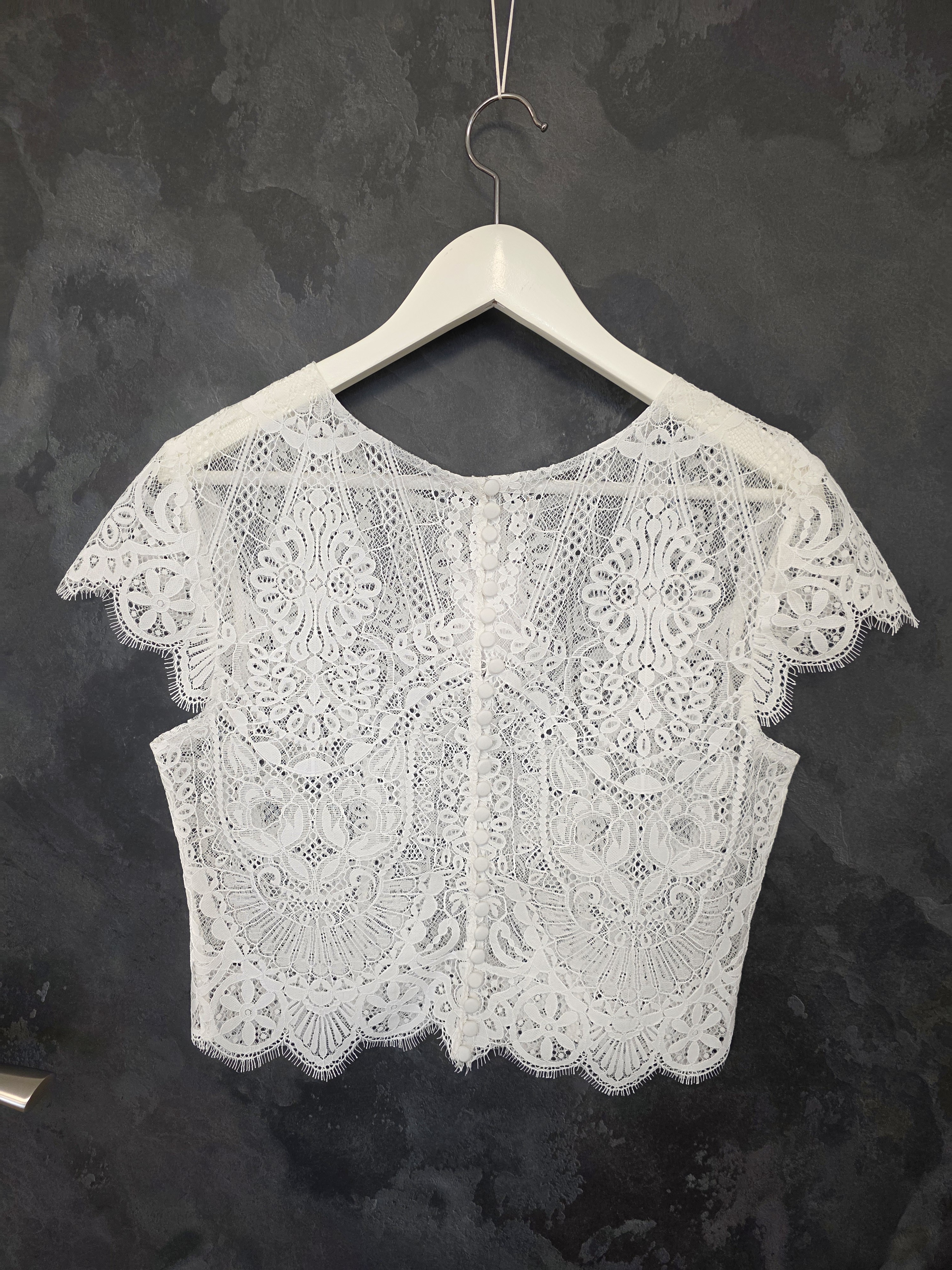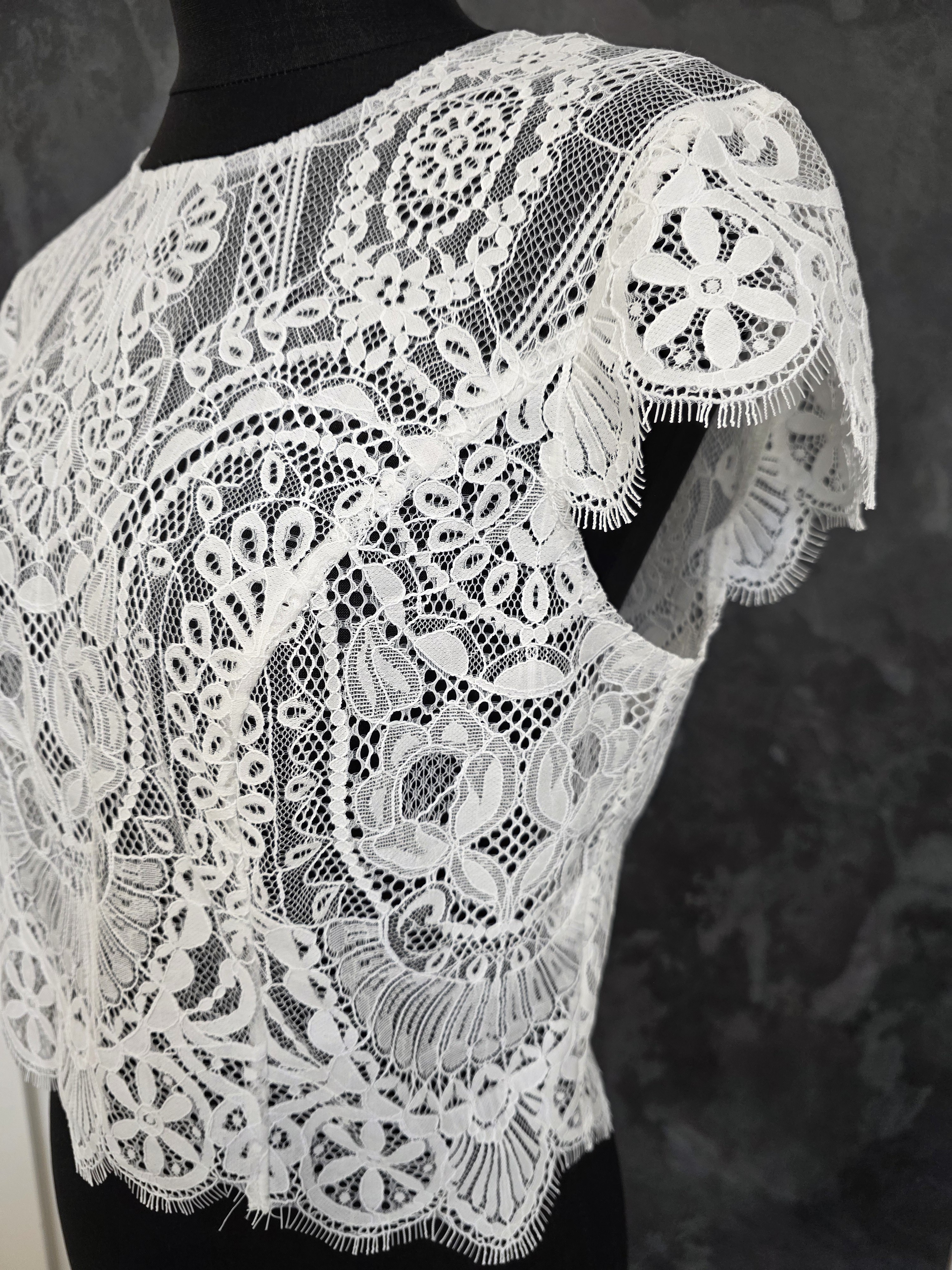 Élégant top de mariée en dentelle ivoire, aux motifs graphiques et floraux finement travaillés.