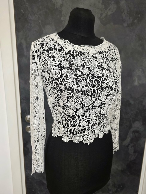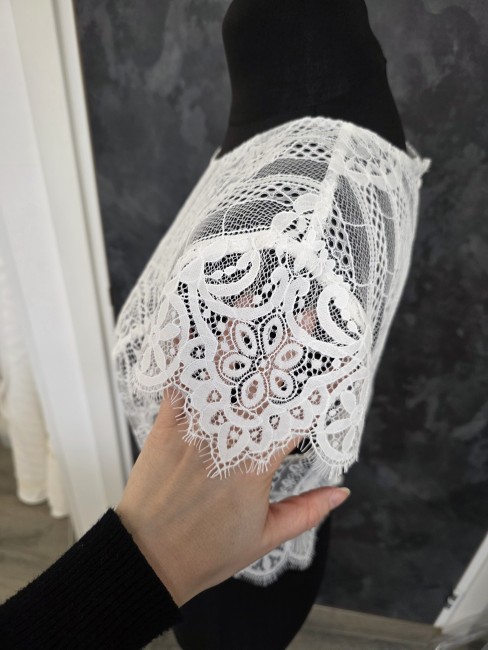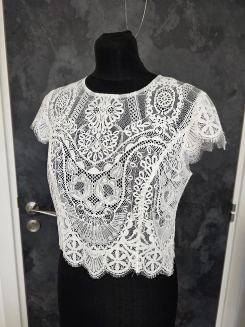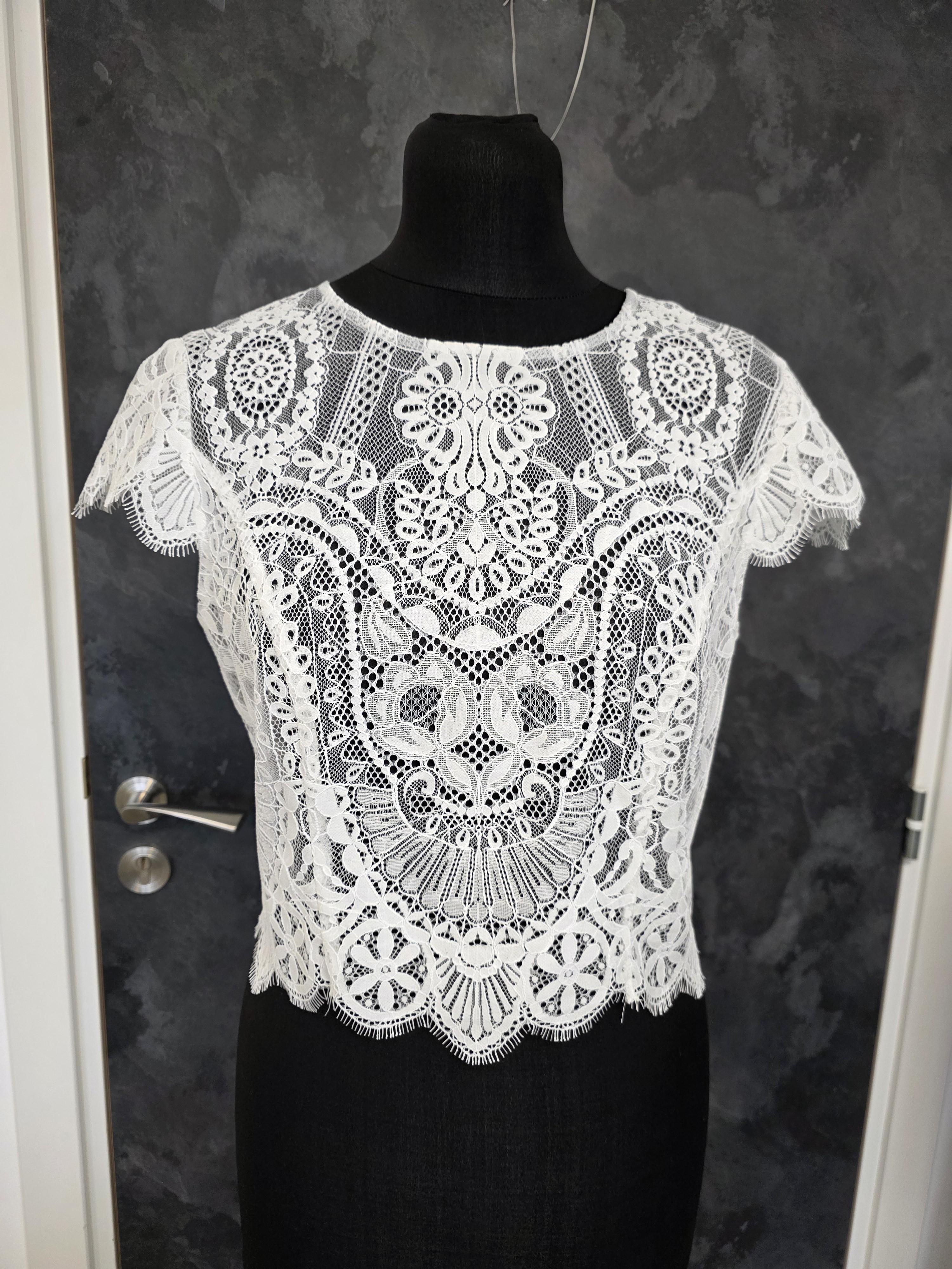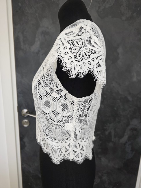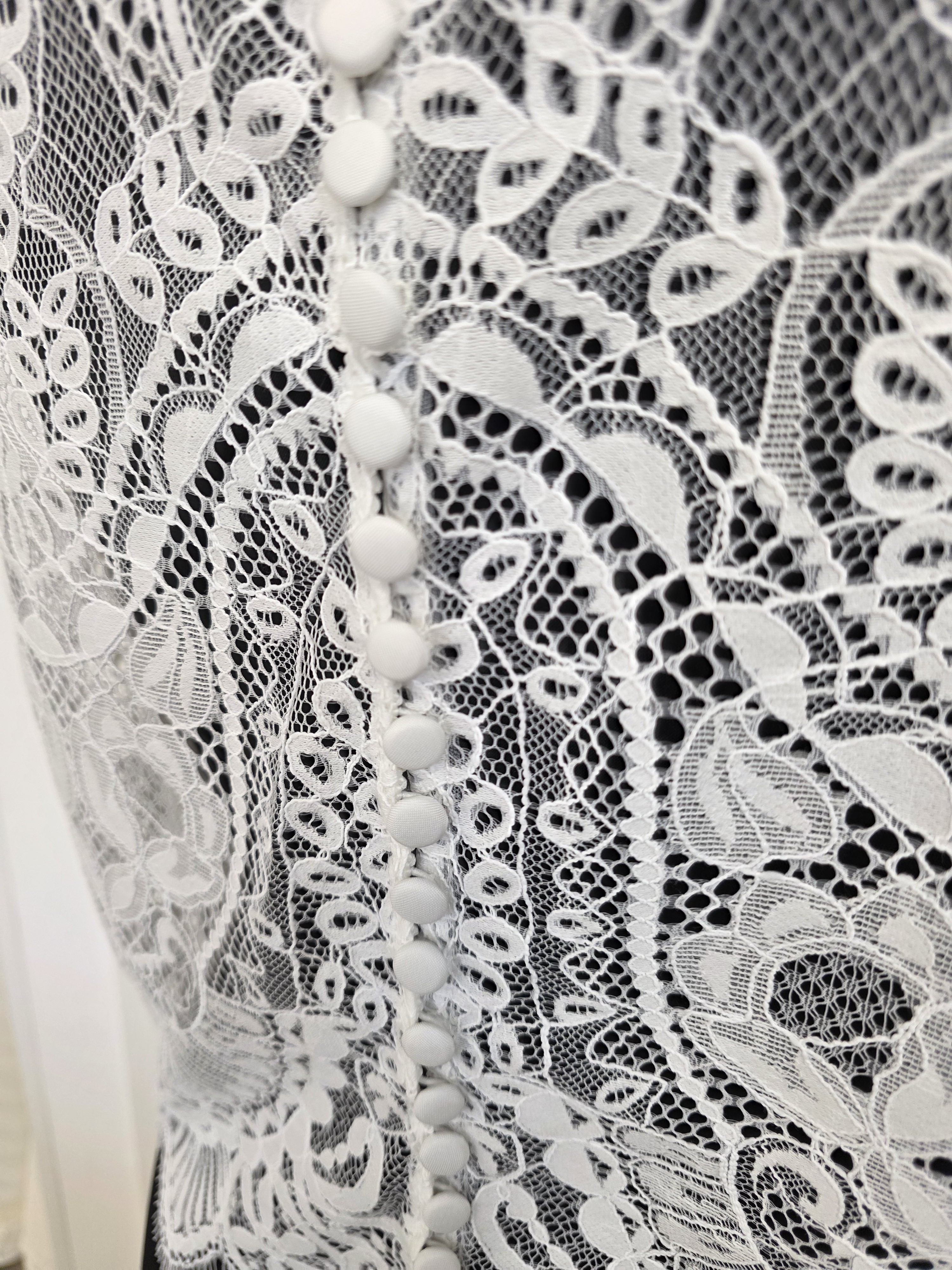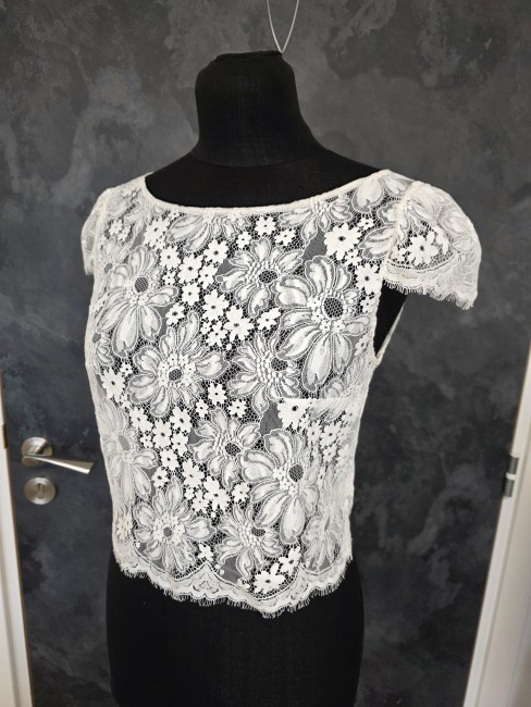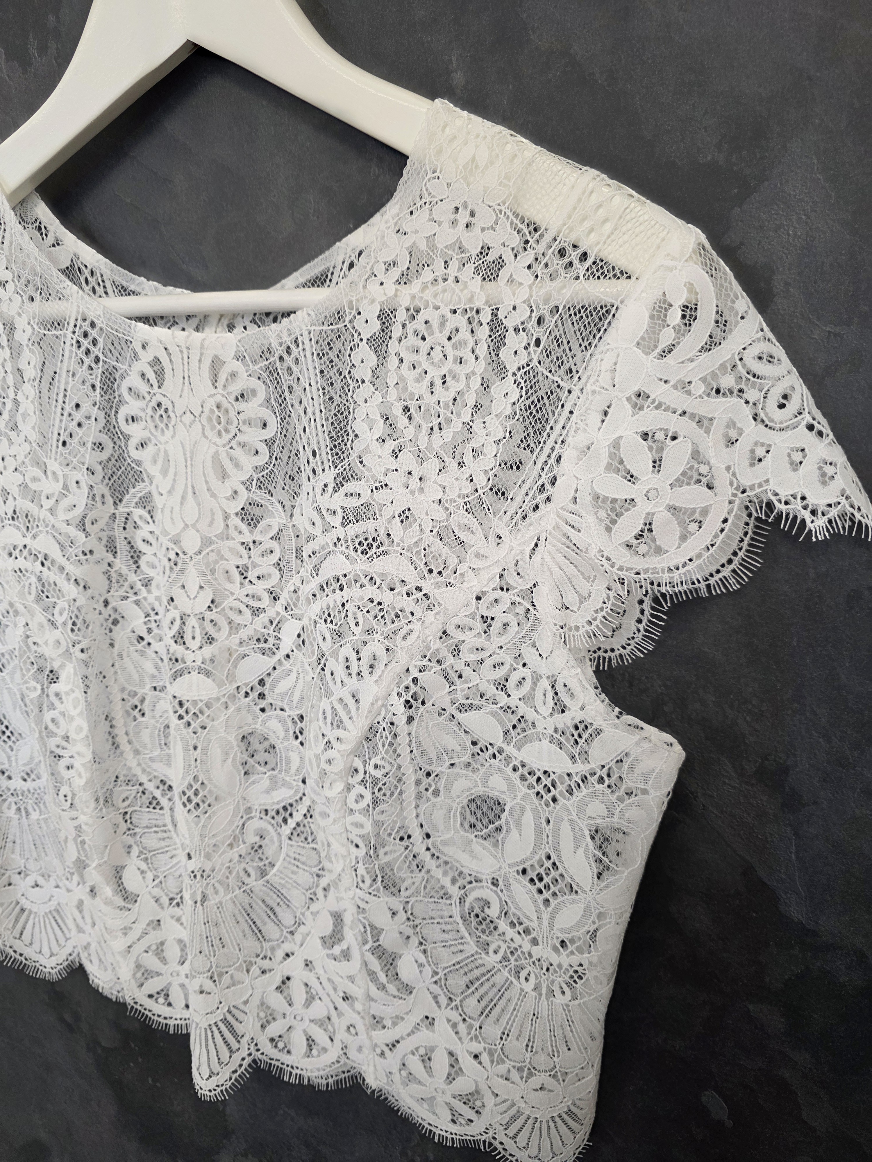 Élégant top de mariée en dentelle ivoire, aux motifs graphiques et floraux finement travaillés.