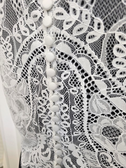 Le dos est sublimé par une rangée de petits boutons recouverts, pour une finition couture raffinée et romantique.